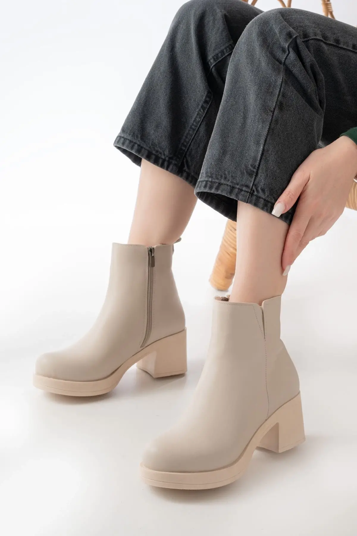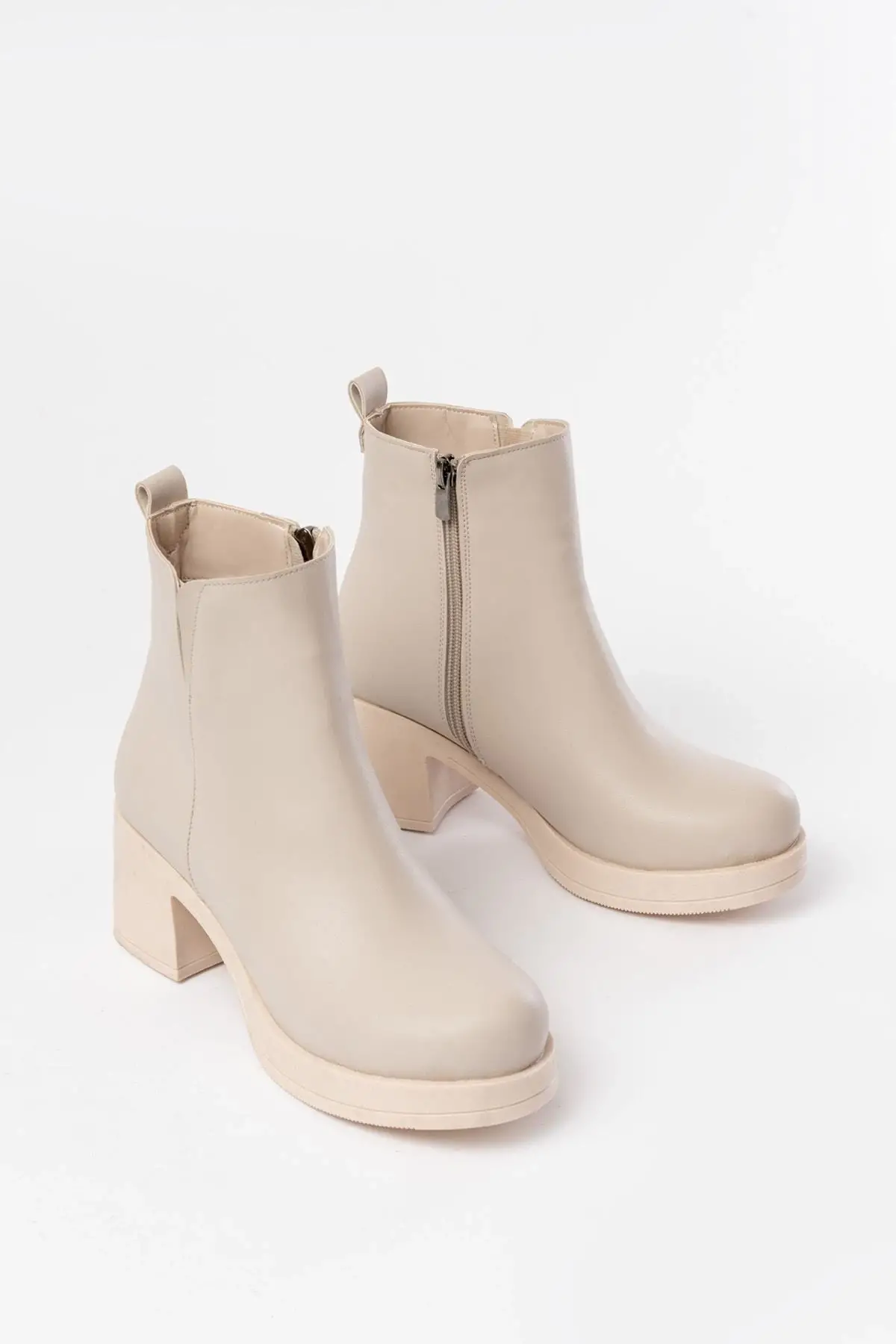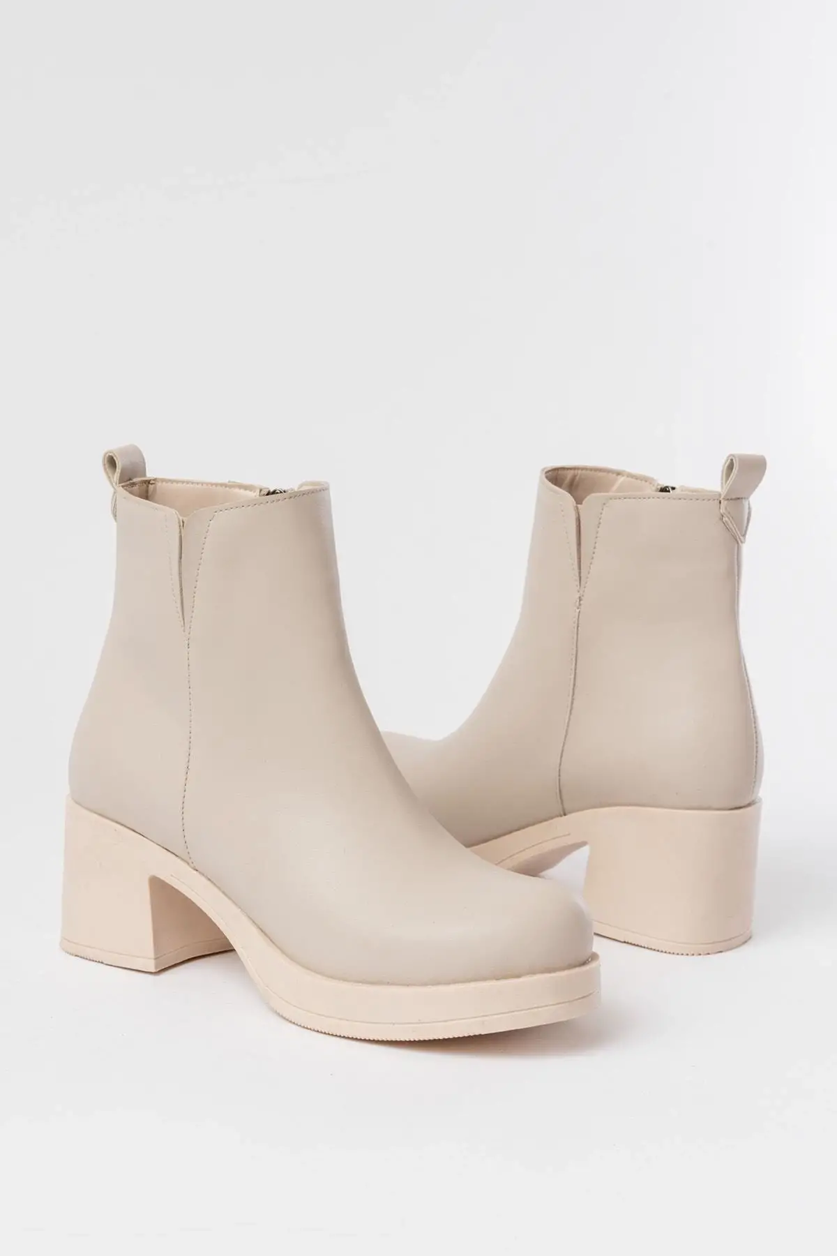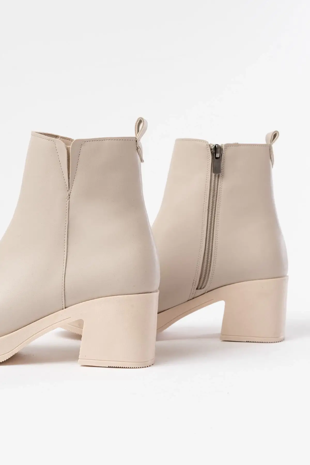 Bej Lastikli Fermuarlı Kalın Topuklu Günlük Kadın Bot