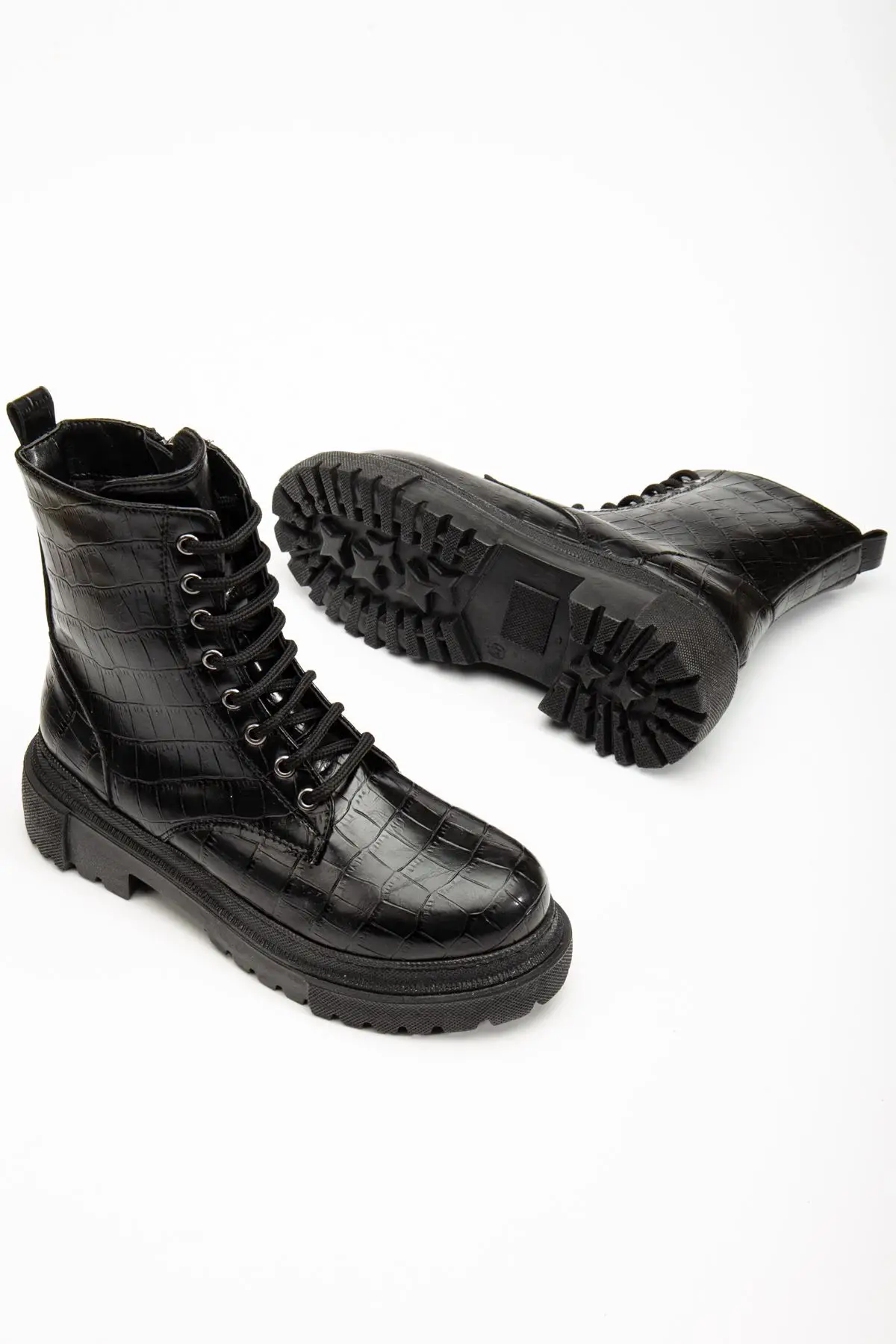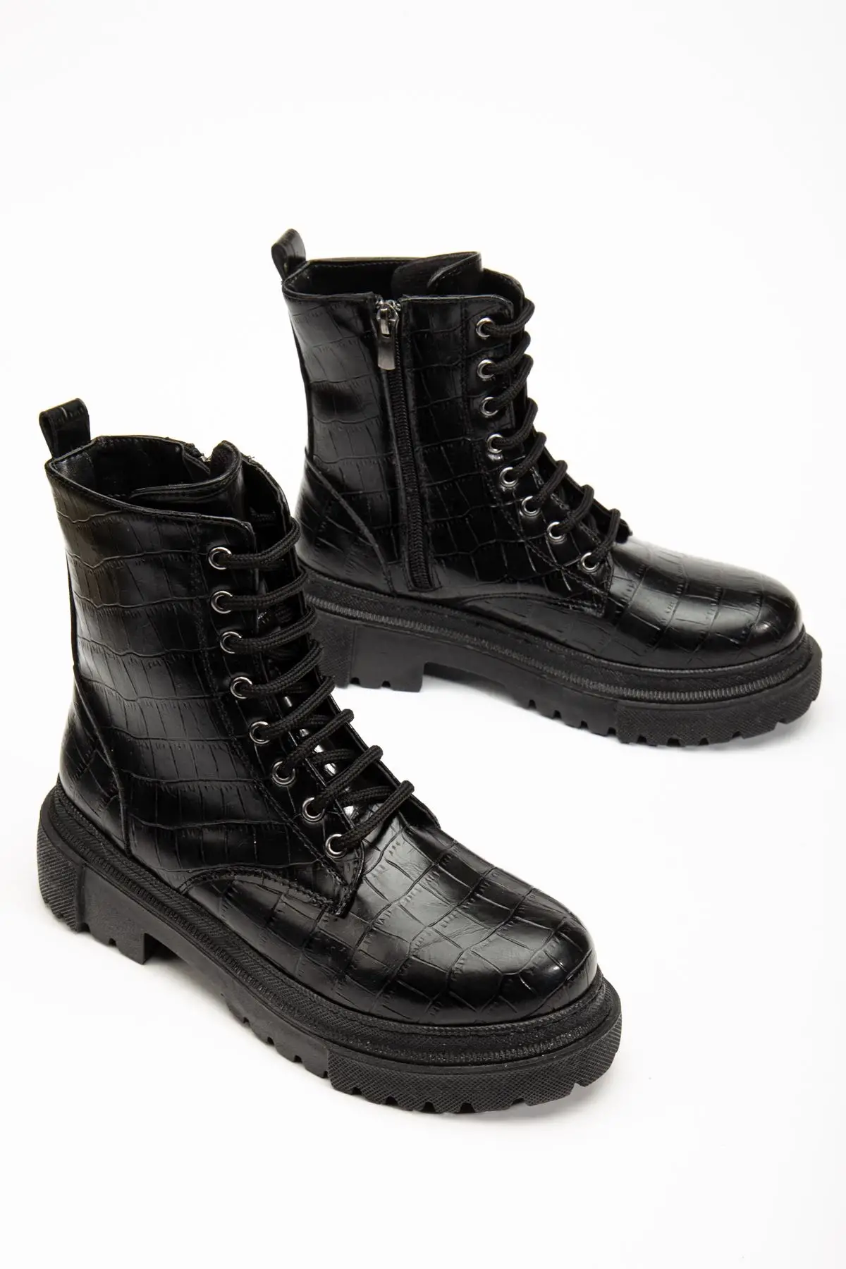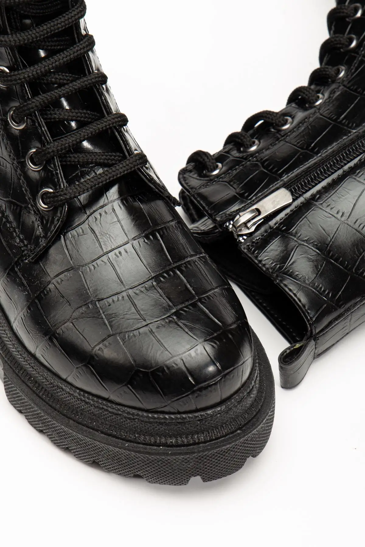Siyah Kroko Bağcıklı Fermuarlı Günlük Kadın Bot