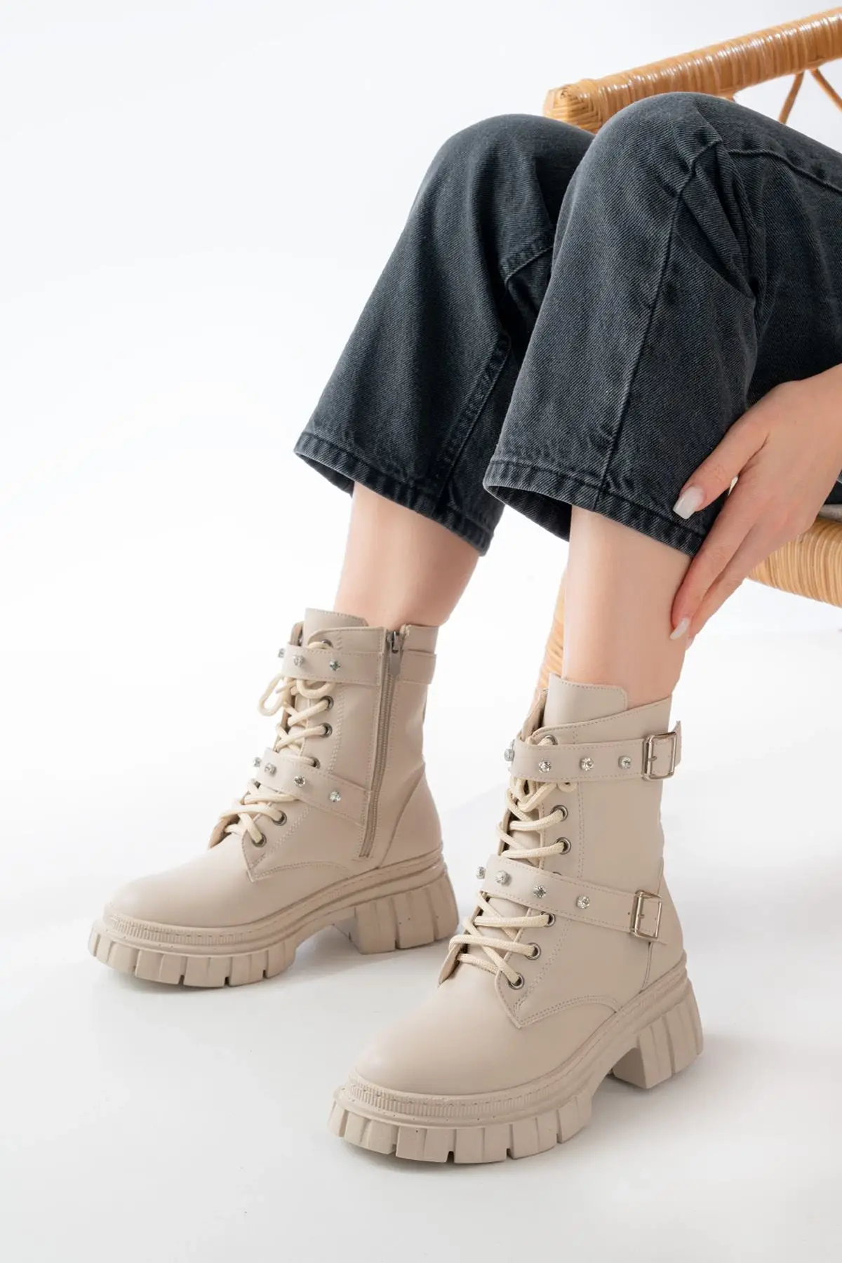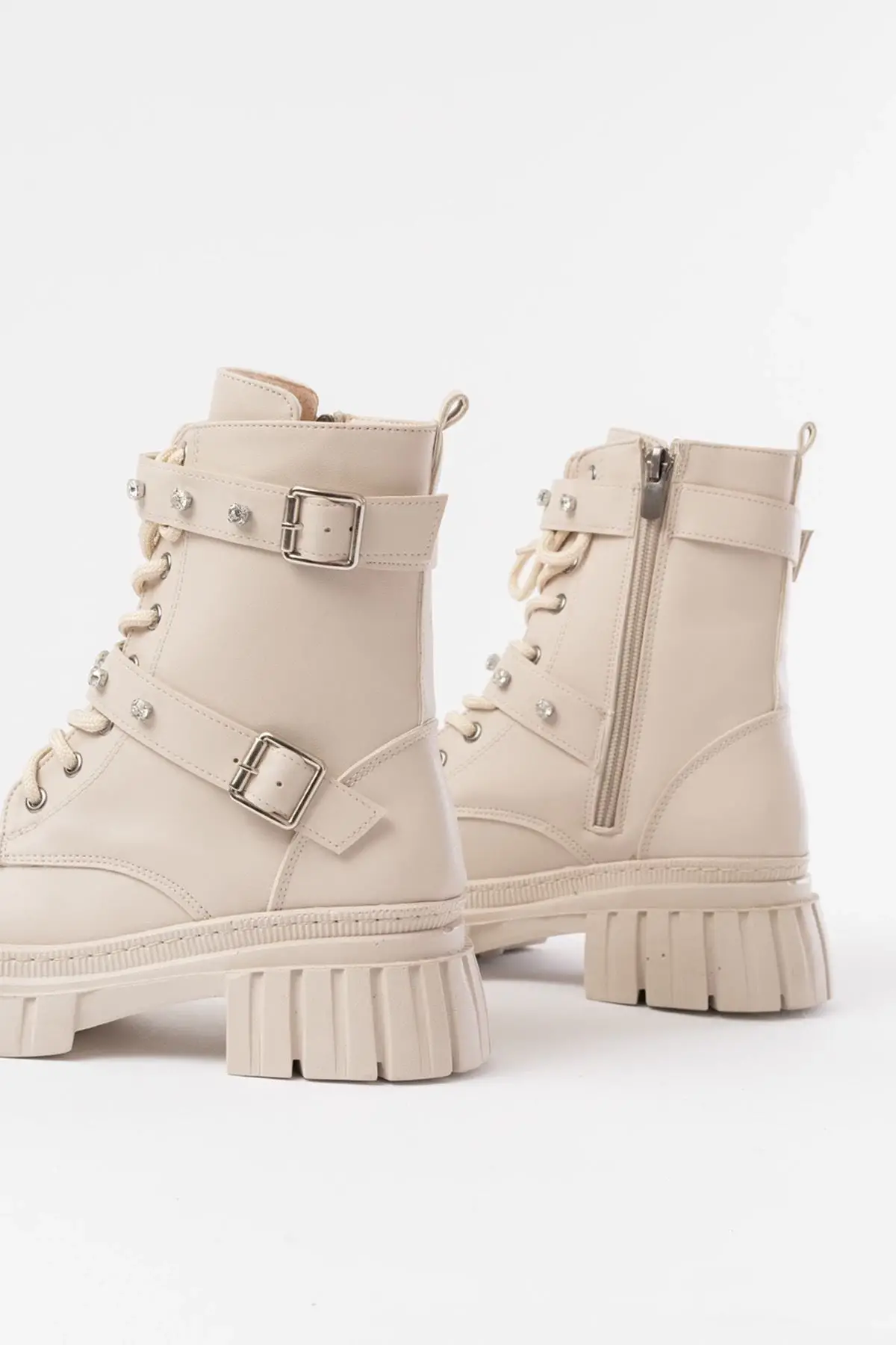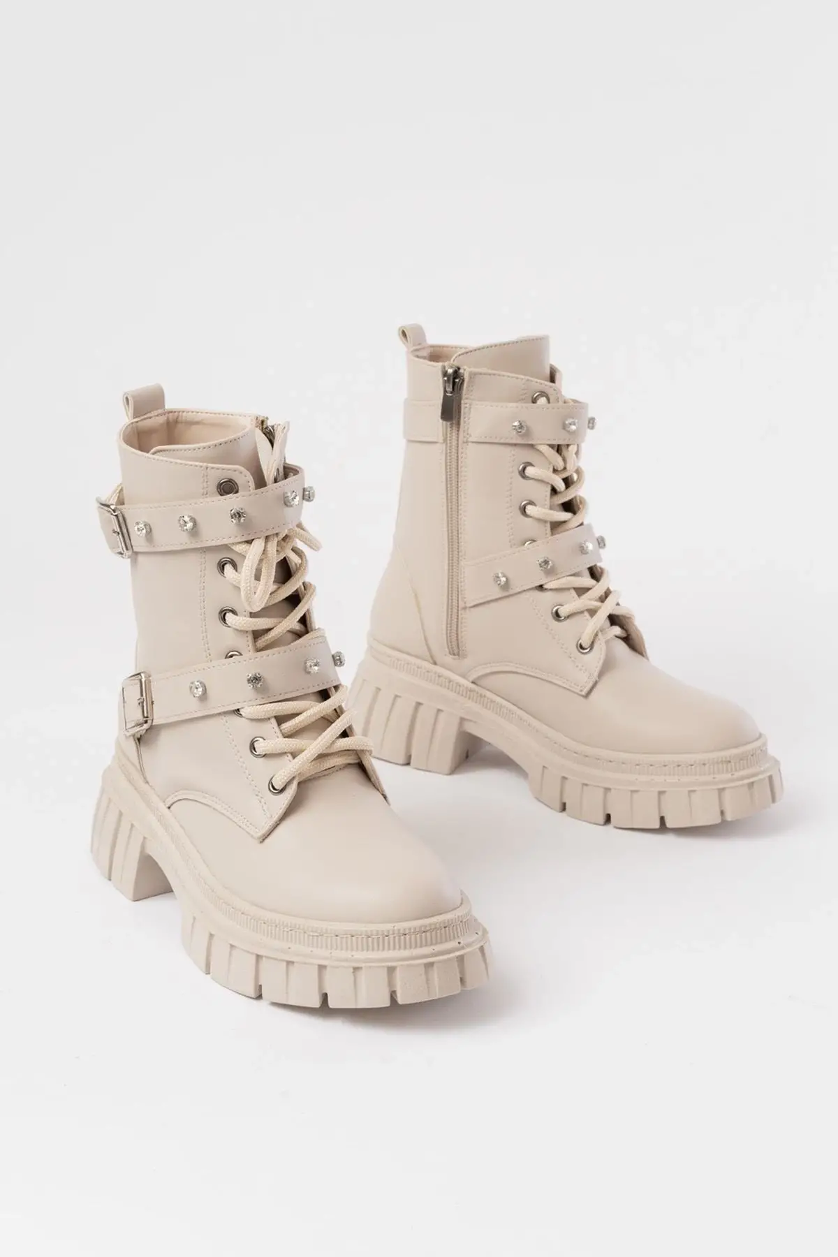 Bej Bağcıklı Kalın Tabanlı Bağcıklı Fermuarlı Günlük Kadın Bot