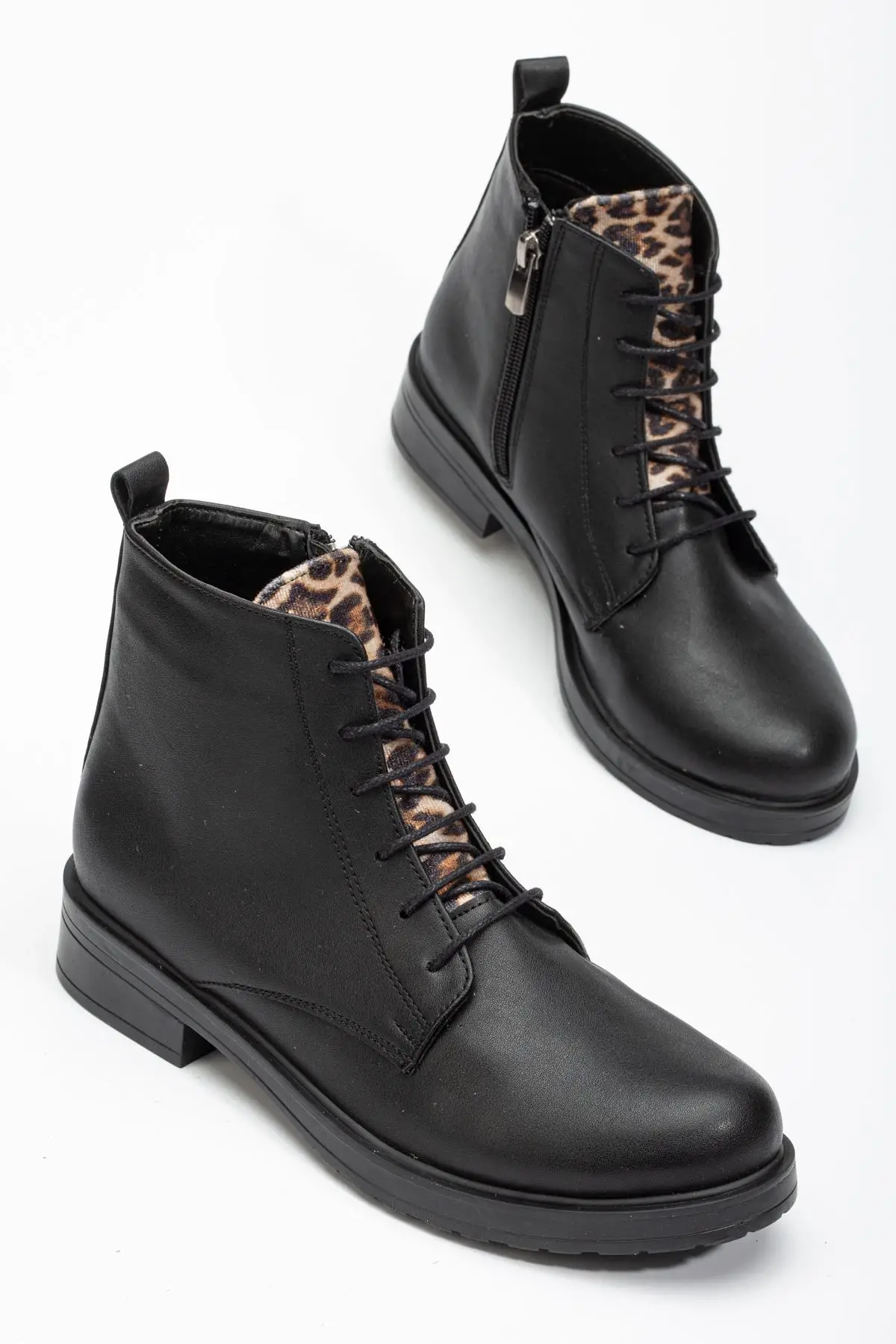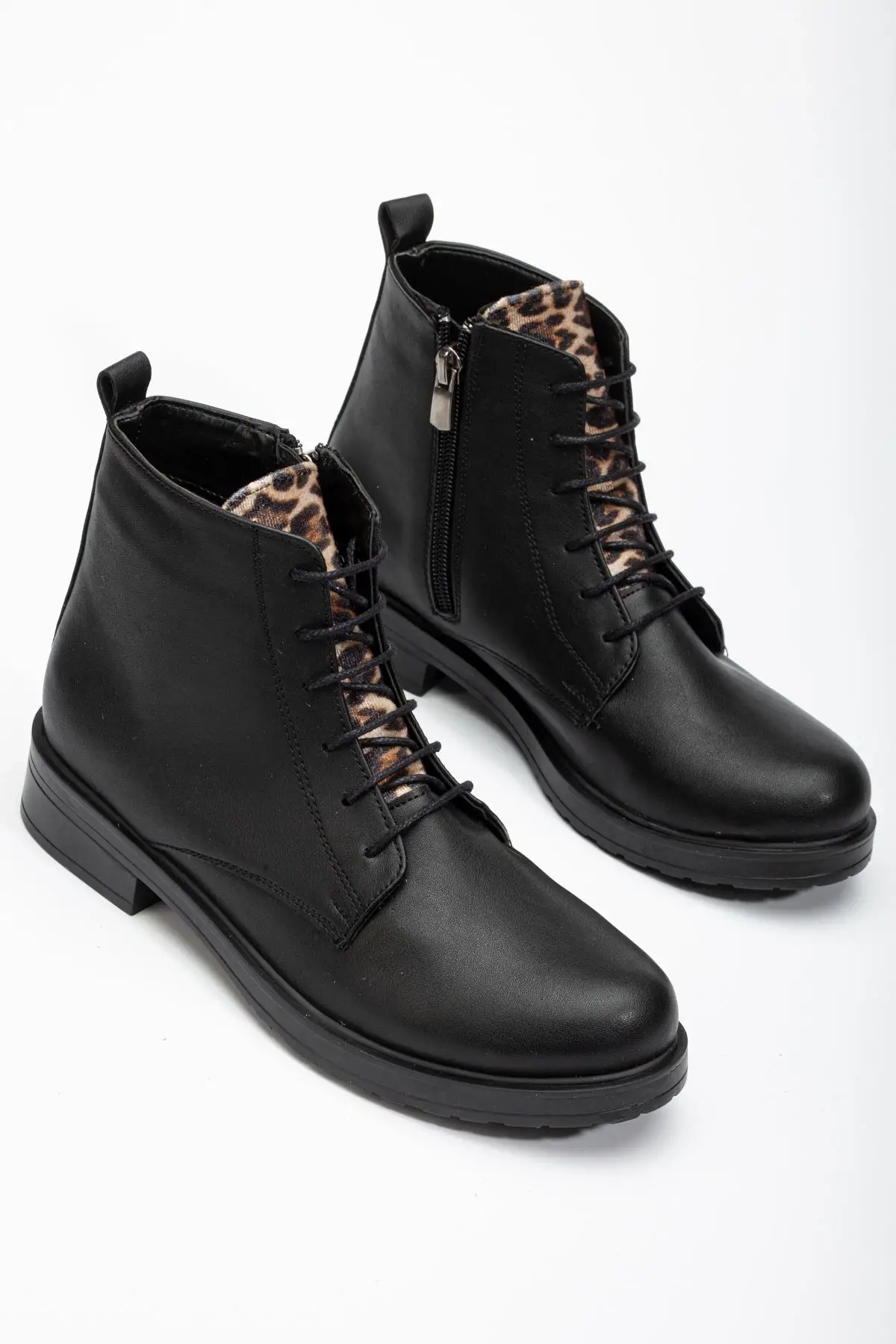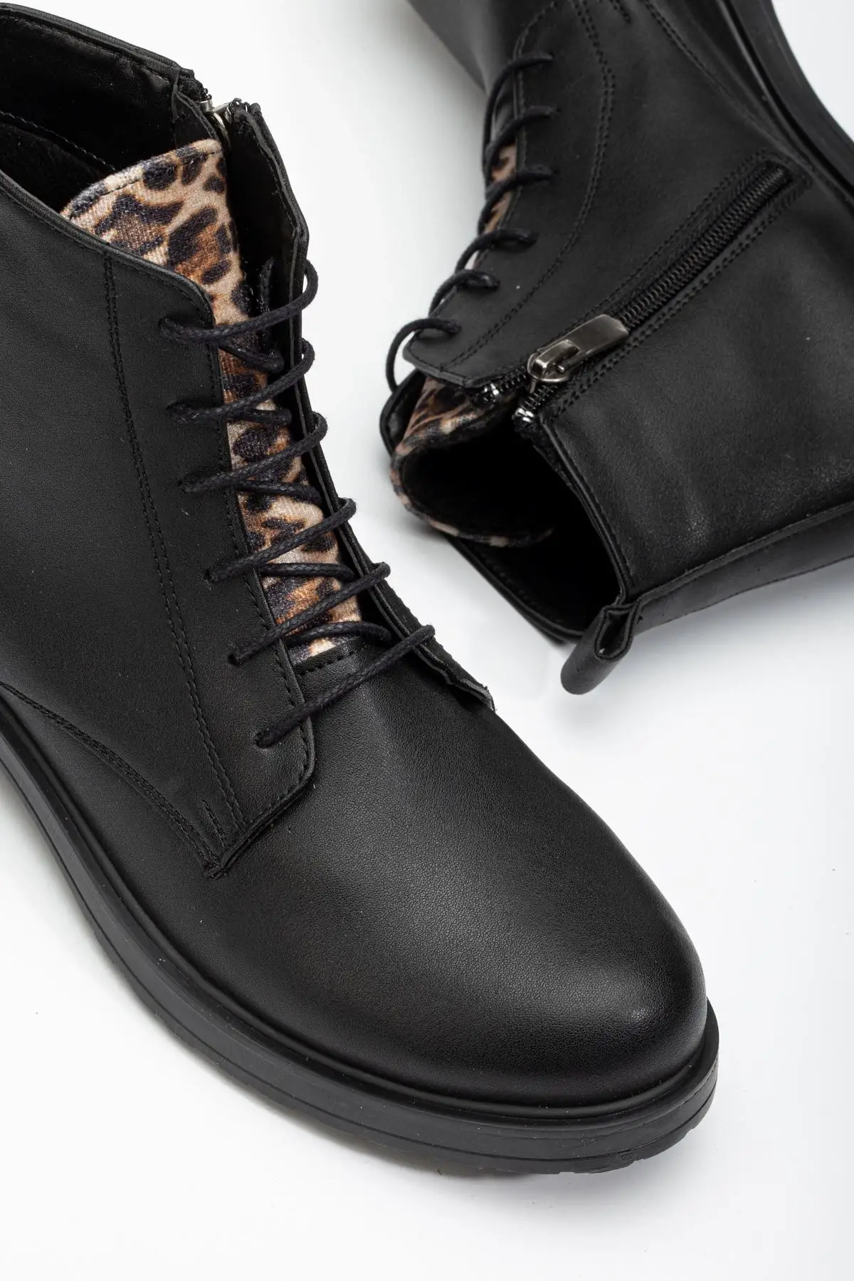 Siyaha Leopar Bağcıklı Fermuarlı Günlük Kadın Bot