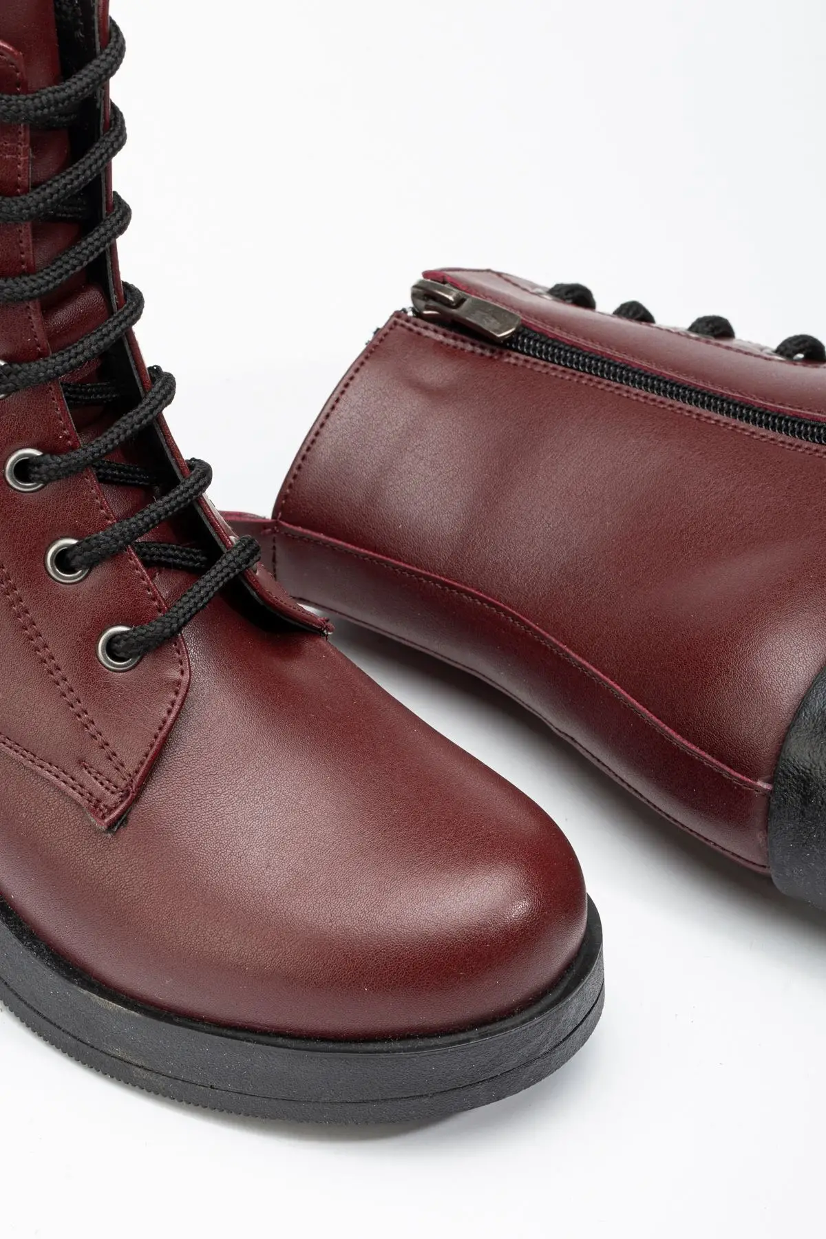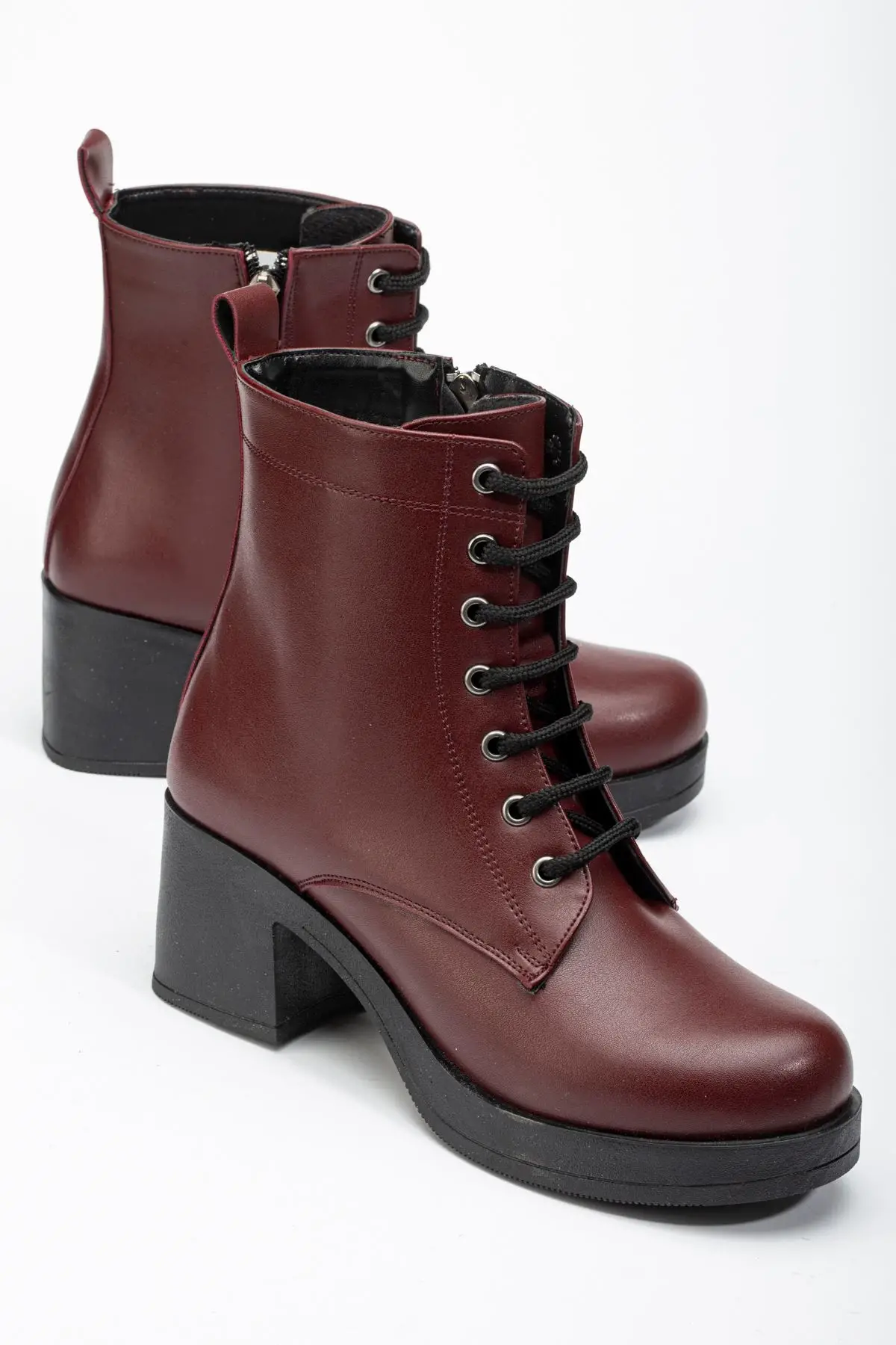 Bordo Bağcıklı Fermuarlı Kalın Topuklu Günlük Kadın Bot