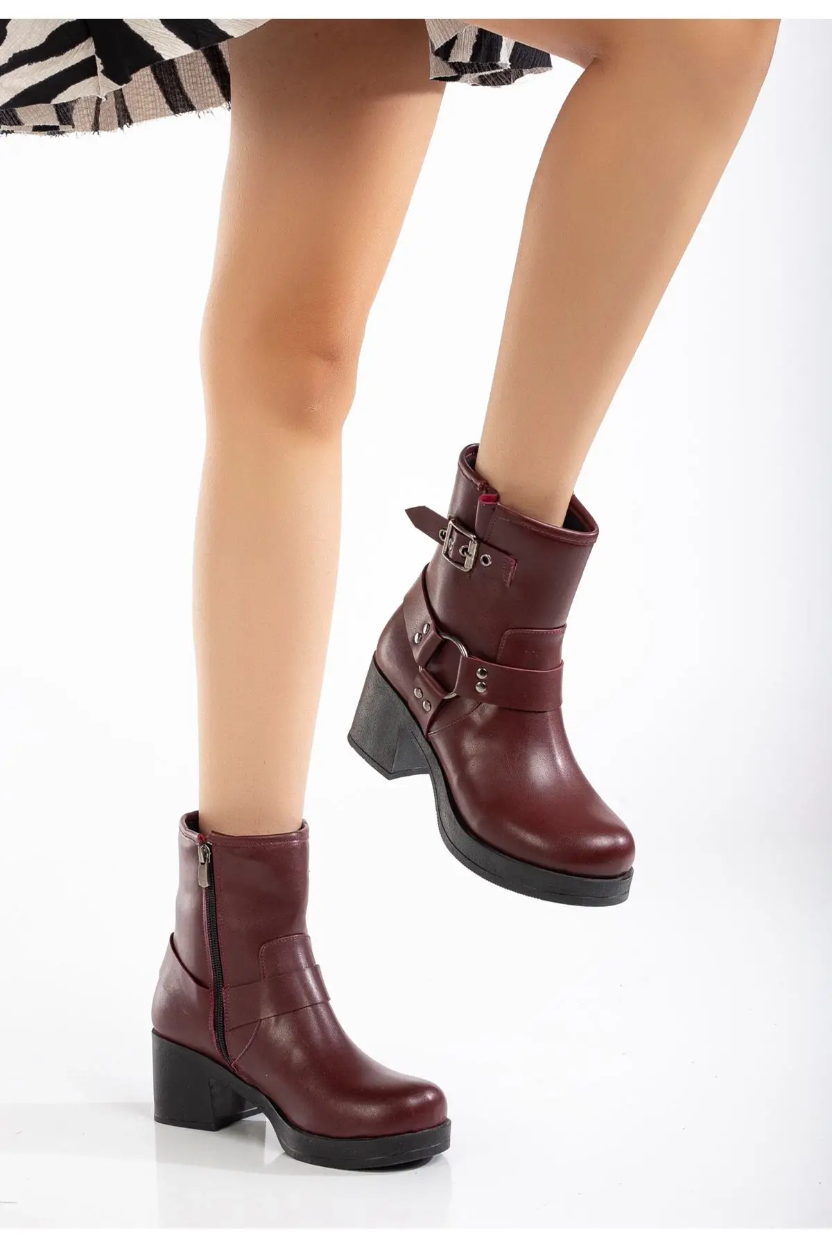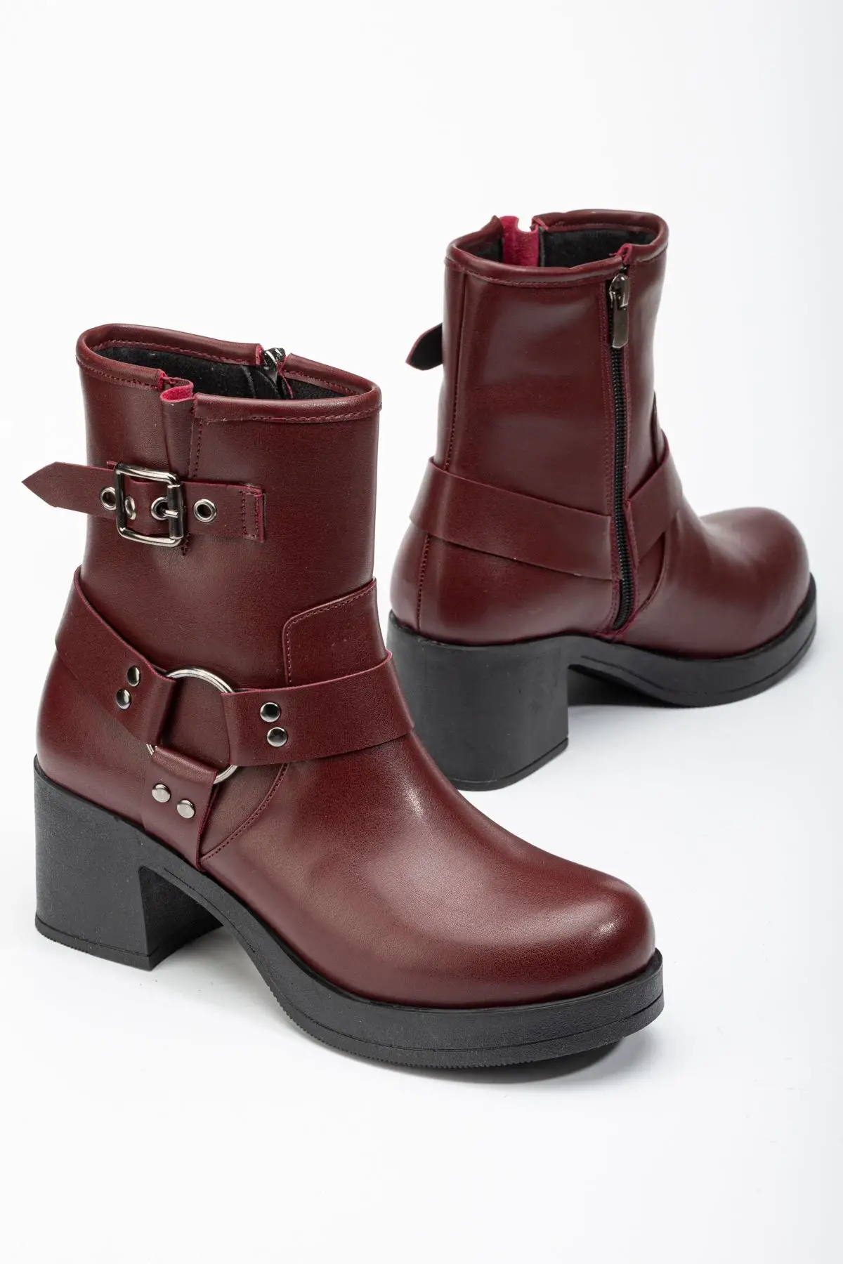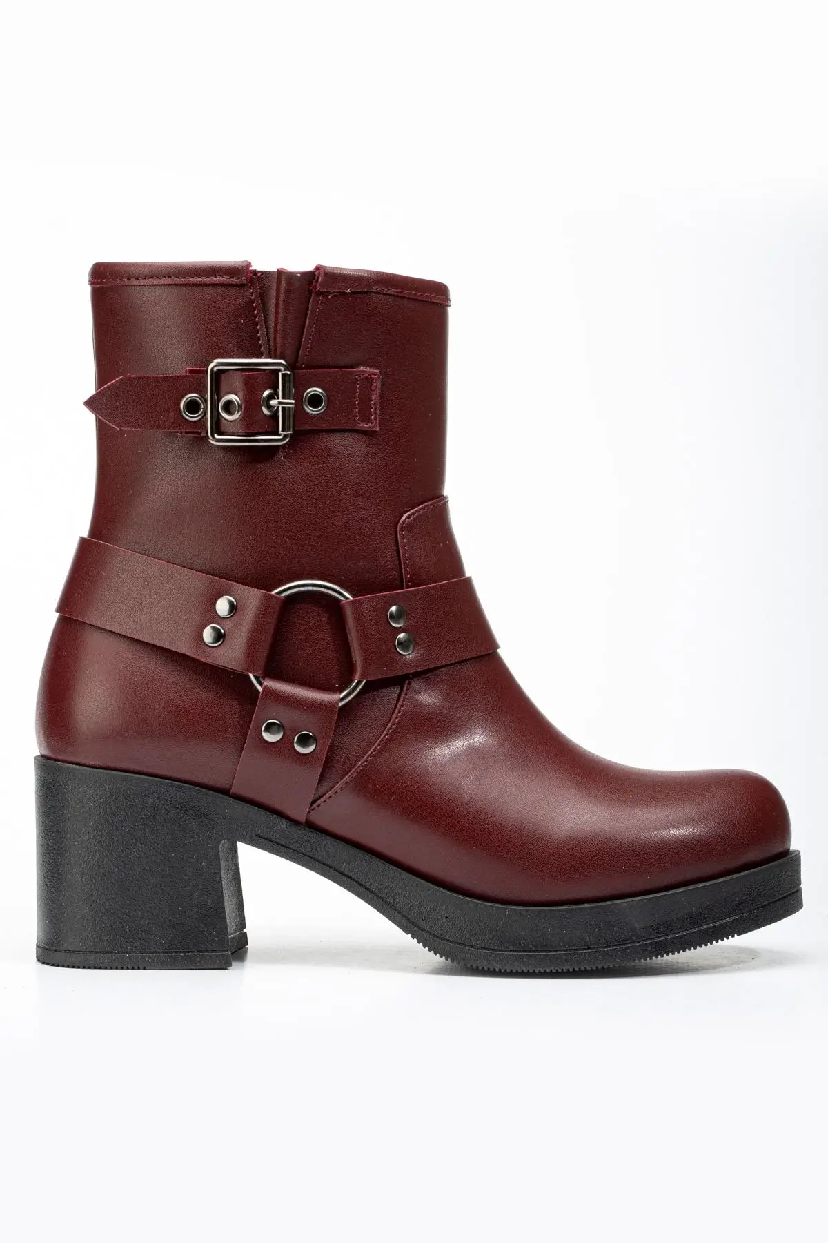 Bordo Toka Aksesuarlı Fermuarlı Kalın Topuklu Günlük Kadın Bot
