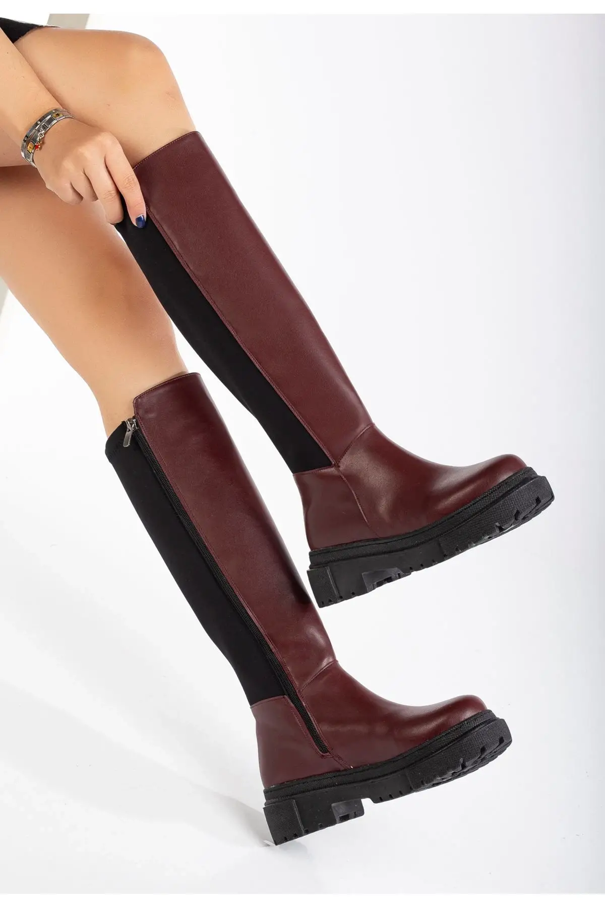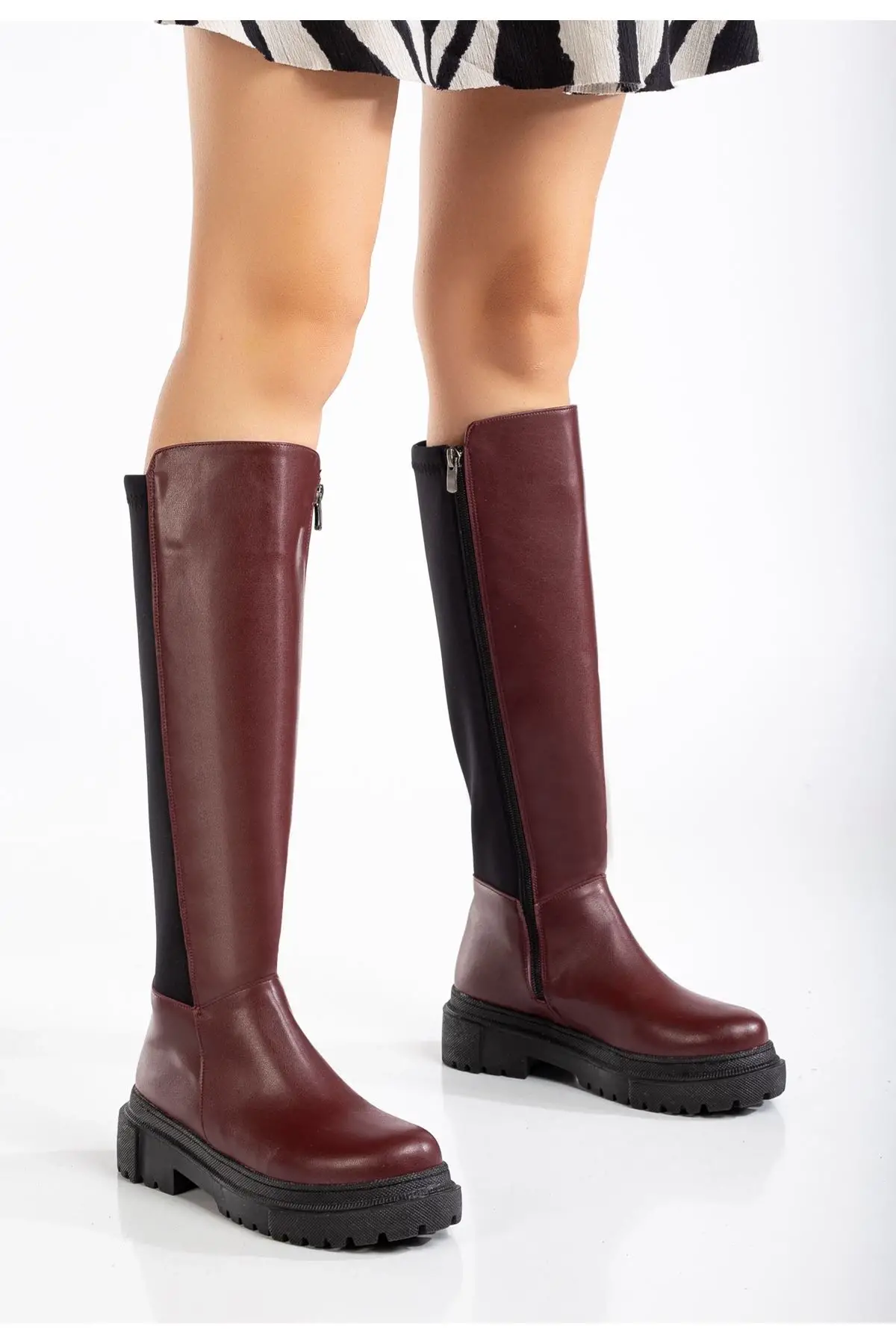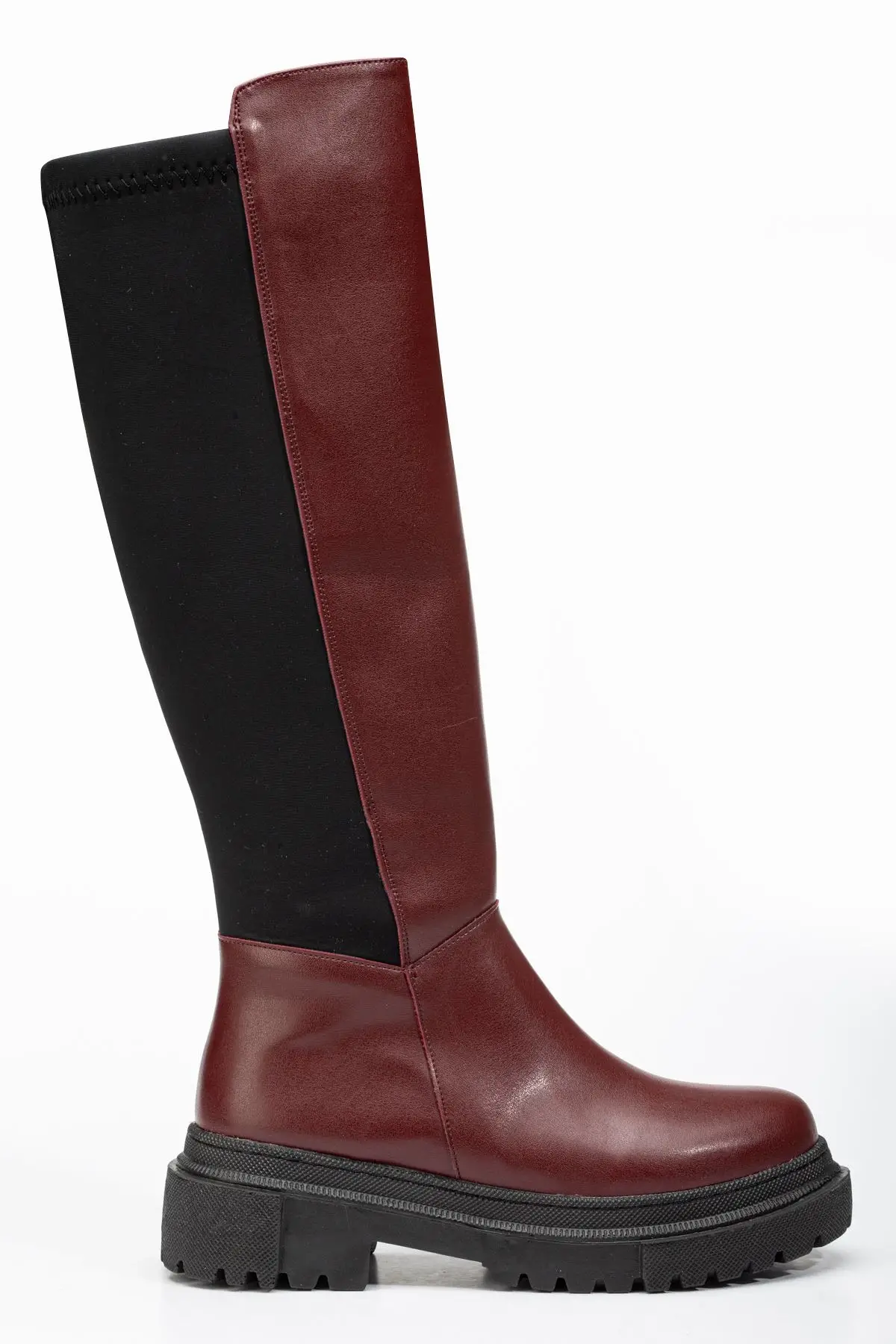 Bordo Arkası Streç Fermuarlı Günlük Kadın Çizme