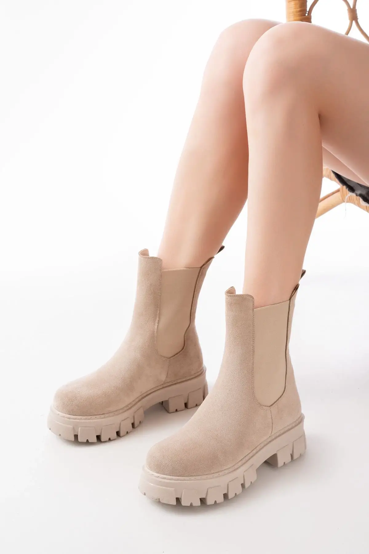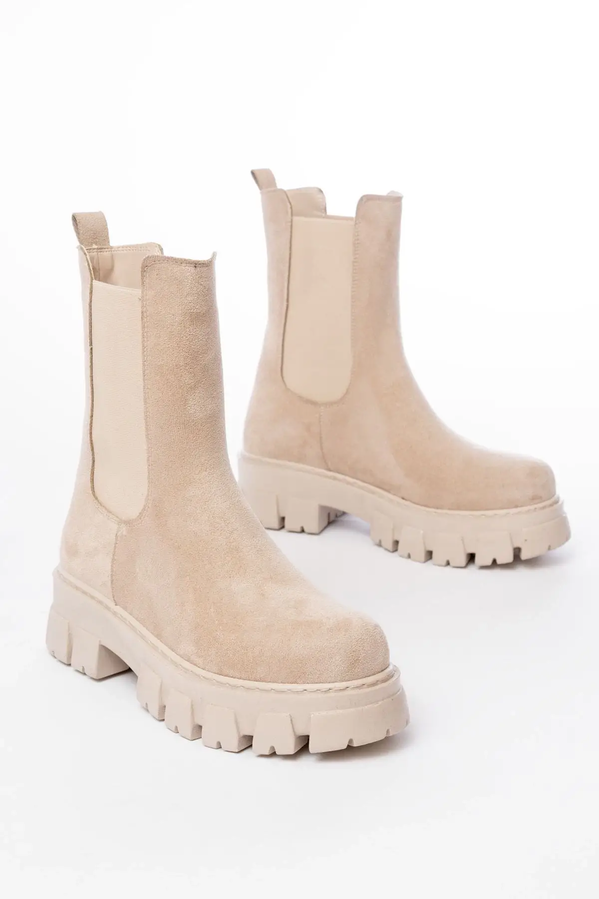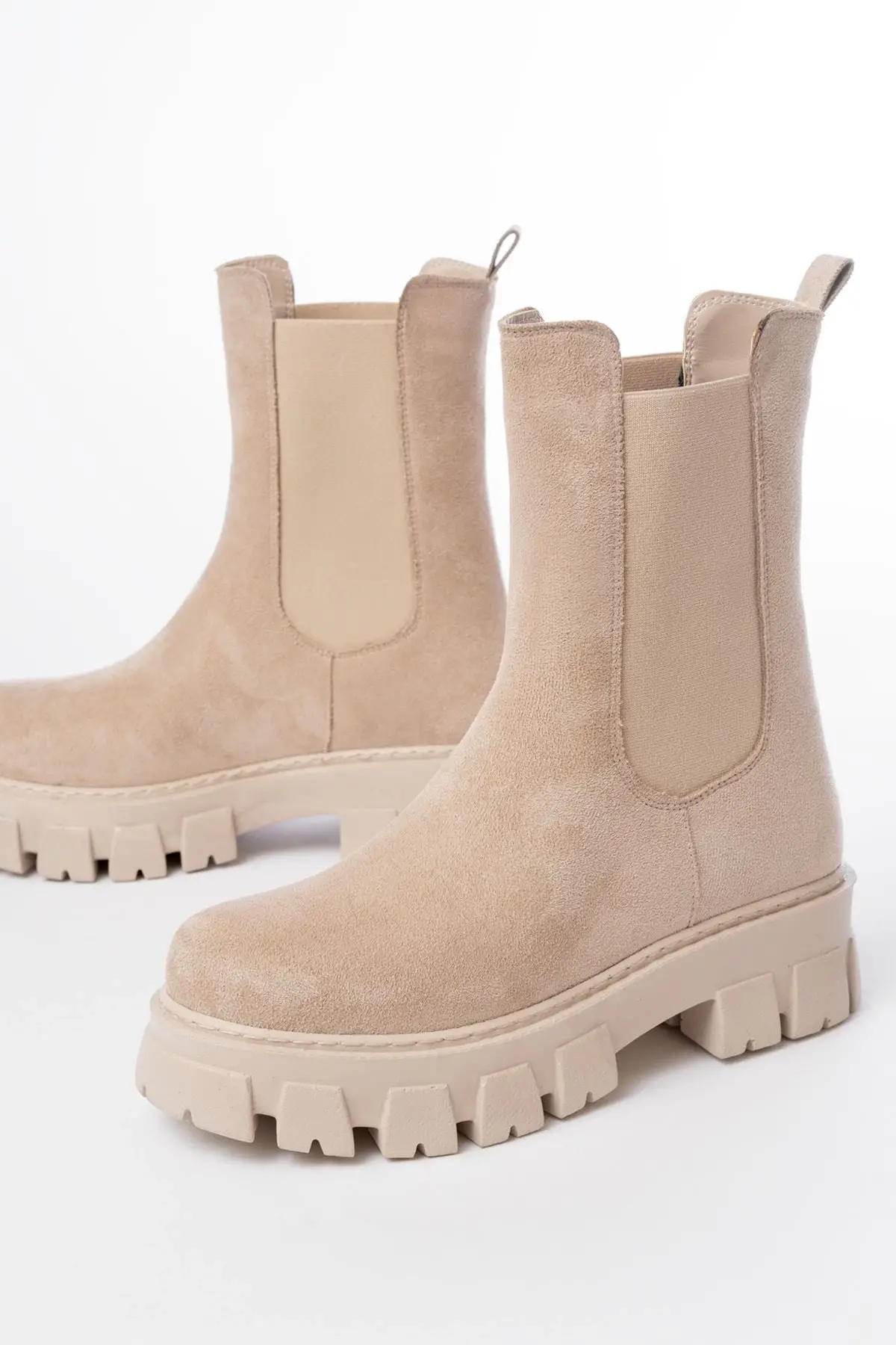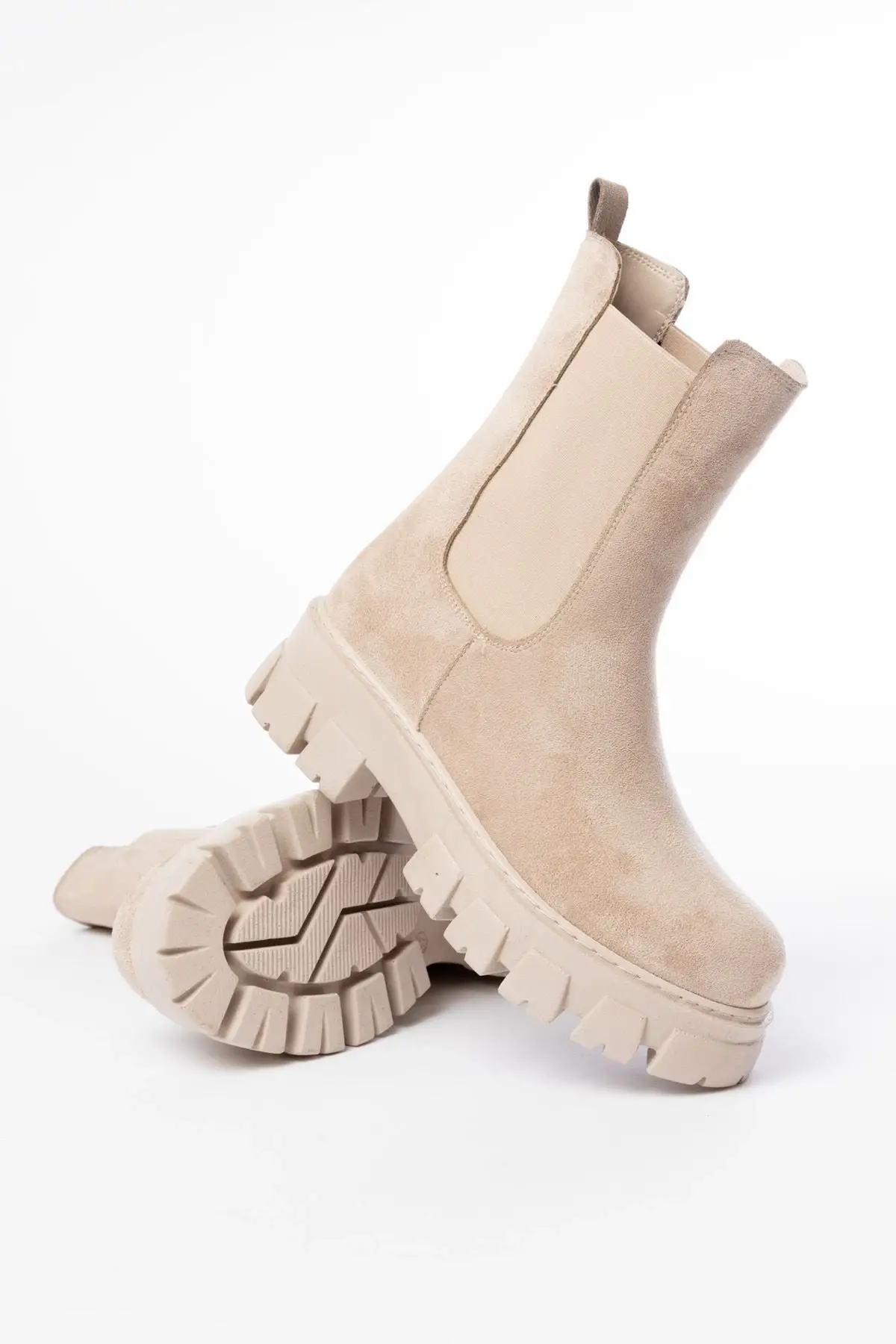 Bej Süet Yüksek Tabanlı Lastikli Günlük Kadın Bot
