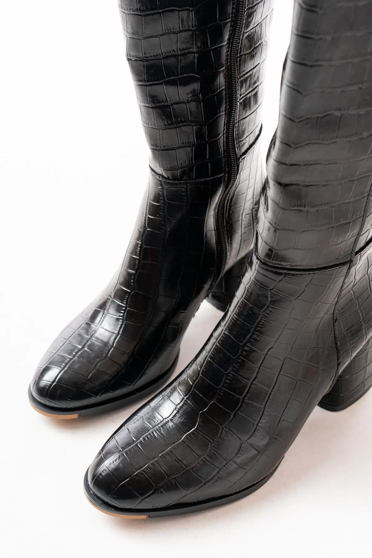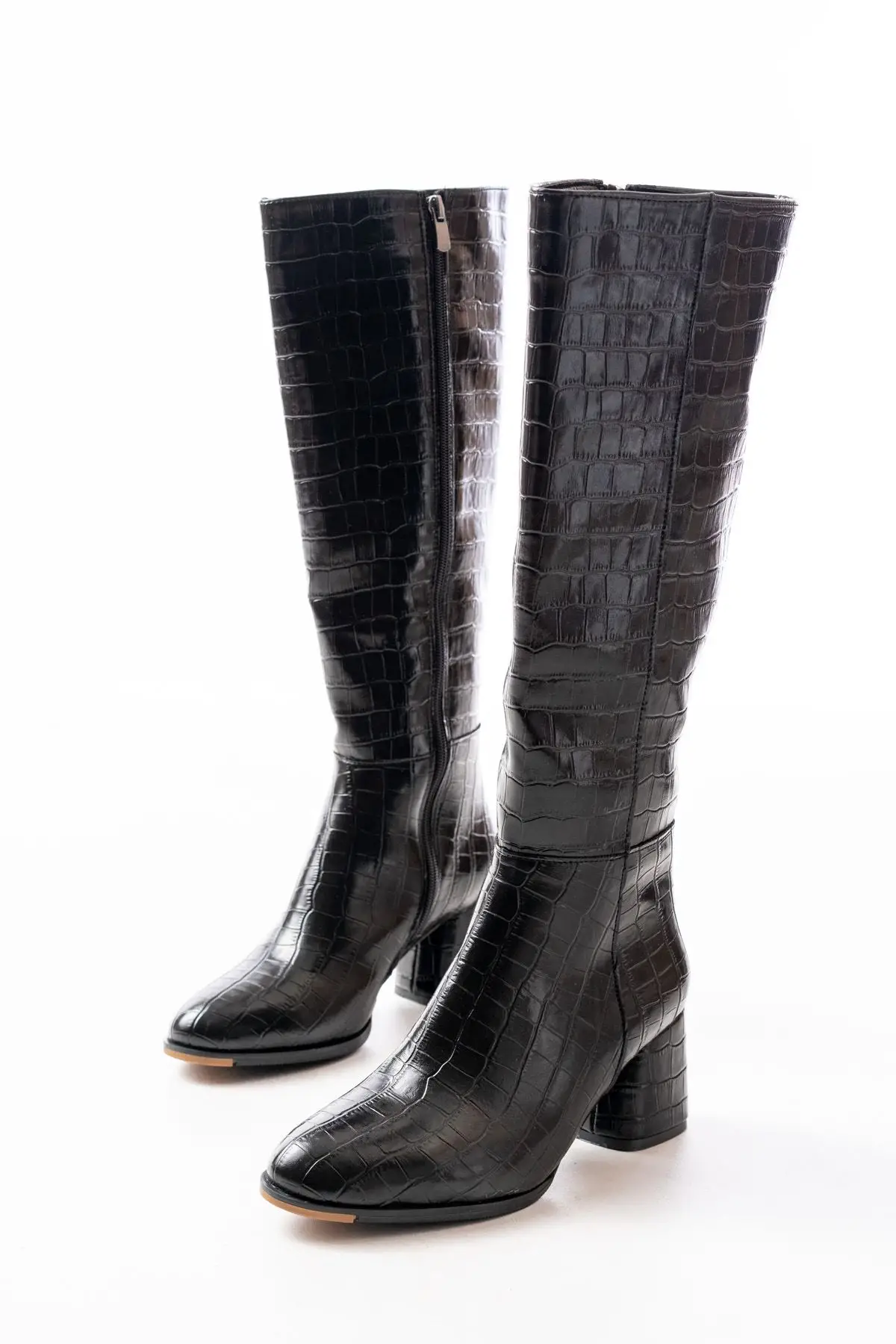 Siyah Kroko Topuklu Fermuarlı Günlük Kadın Çizme