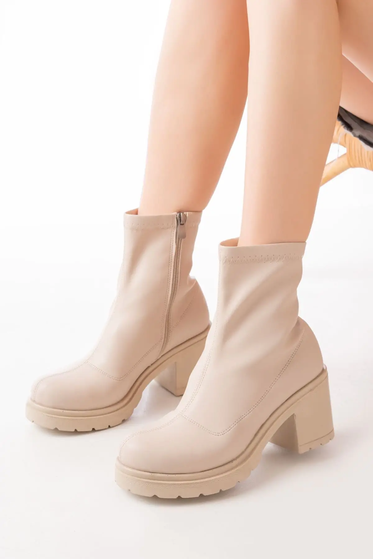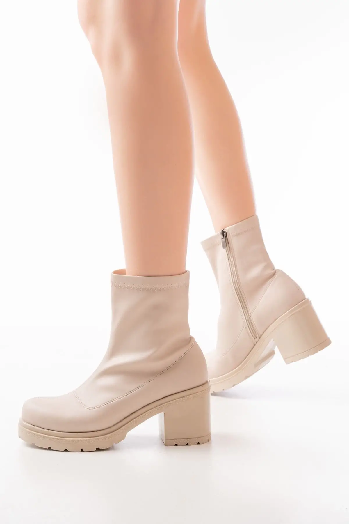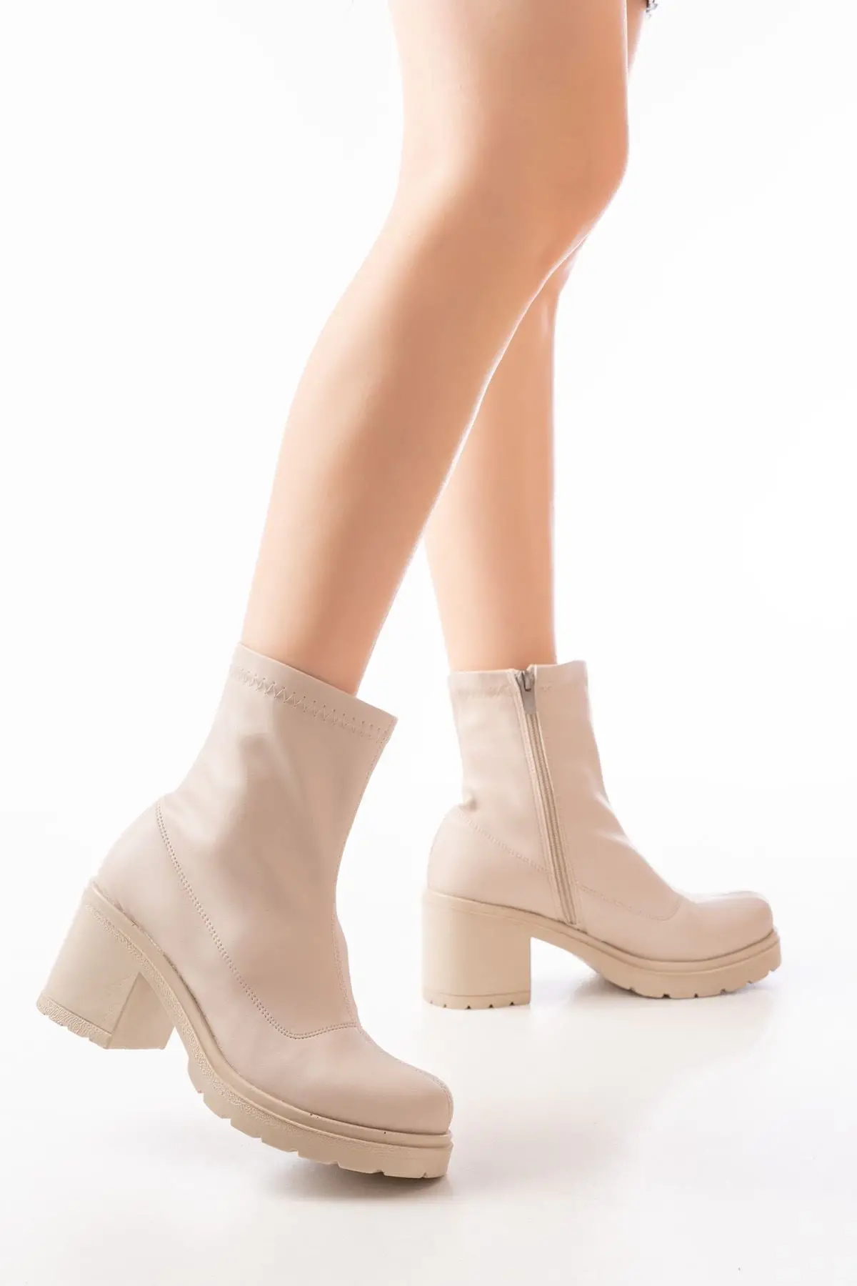Streç Bej Fermuarlı Kalın Topuklu Günlük Kadın Bot