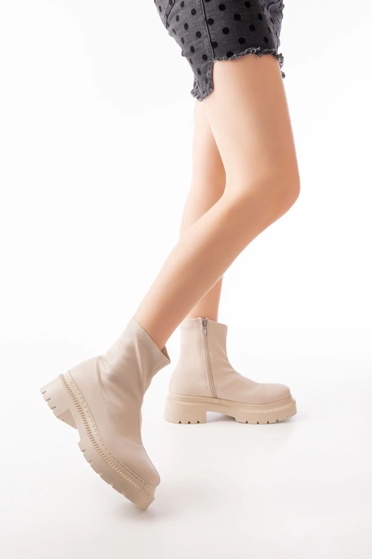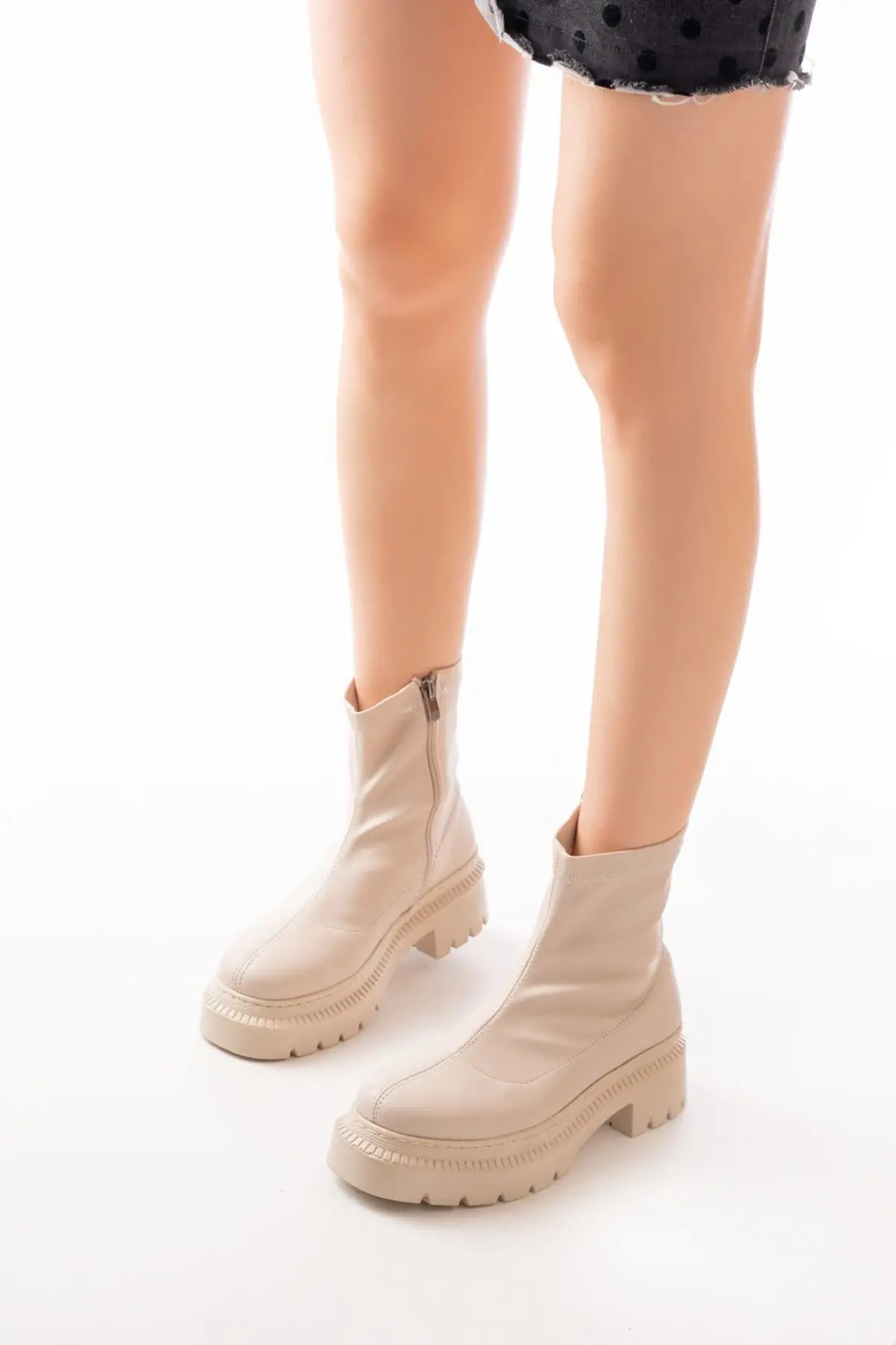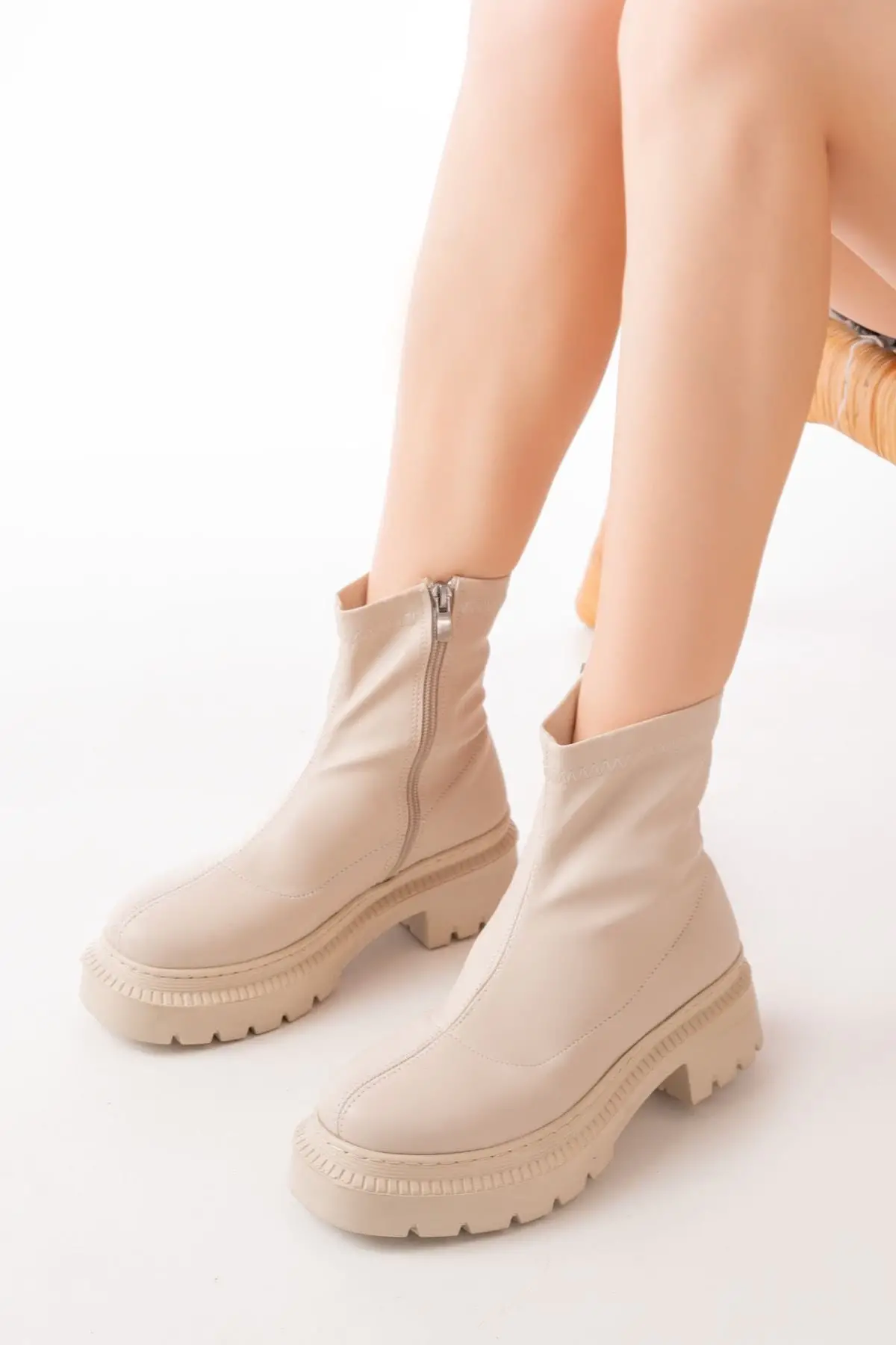 Streç Bej Fermuarlı Kalın Topuklu Günlük Kadın Bot