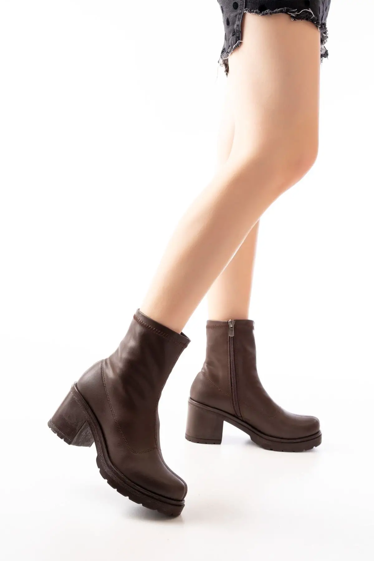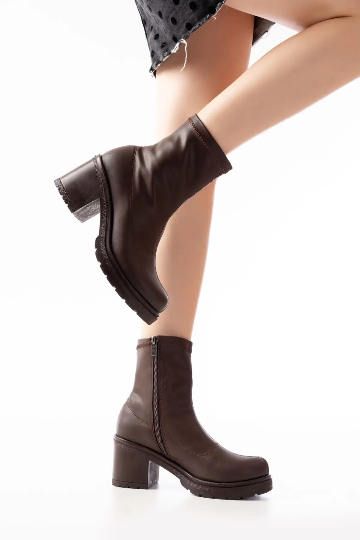 Streç Kahve Fermuarlı Kalın Topuklu Günlük Kadın Bot