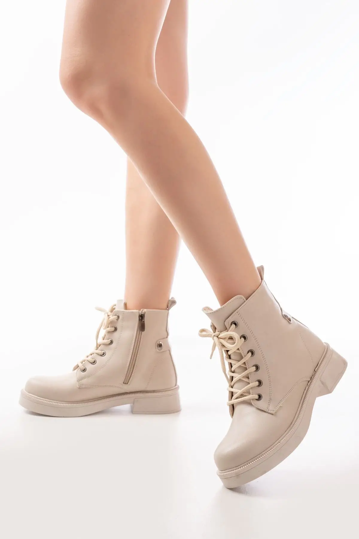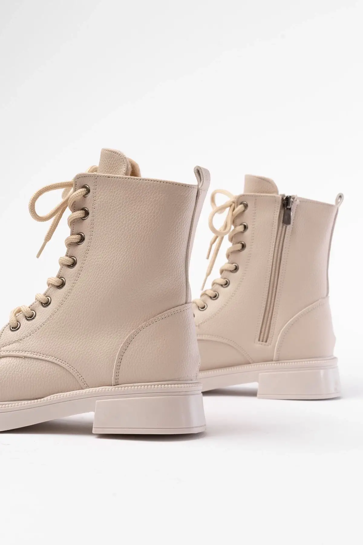Bej Galata Düz Topuklu Bağcıklı Fermuarlı Günlük Kadın Bot