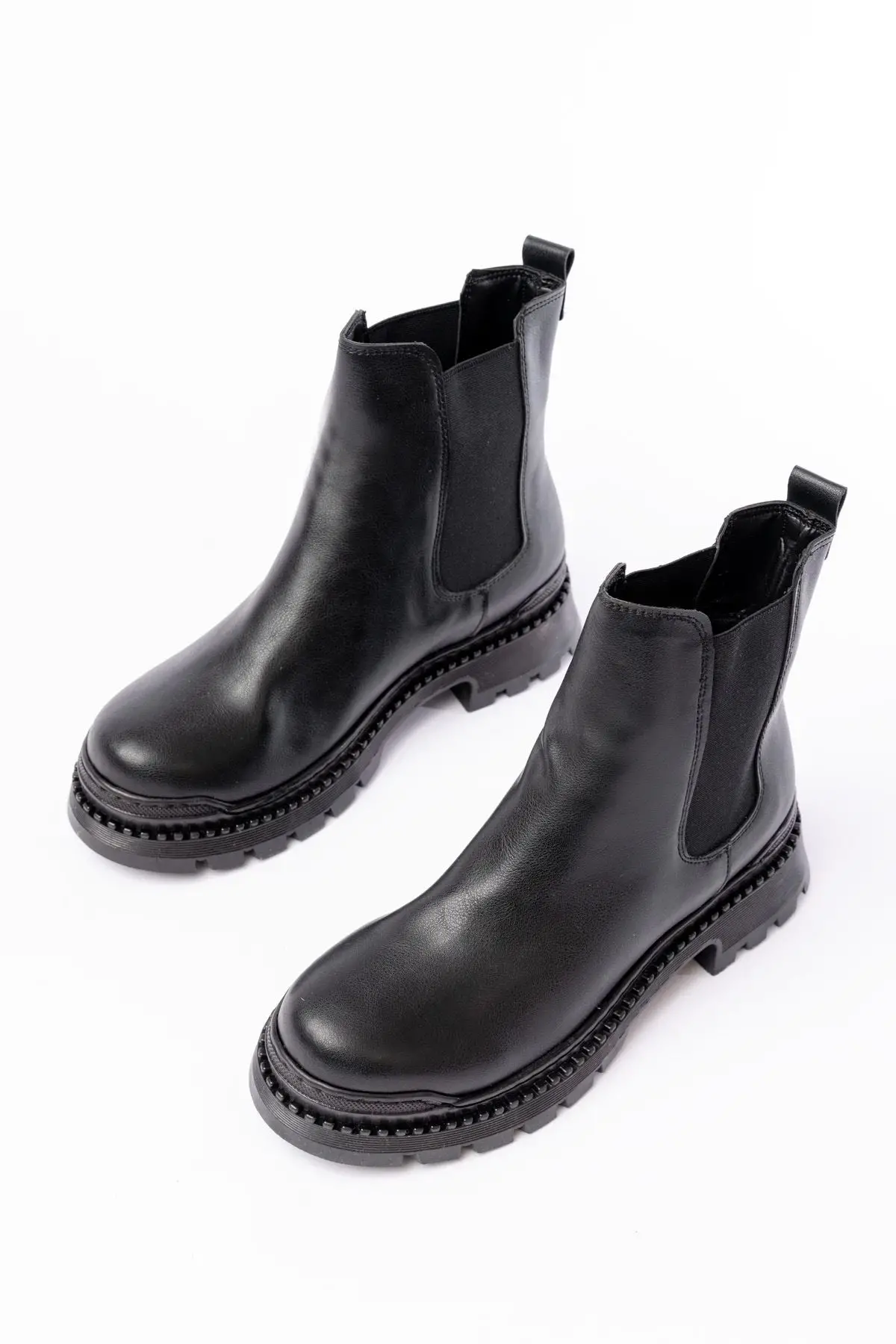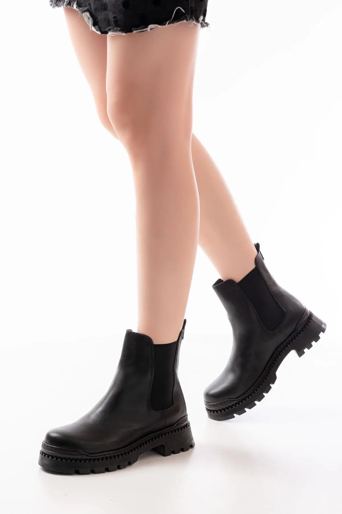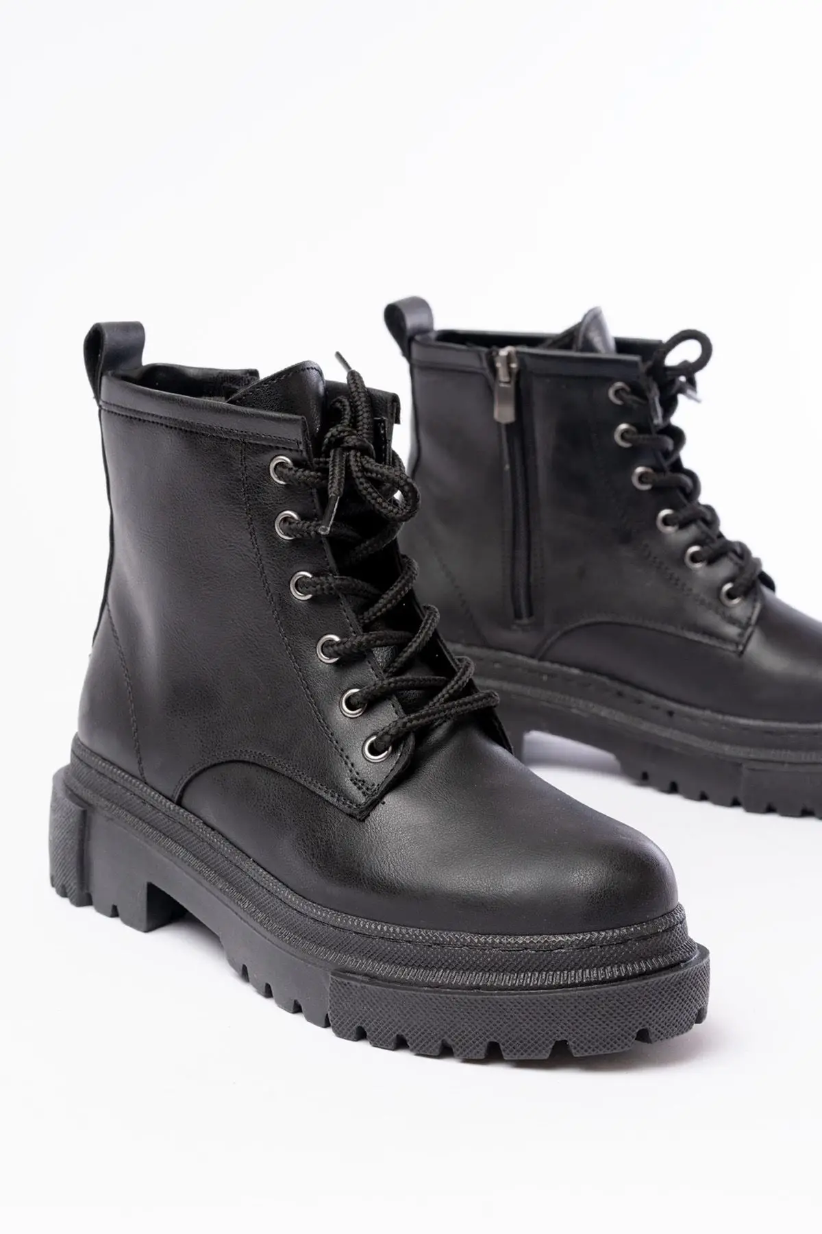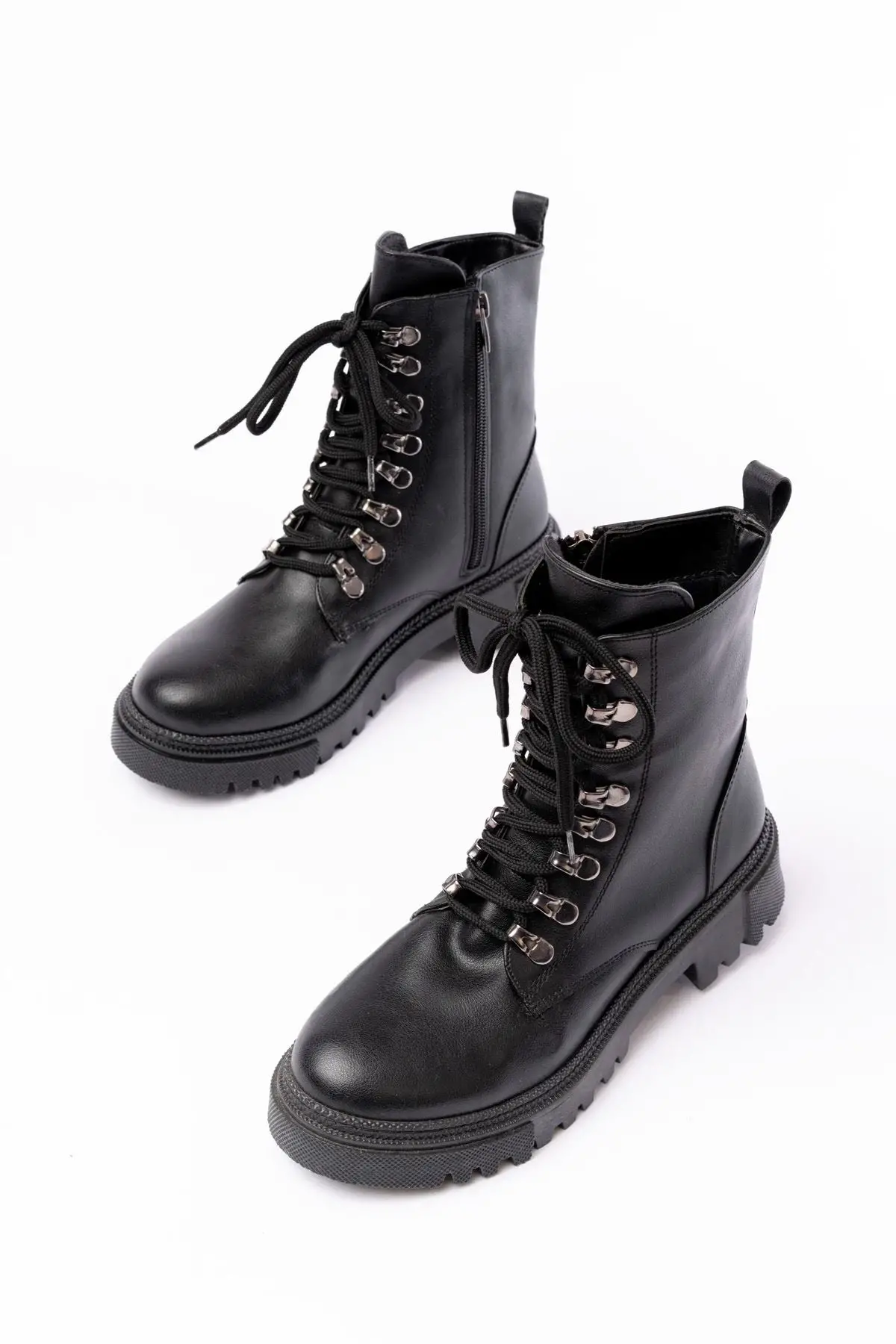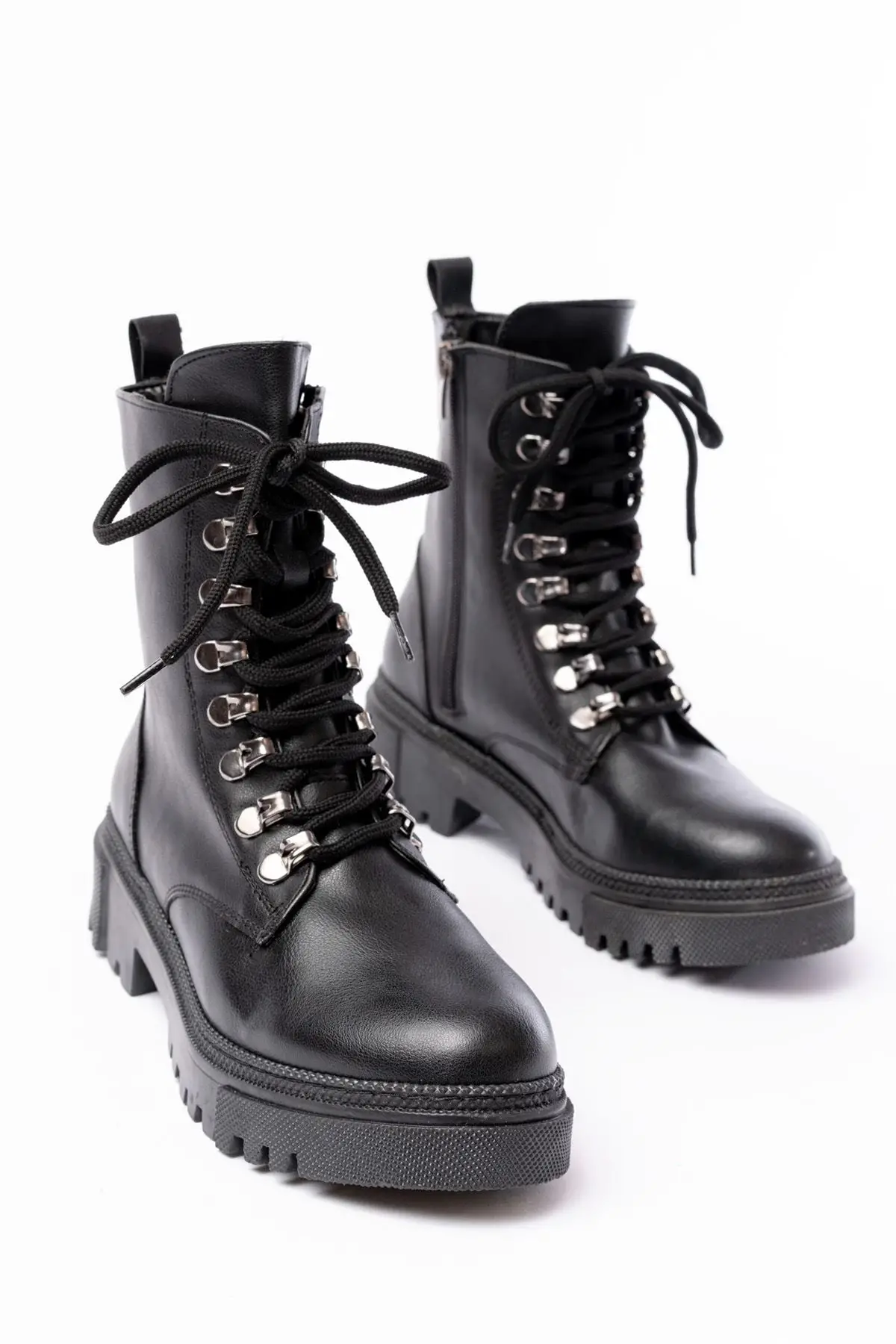 Siyah Cilt Bağcıklı Fermuarlı Günlük Kadın Bot