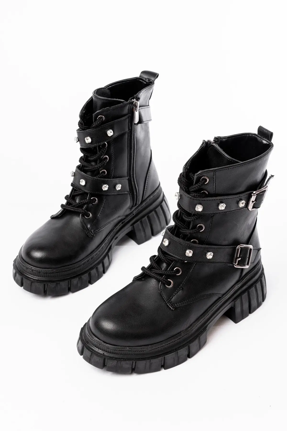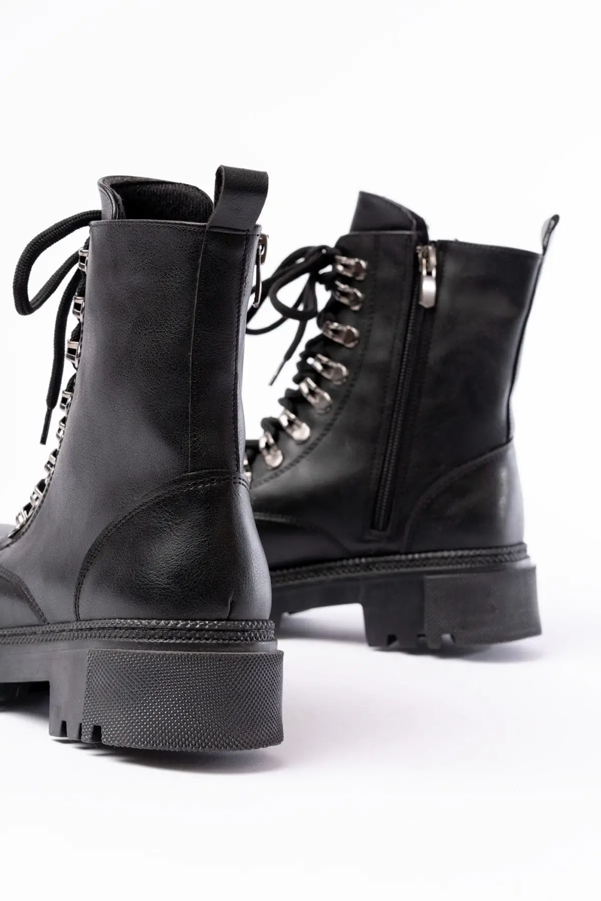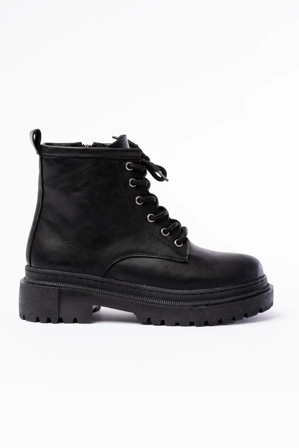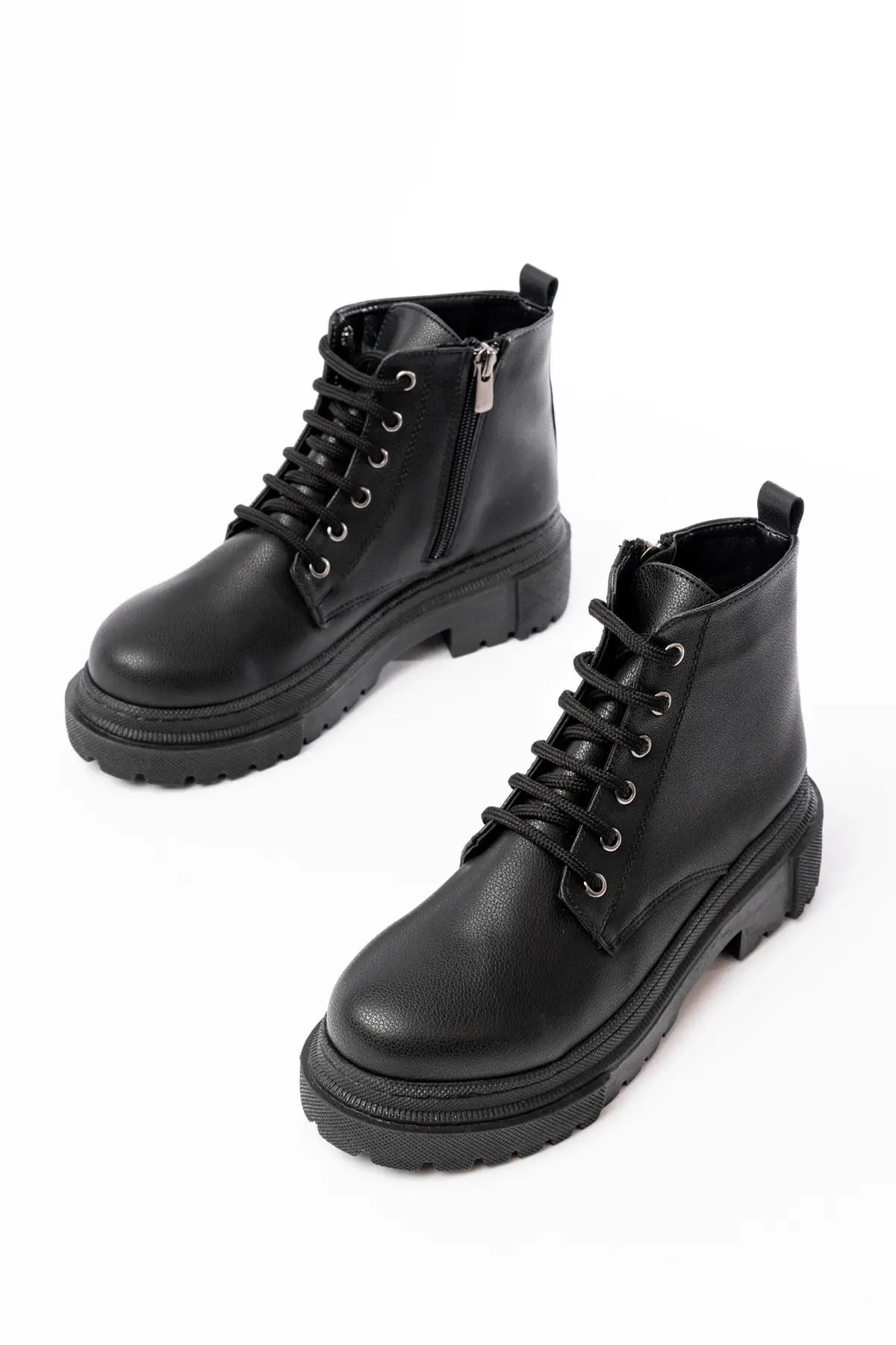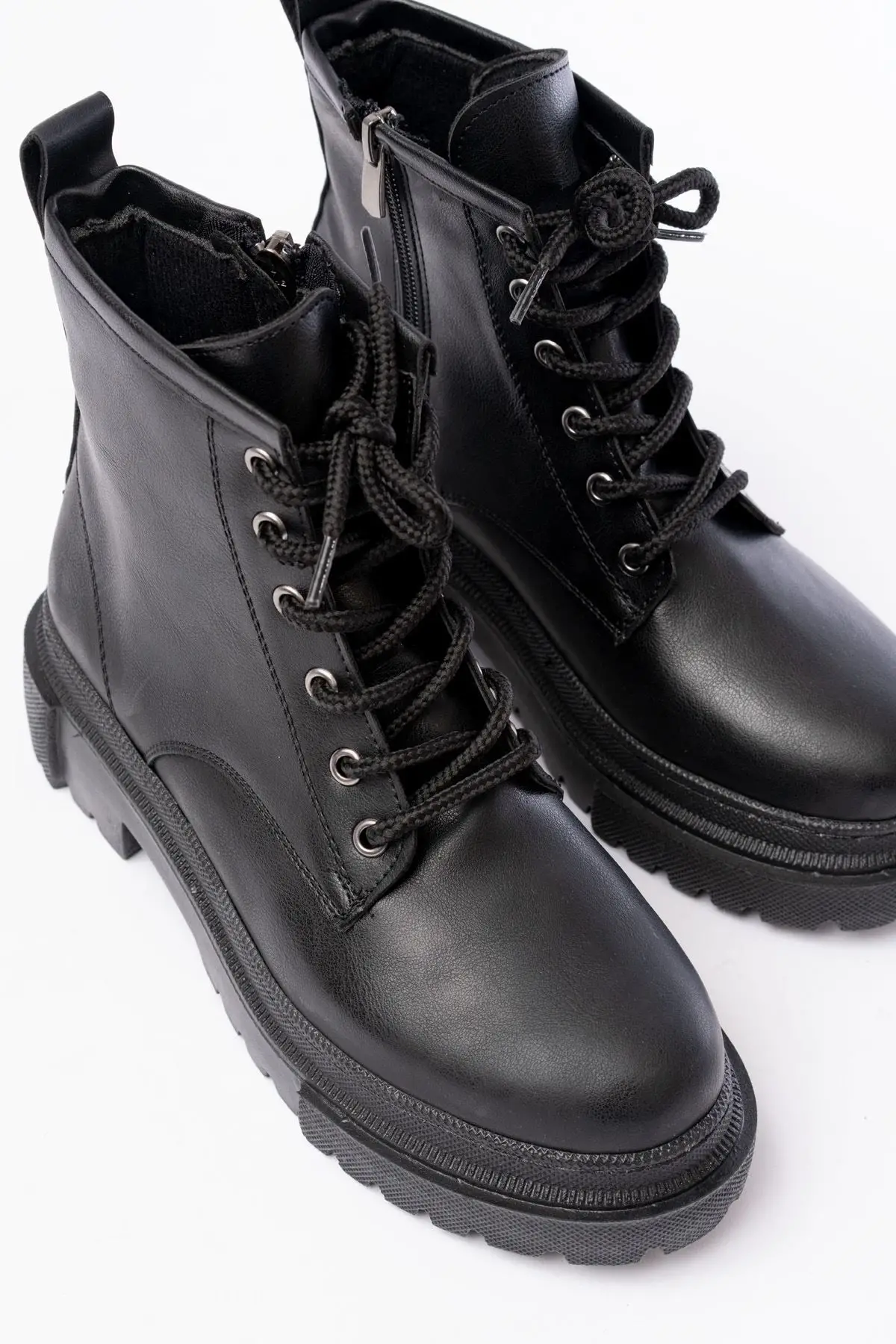 Siyah Bağcıklı Kalın Tabanlı Bağcıklı Fermuarlı Günlük Kadın Bot