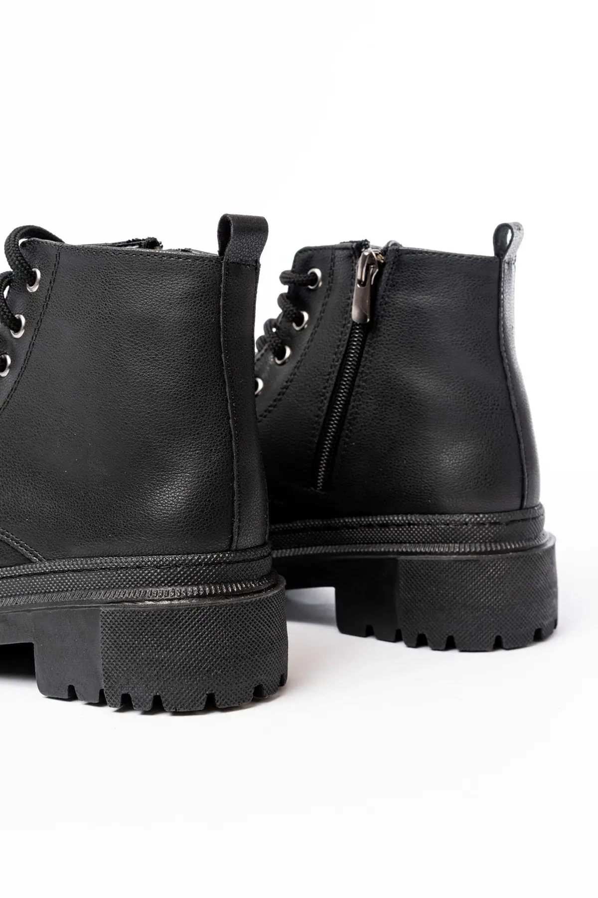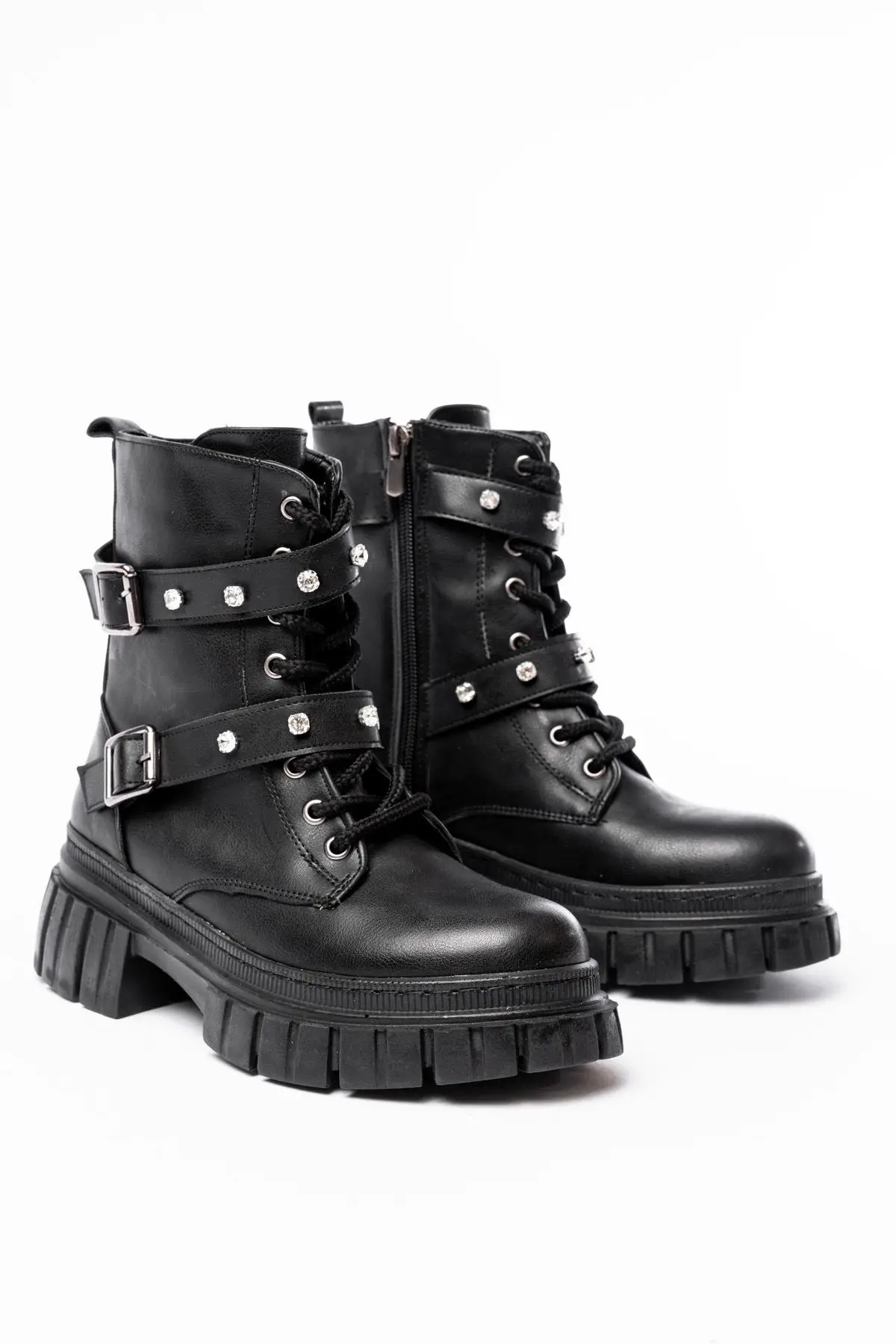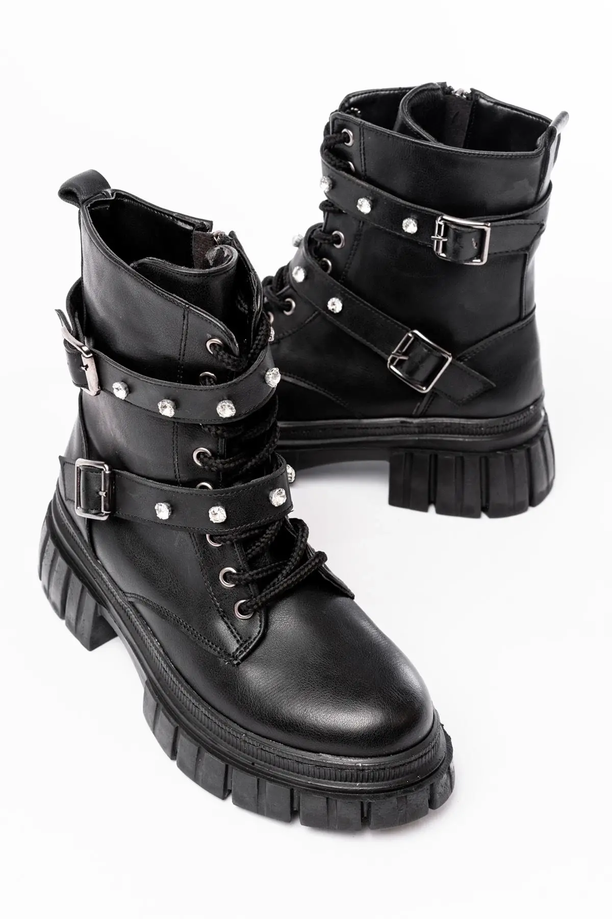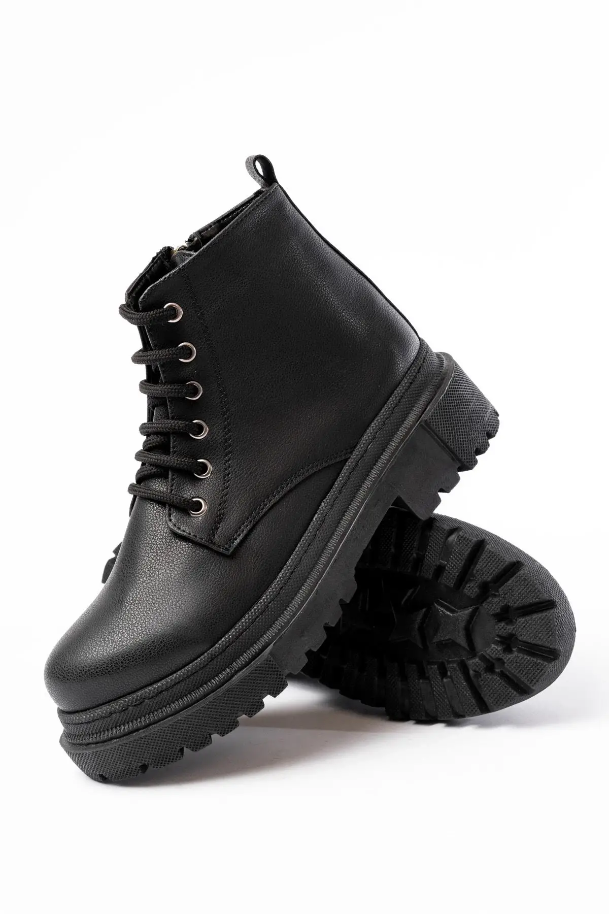 Siyah Bağcıklı Kalın Tabanlı Bağcıklı Fermuarlı Günlük Kadın Bot
