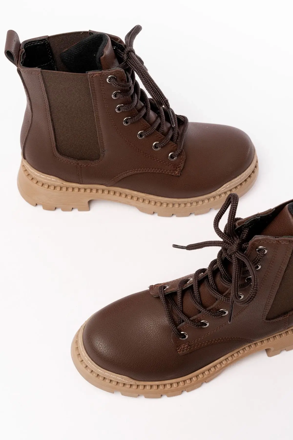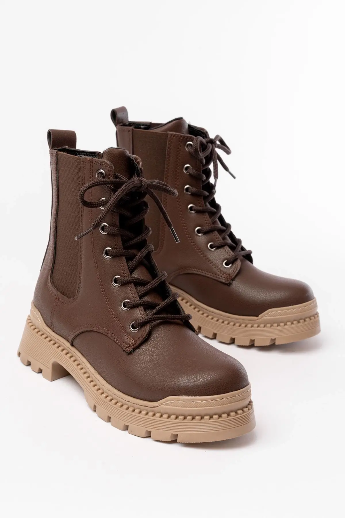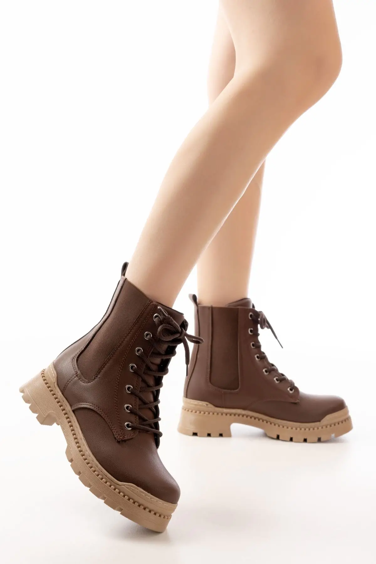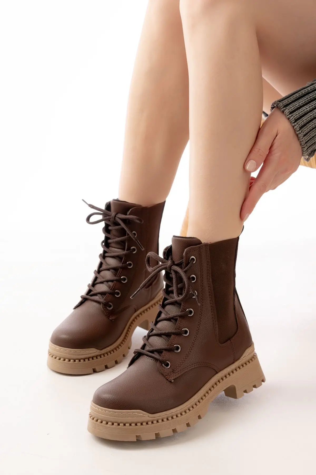 Kahverengi Düz Topuklu Bağcıklı Lastikli Günlük Kadın Bot