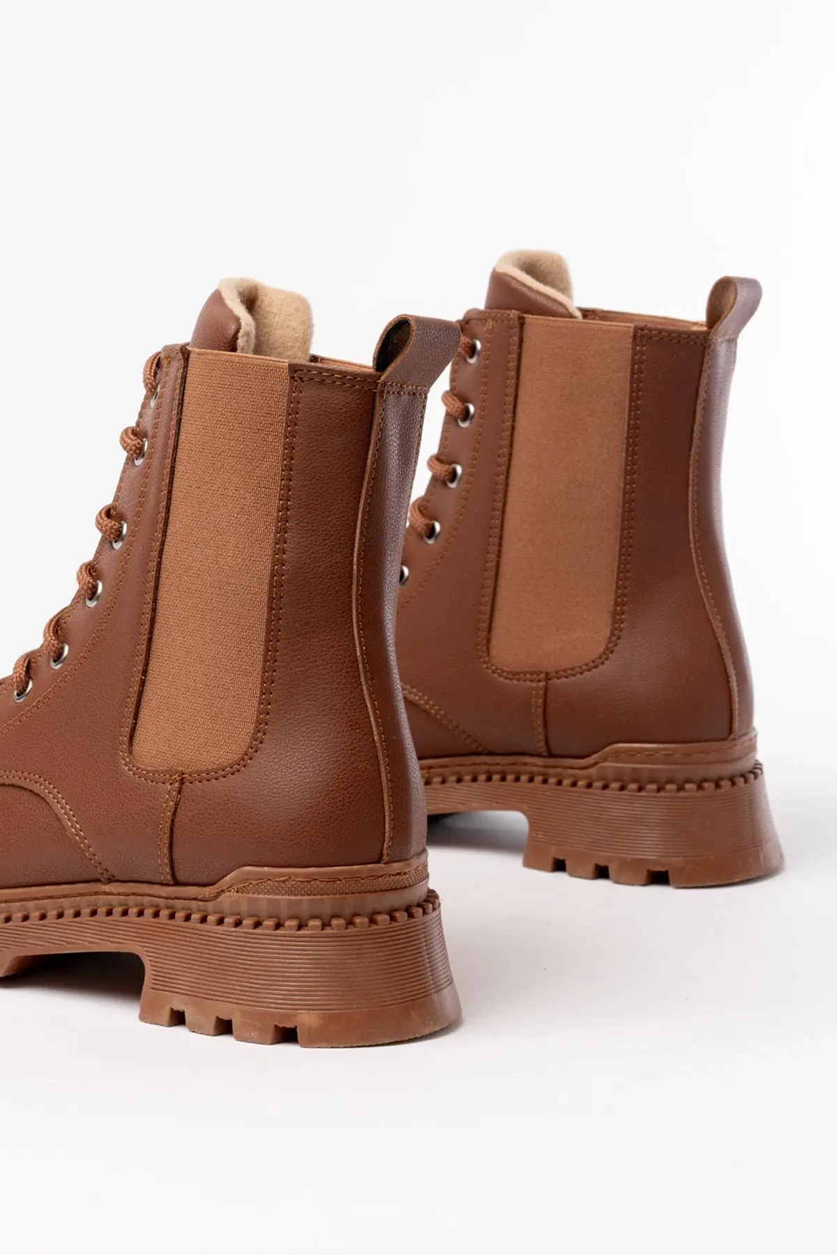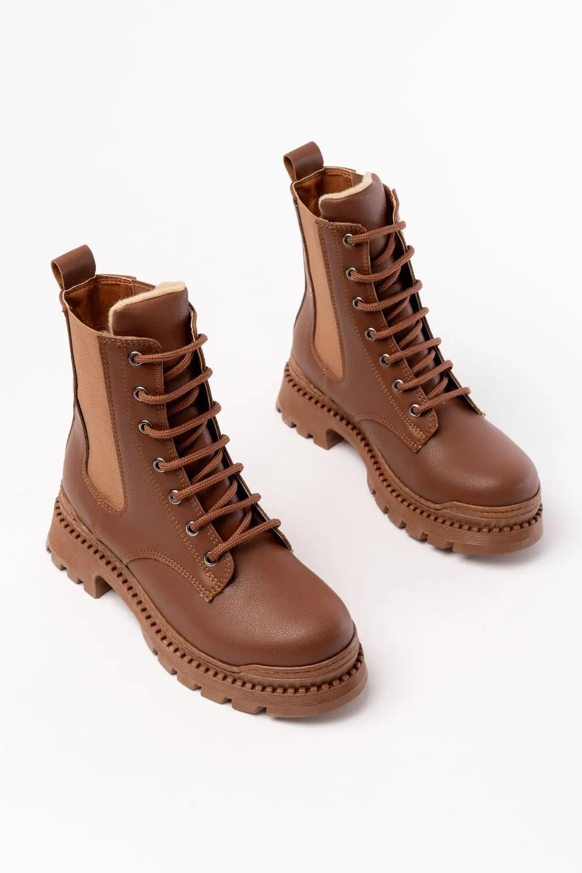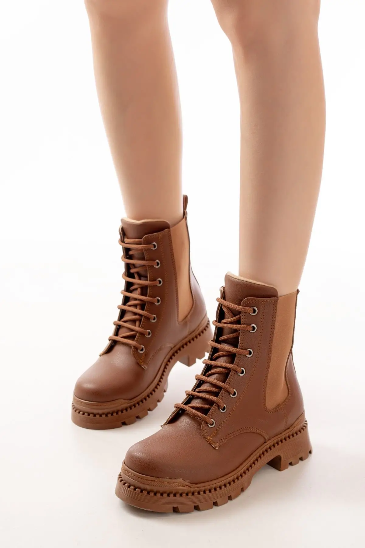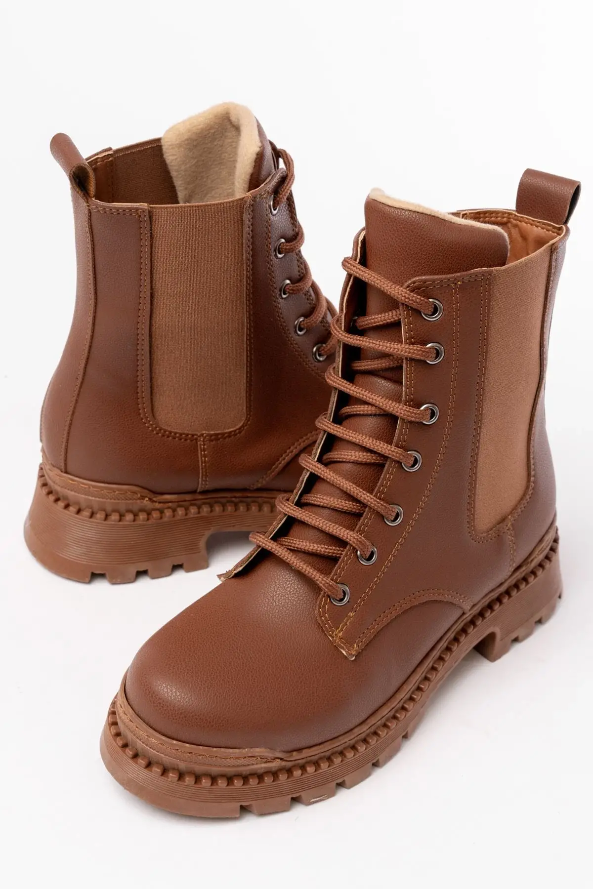 Taba Düz Topuklu Bağcıklı Lastikli Günlük Kadın Bot