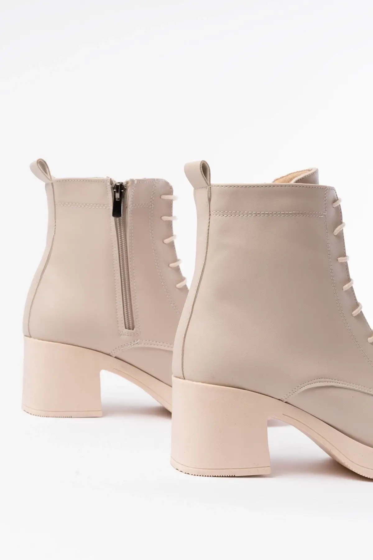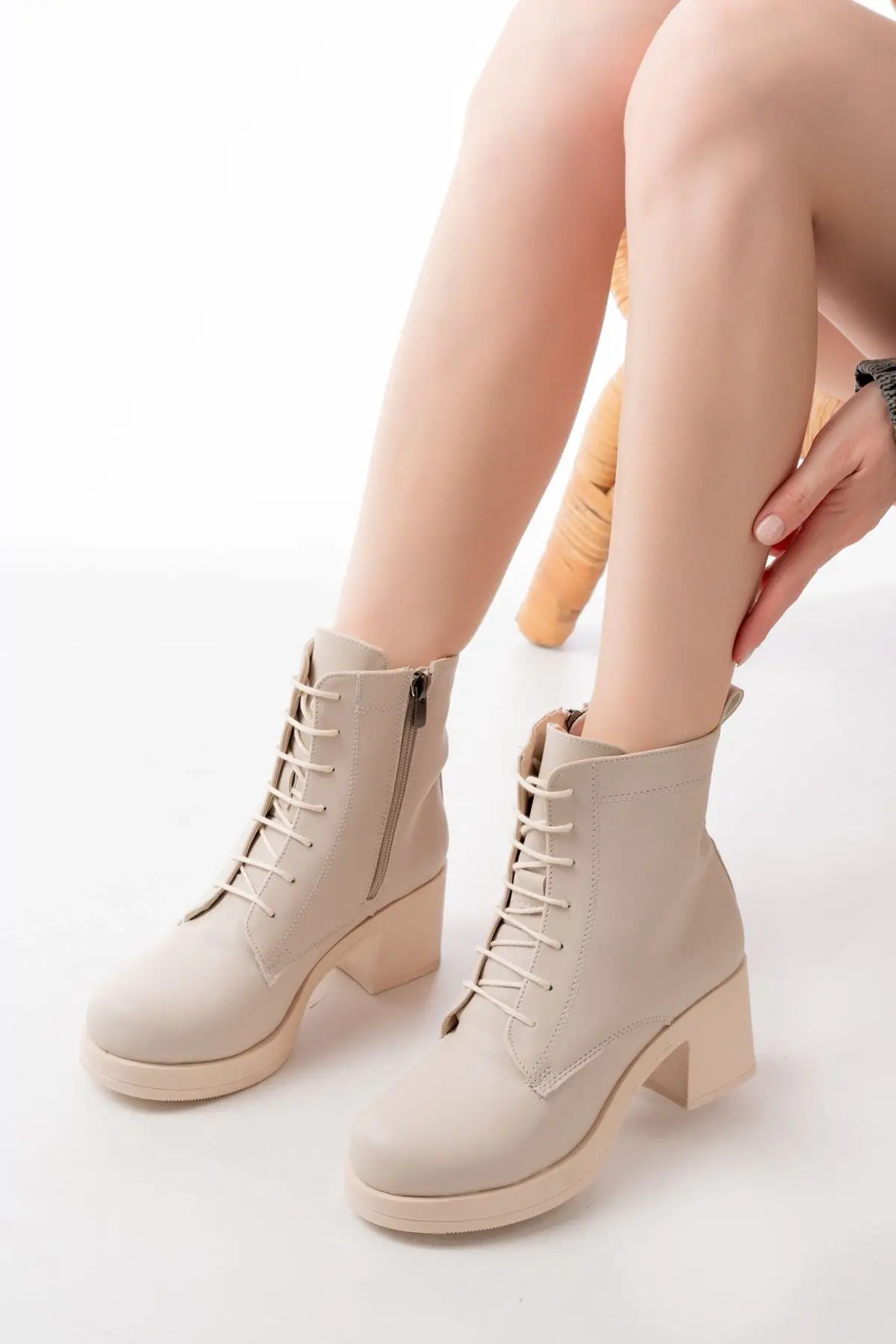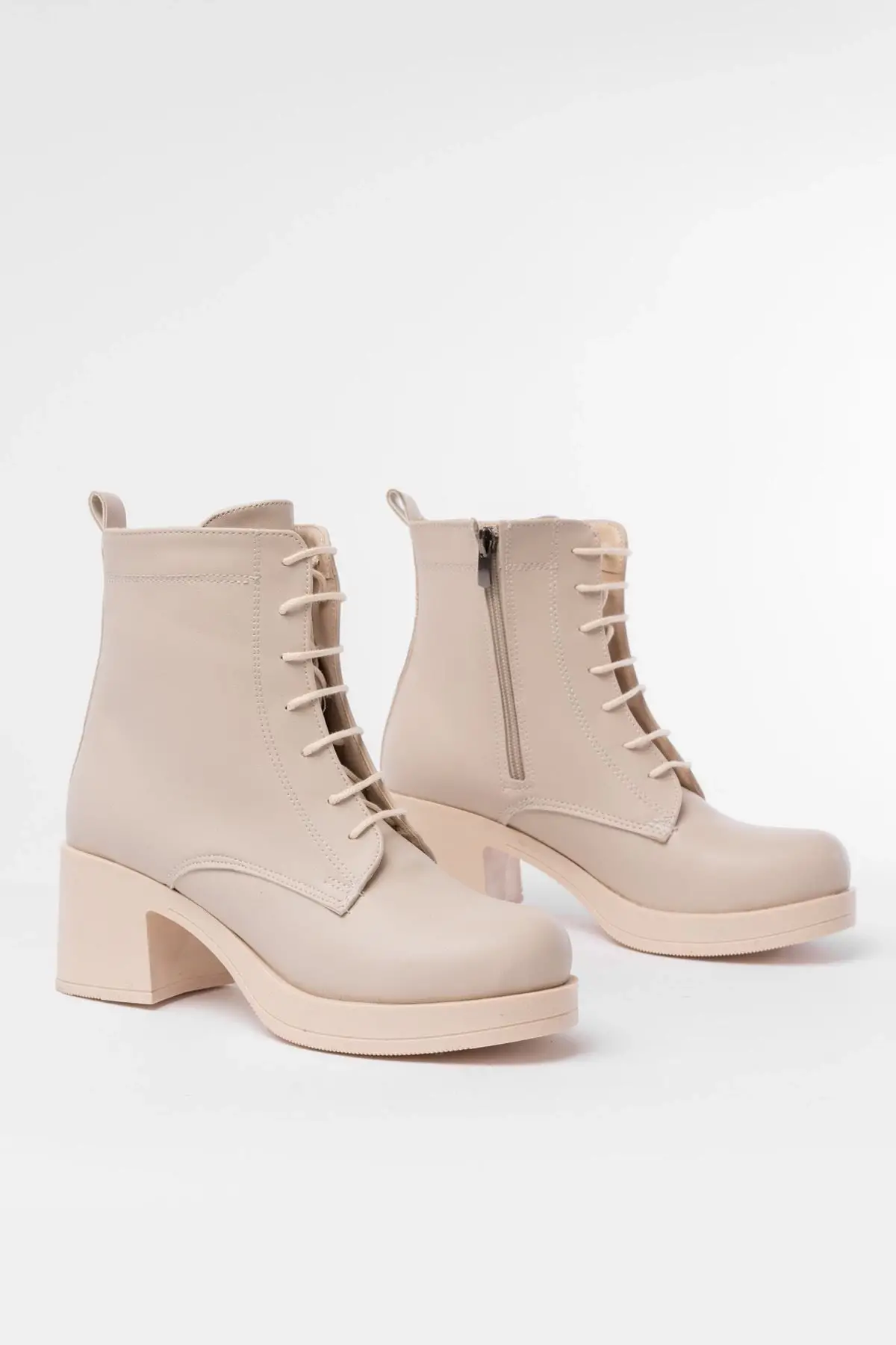 Bej Bağcıklı Fermuarlı Kalın Topuklu Günlük Kadın Bot