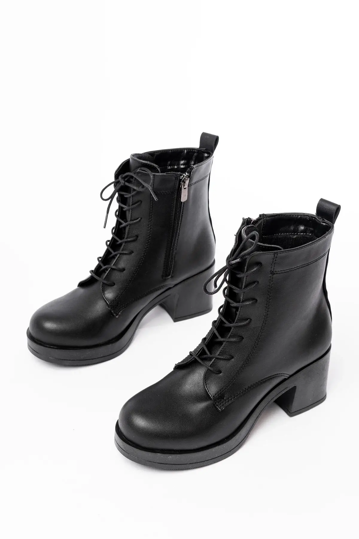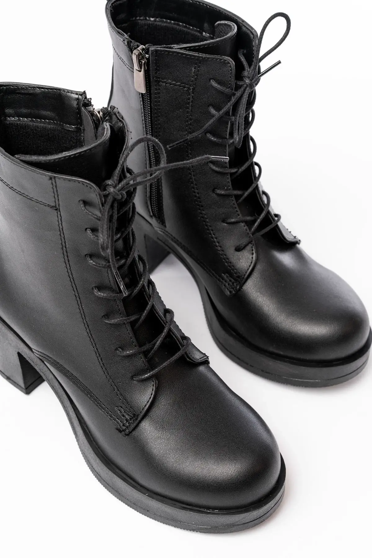 Siyah Bağcıklı Fermuarlı Kalın Topuklu Günlük Kadın Bot