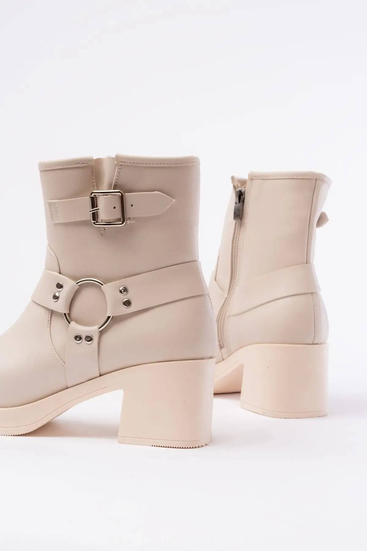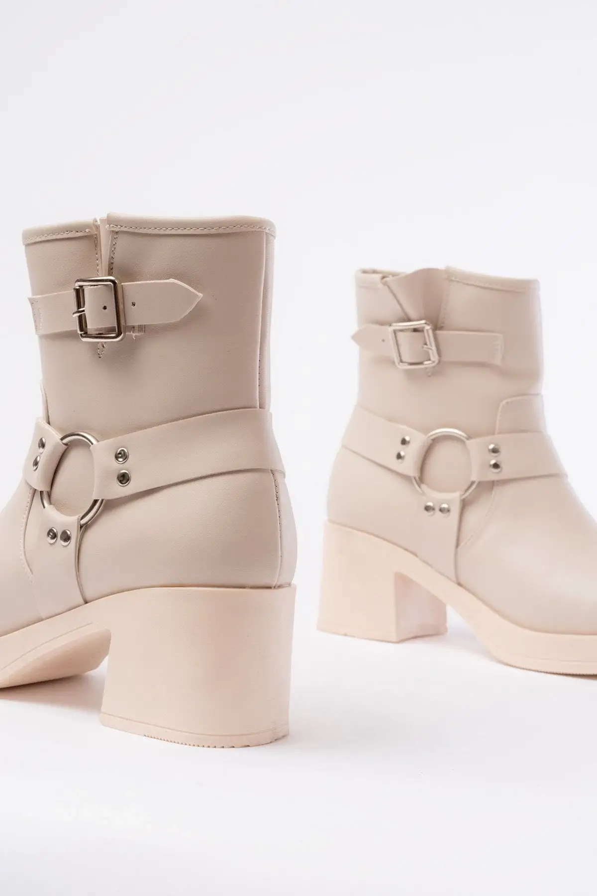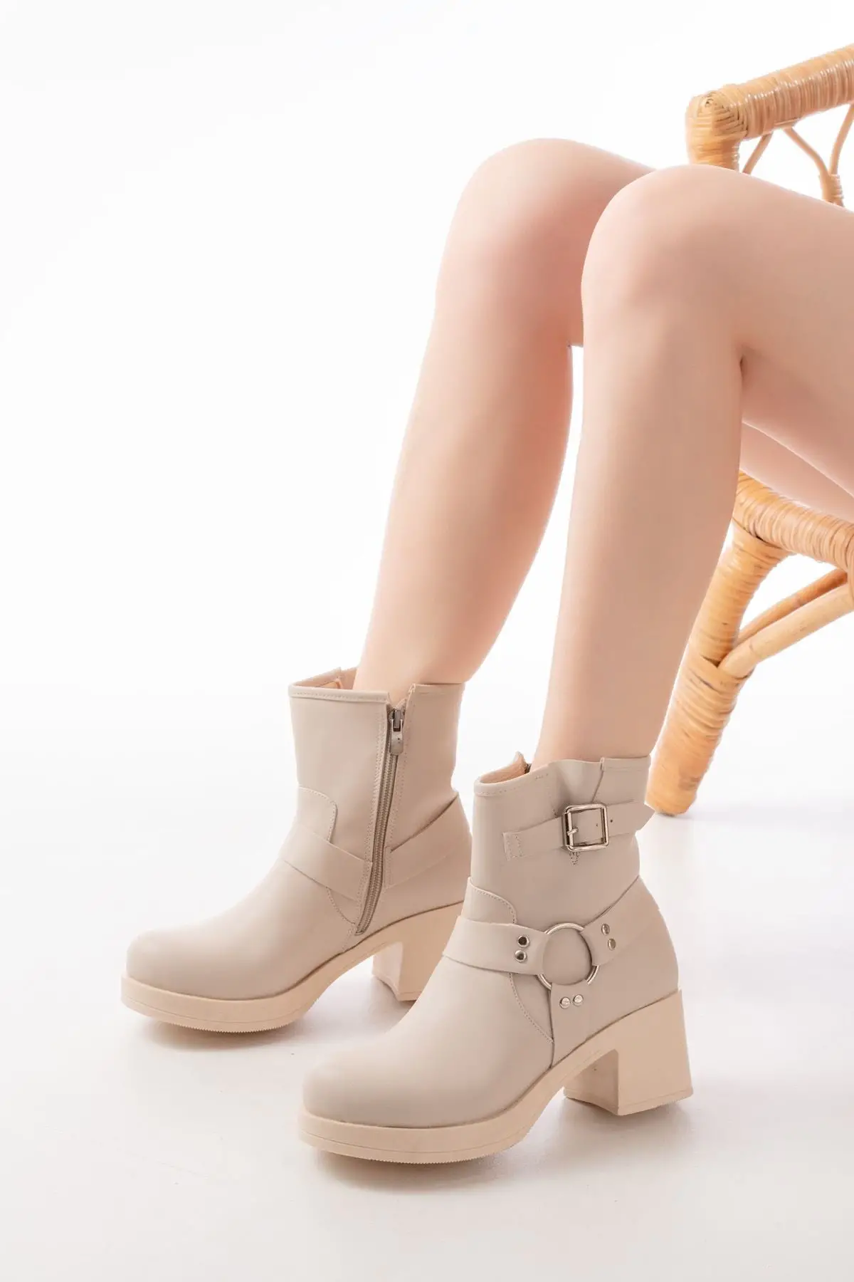 Bej Toka Aksesuarlı Fermuarlı Kalın Topuklu Günlük Kadın Bot