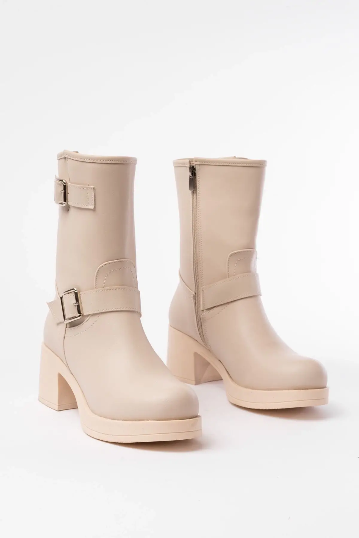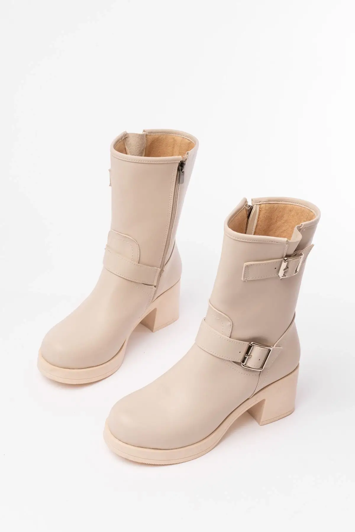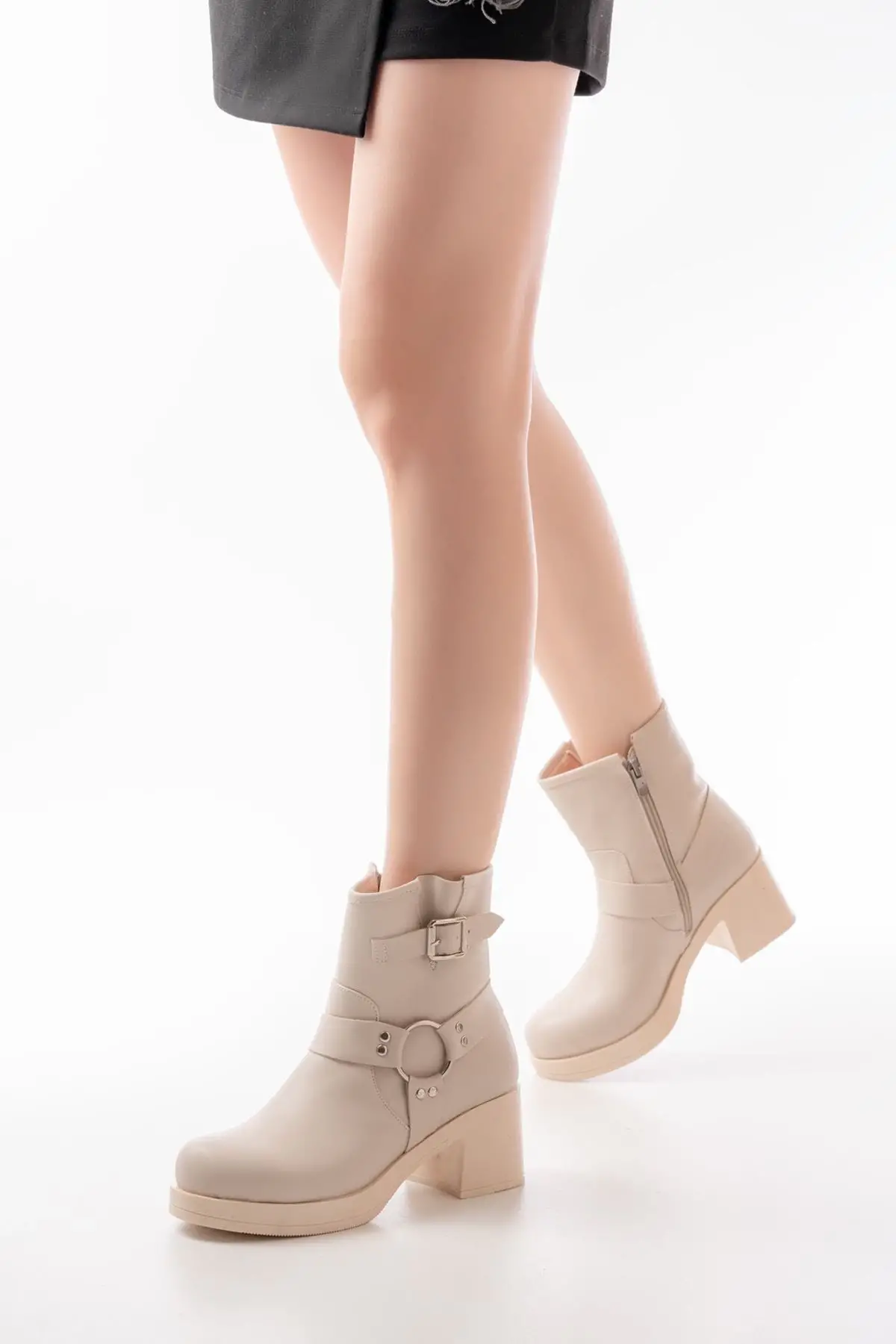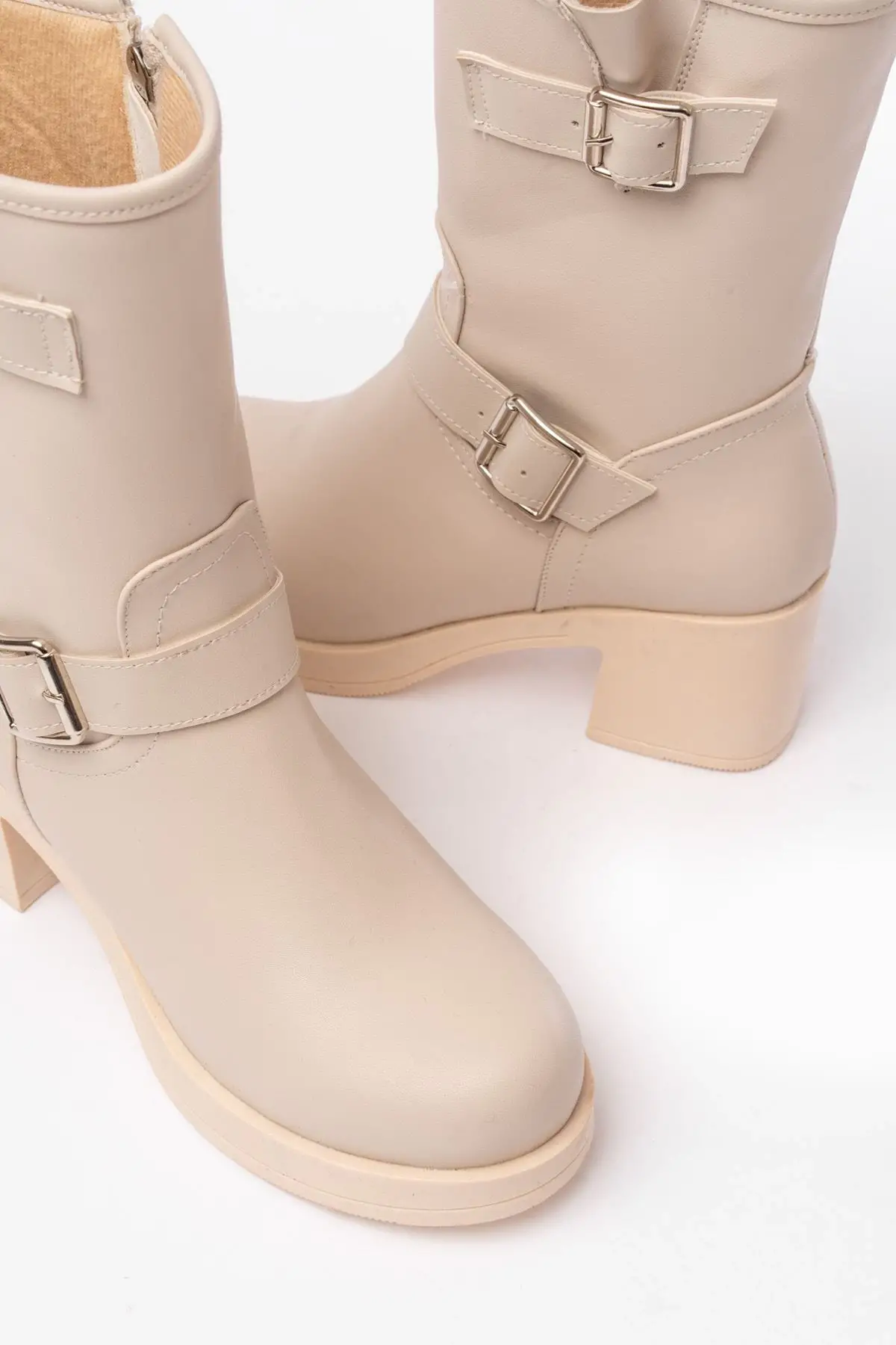 Bej Toka Aksesuarlı Fermuarlı Kalın Topuklu Günlük Kadın Bot