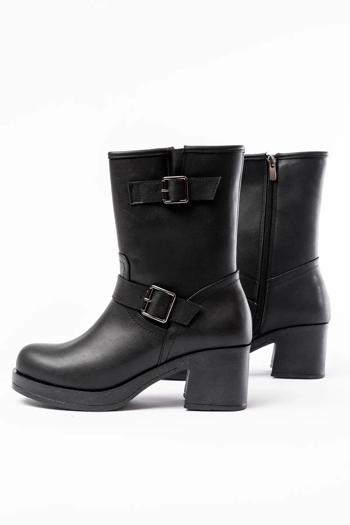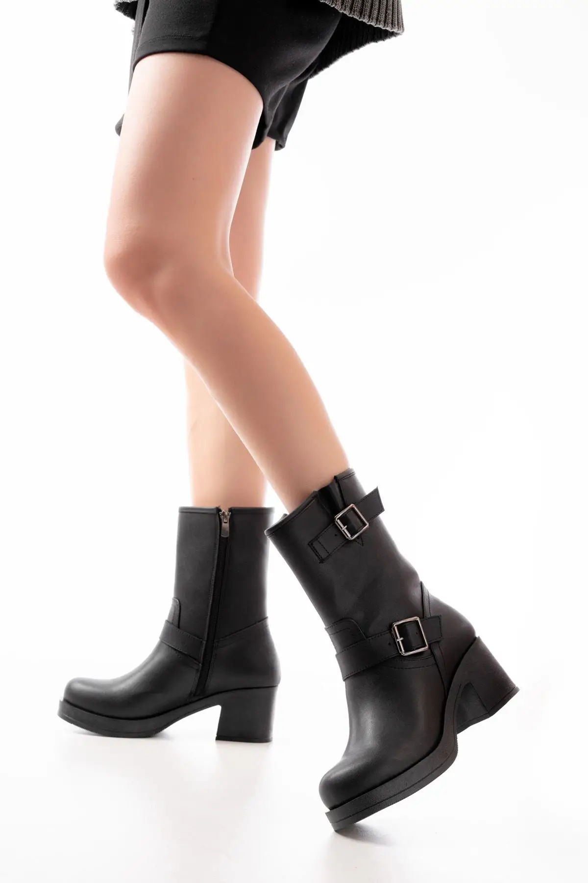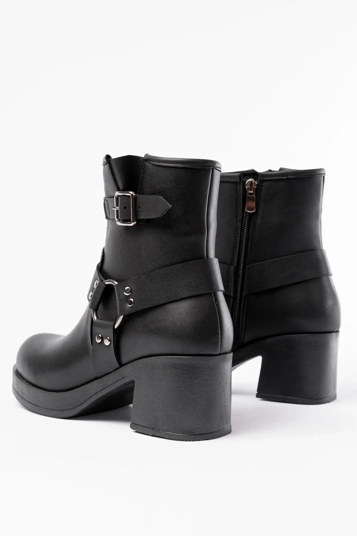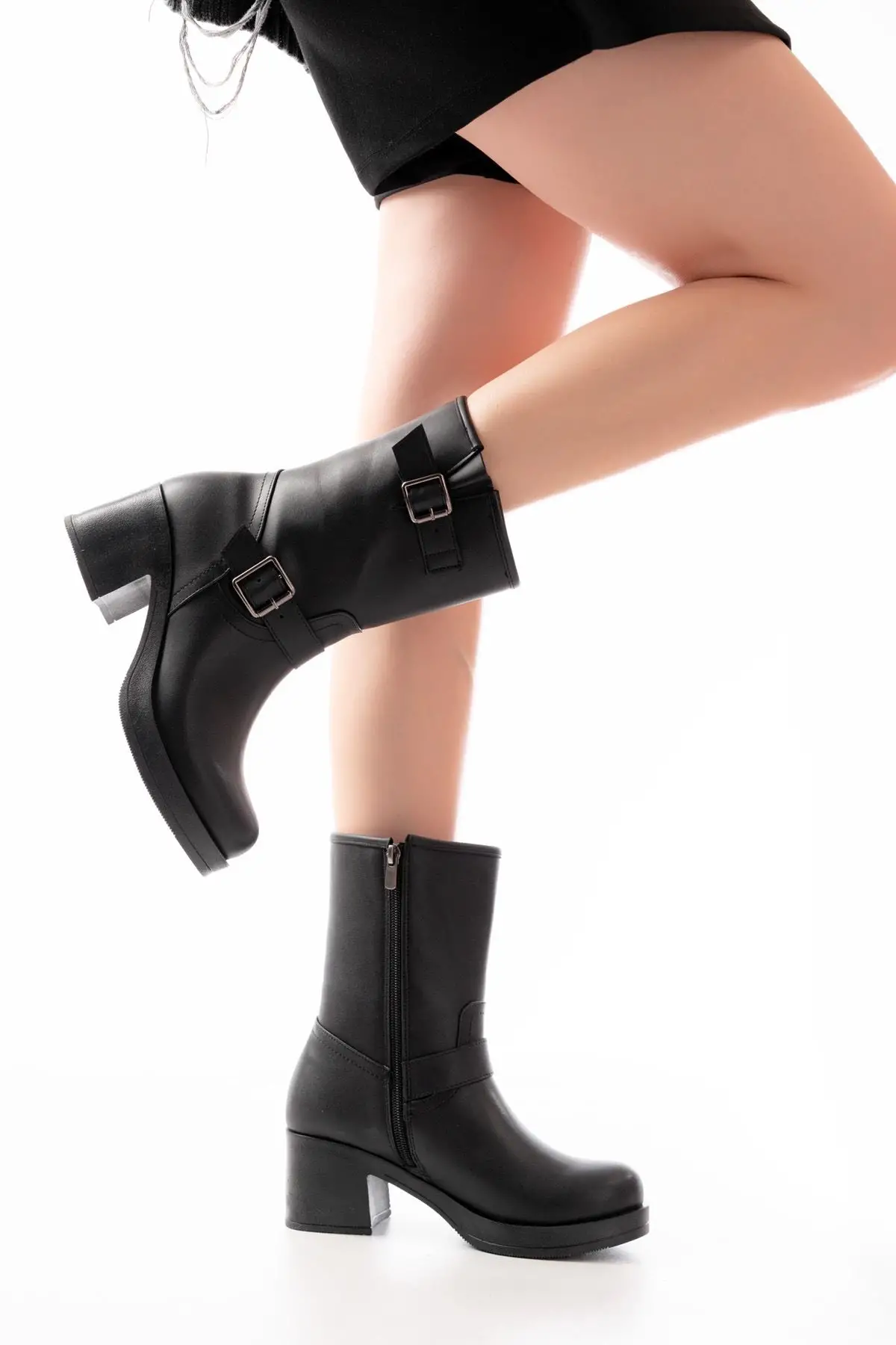 Siyah Toka Aksesuarlı Fermuarlı Kalın Topuklu Günlük Kadın Bot