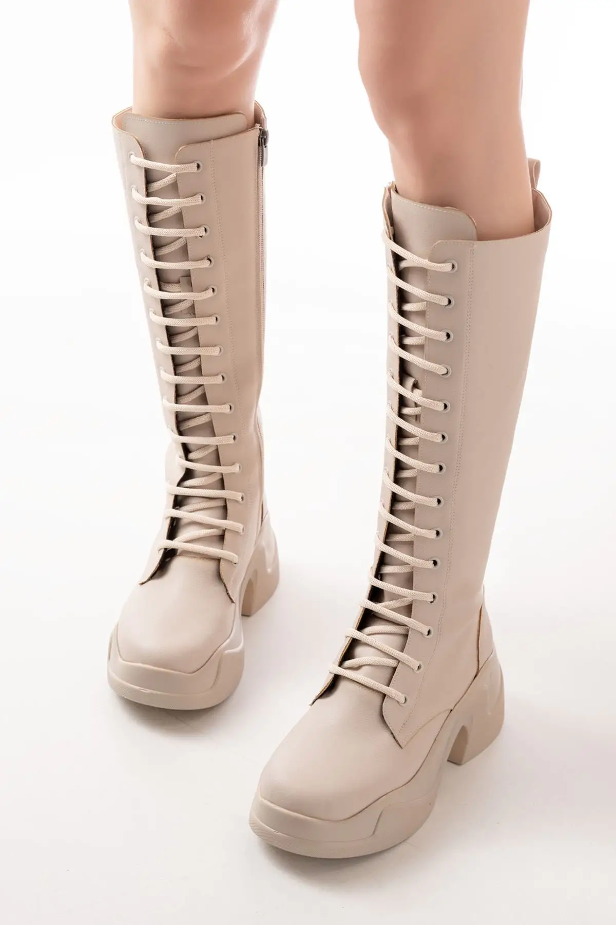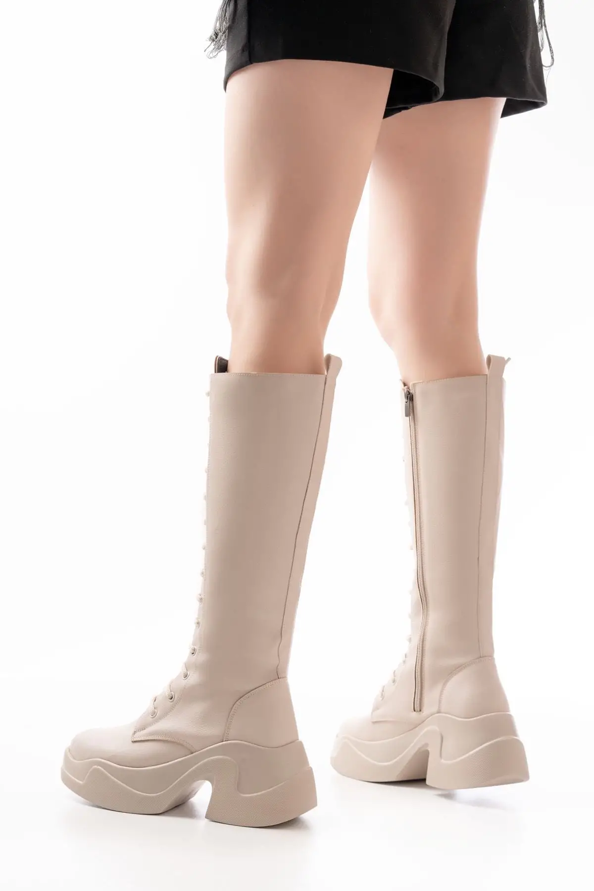 Bej Yüksek Tabanlı Bağcıklı Fermuarlı Günlük Kadın Çizme