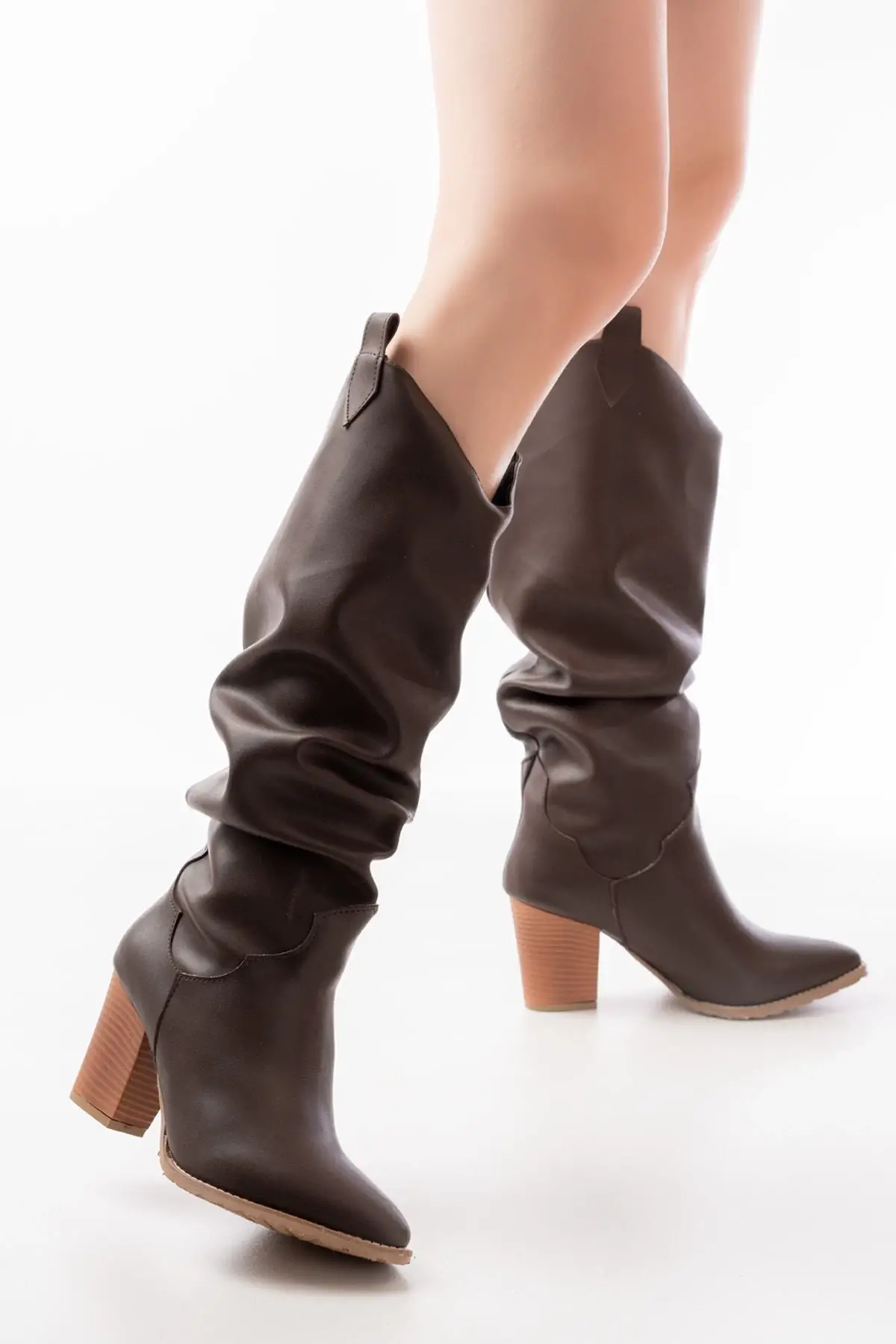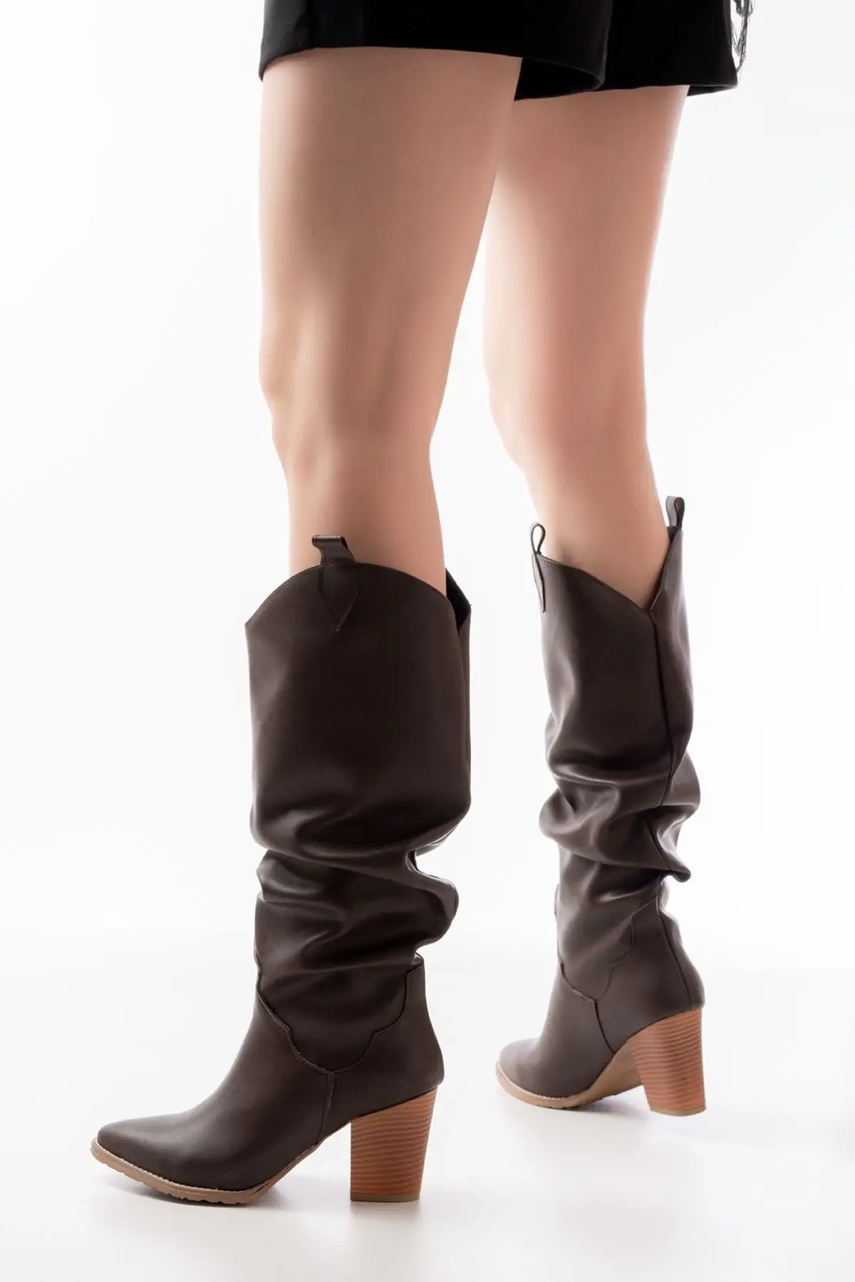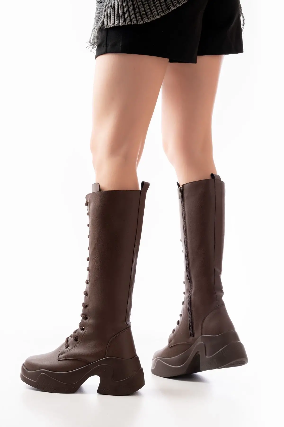 Kahverengi Yüksek Tabanlı Bağcıklı Fermuarlı Günlük Kadın Çizme