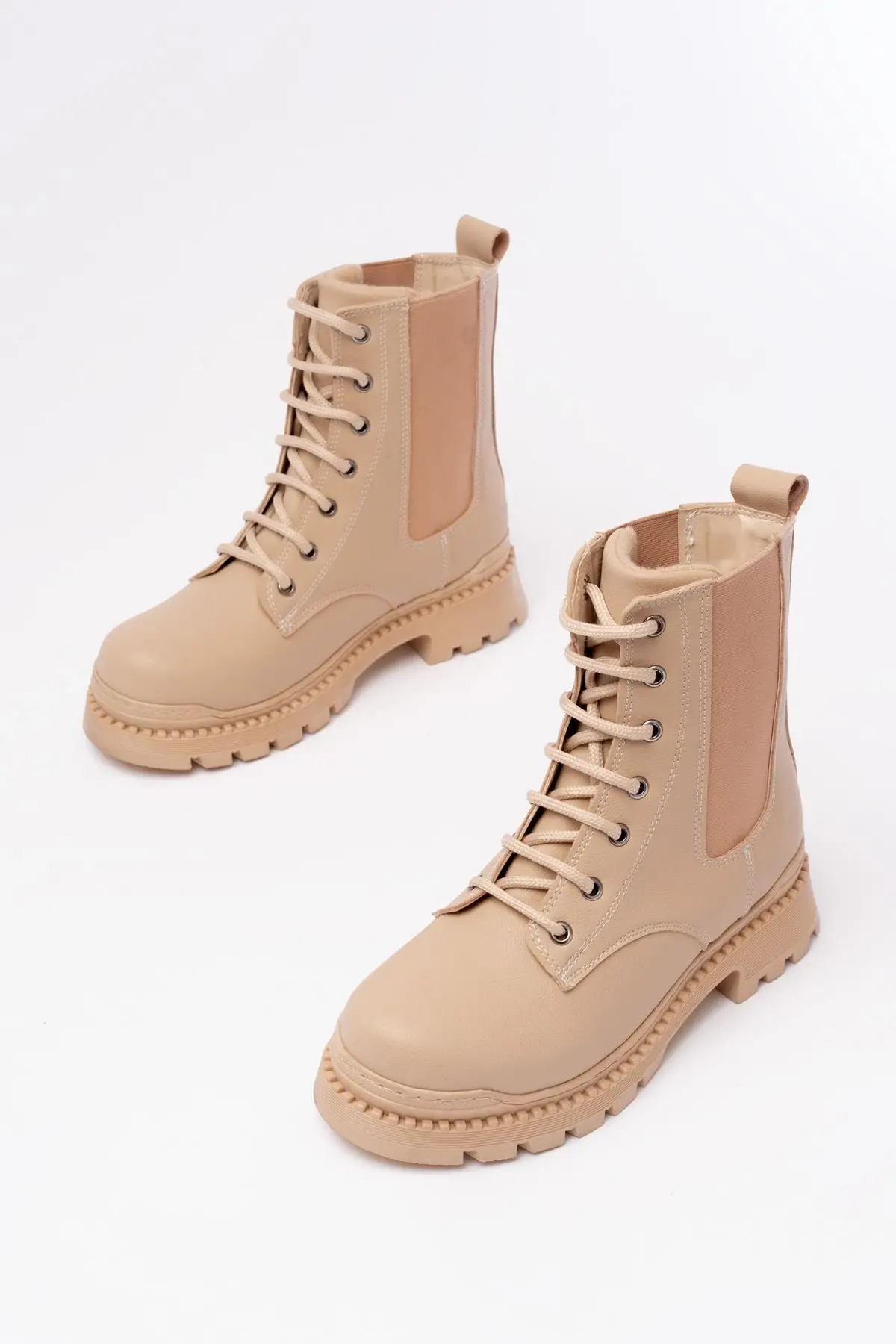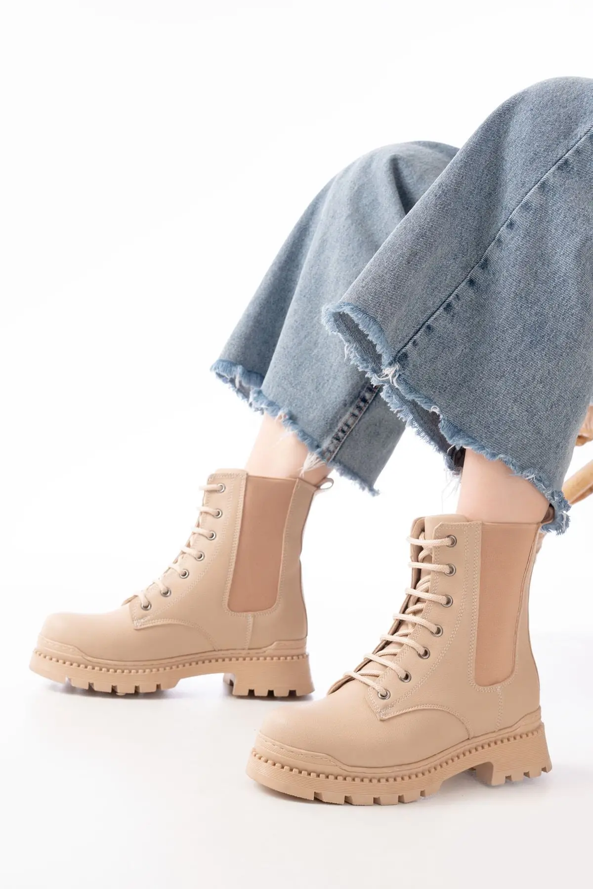 Bej Düz Topuklu Bağcıklı Lastikli Günlük Kadın Bot