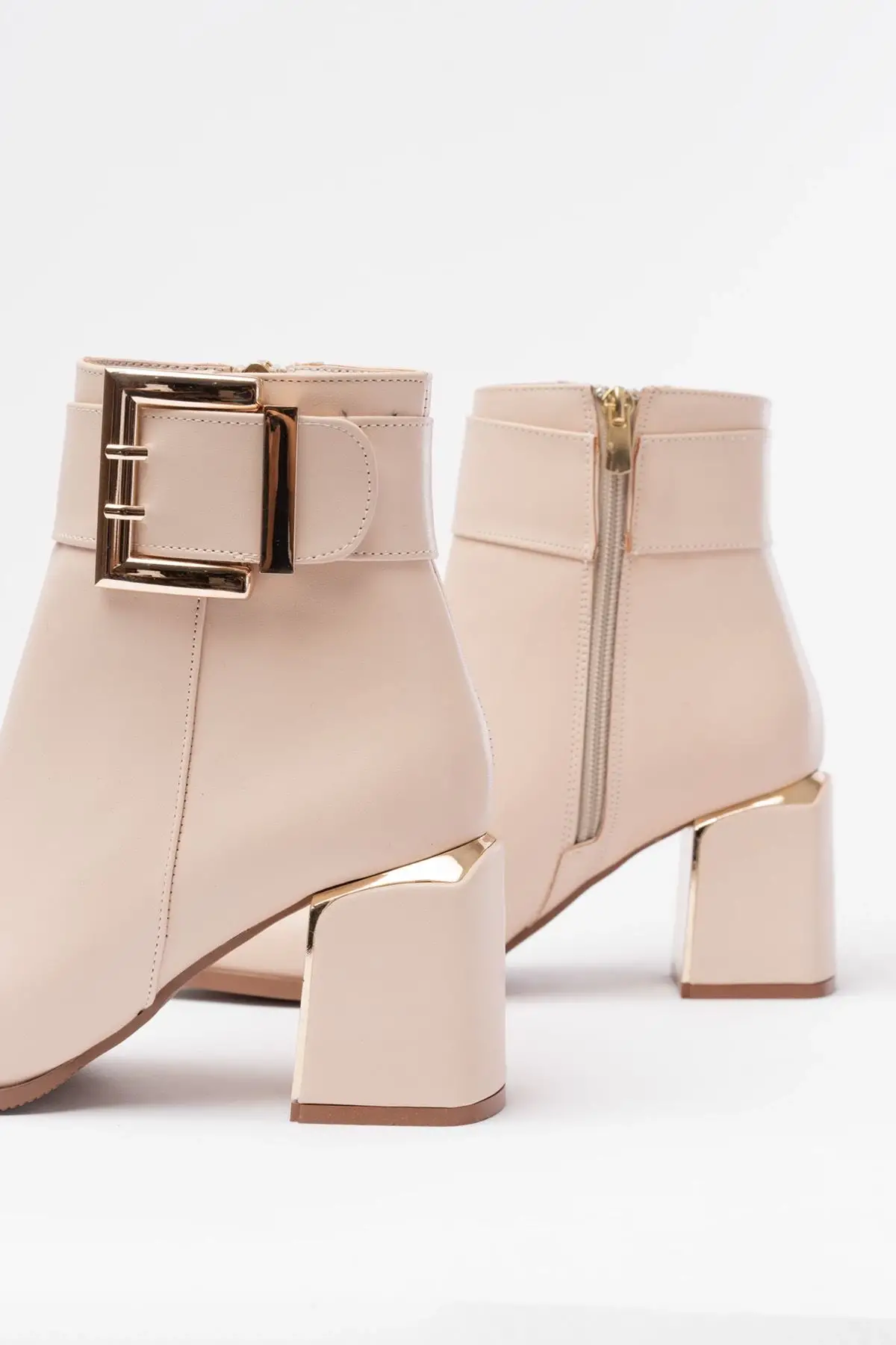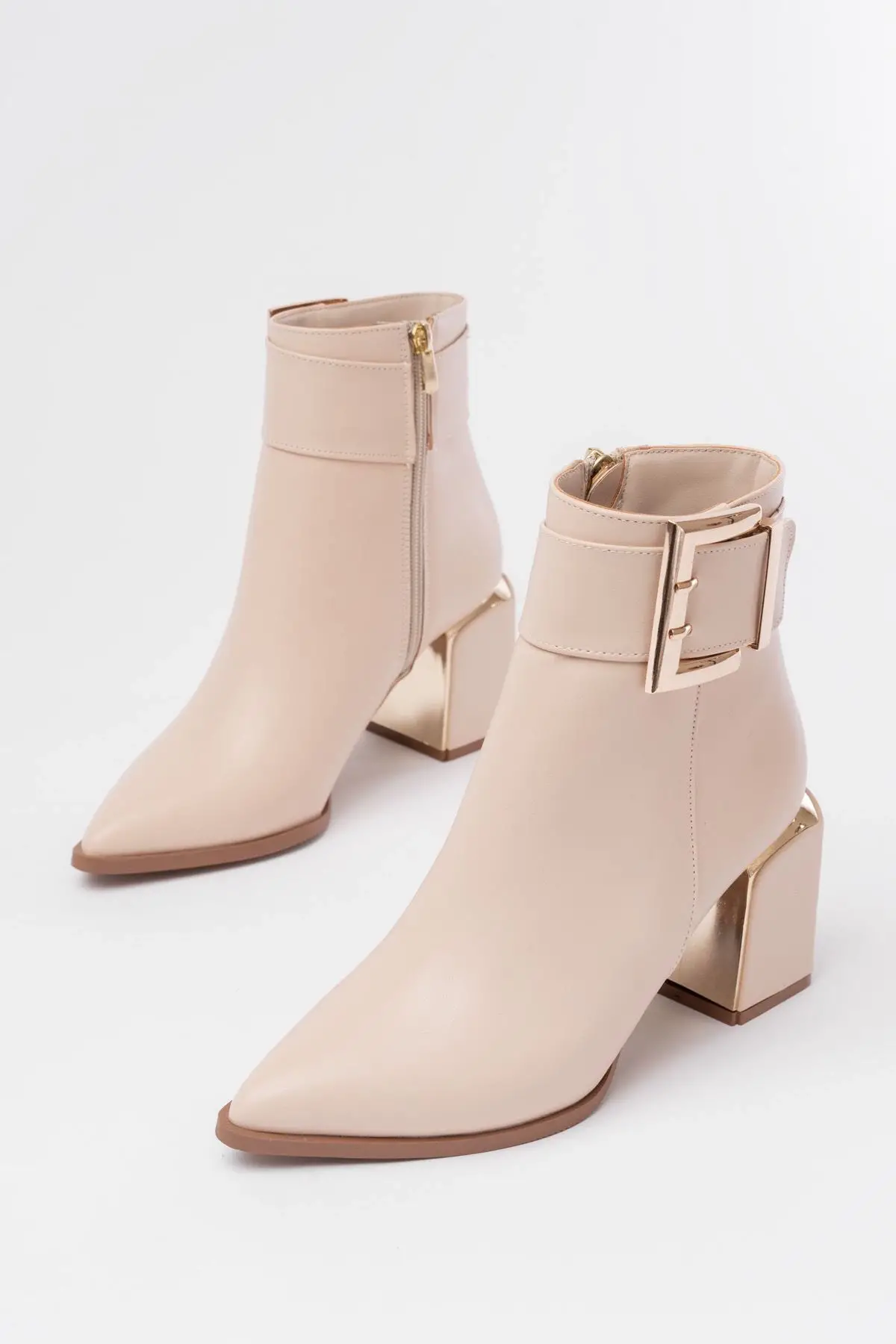 Bej Toka Aksesuarlı Topuklu Fermuarlı Günlük Kadın Bot