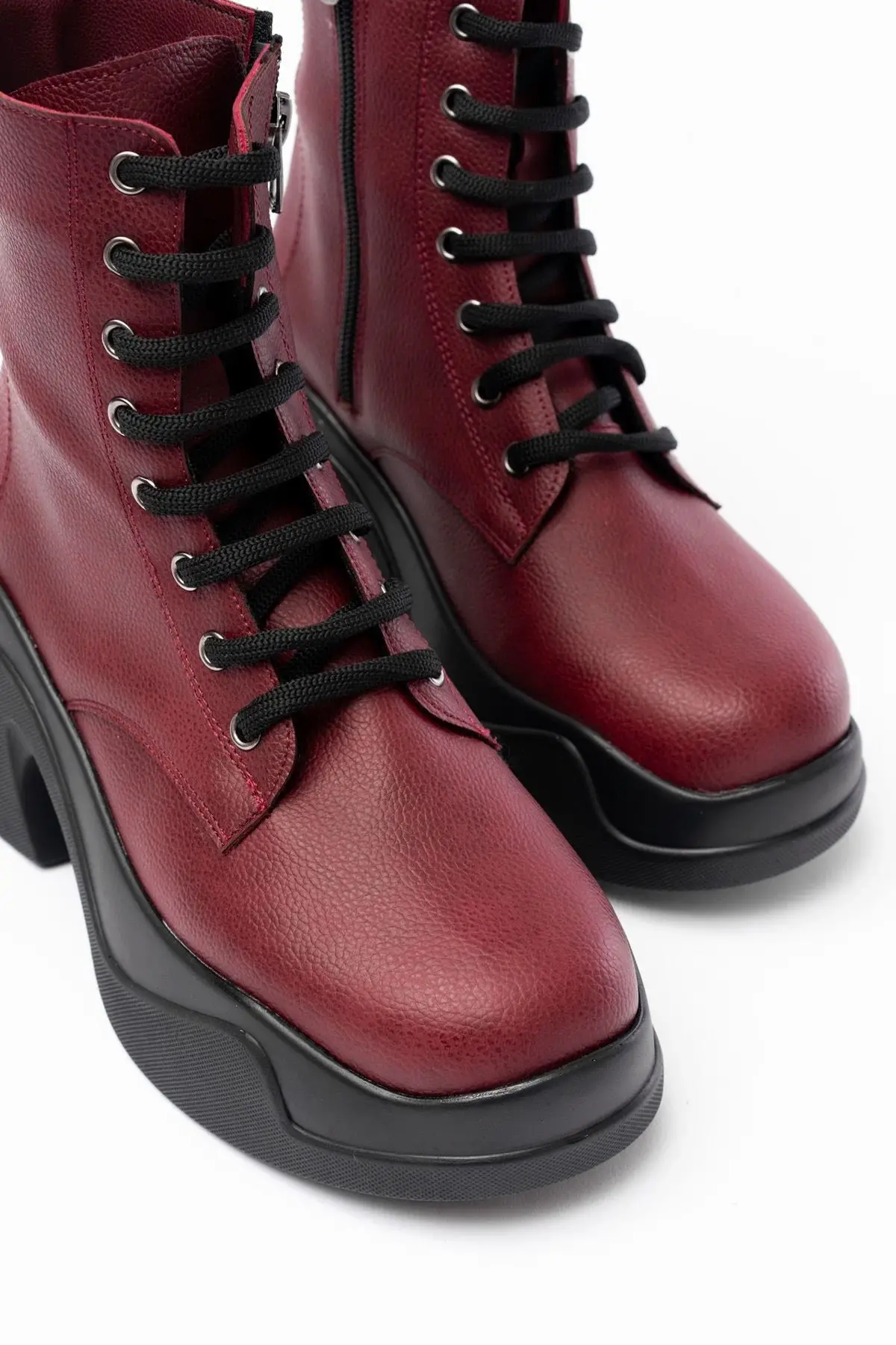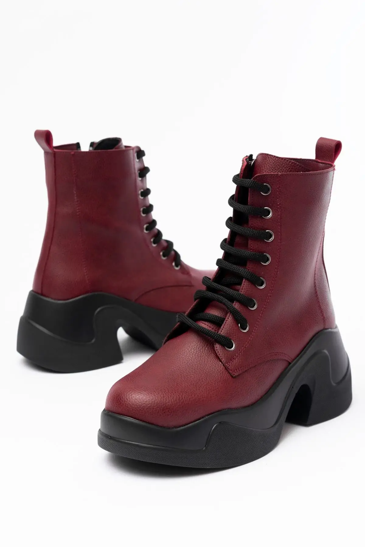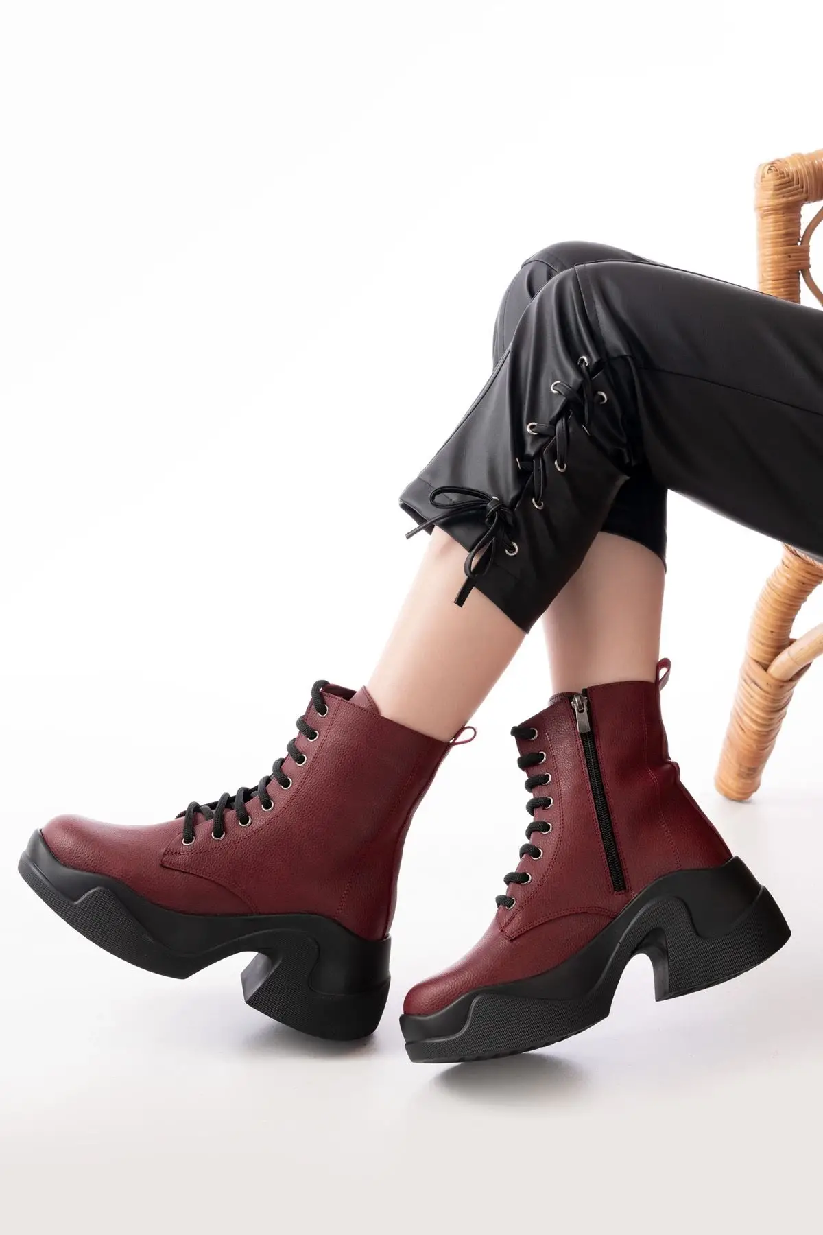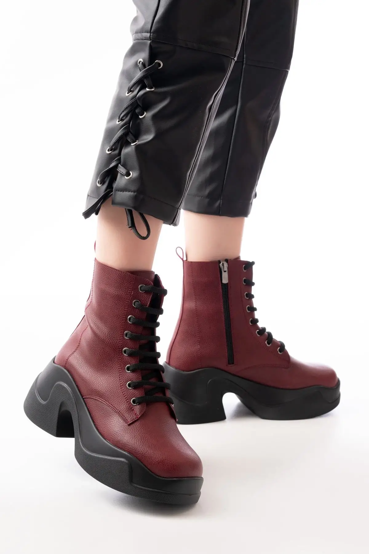 Bordo Yüksek Tabanlı Bağcıklı Fermuarlı Günlük Kadın Bot