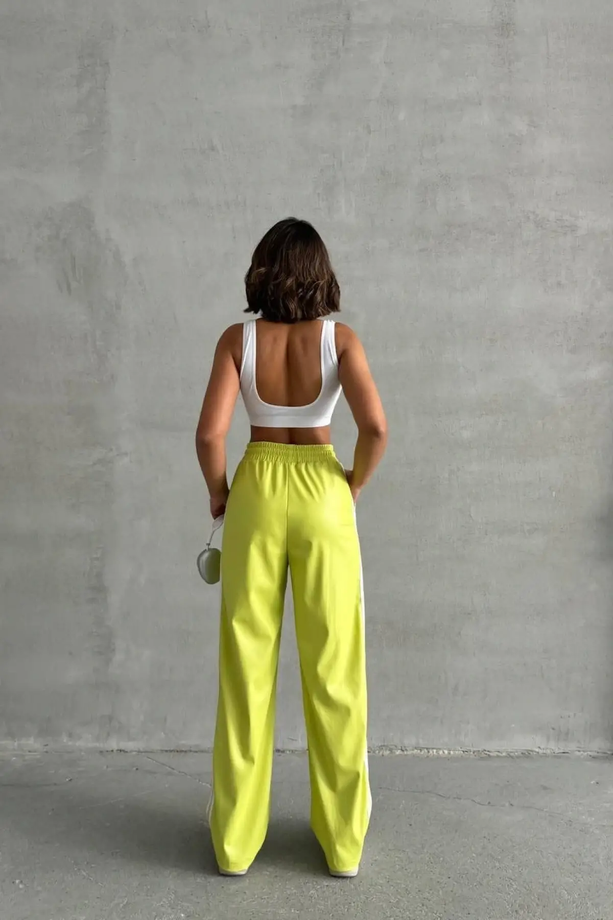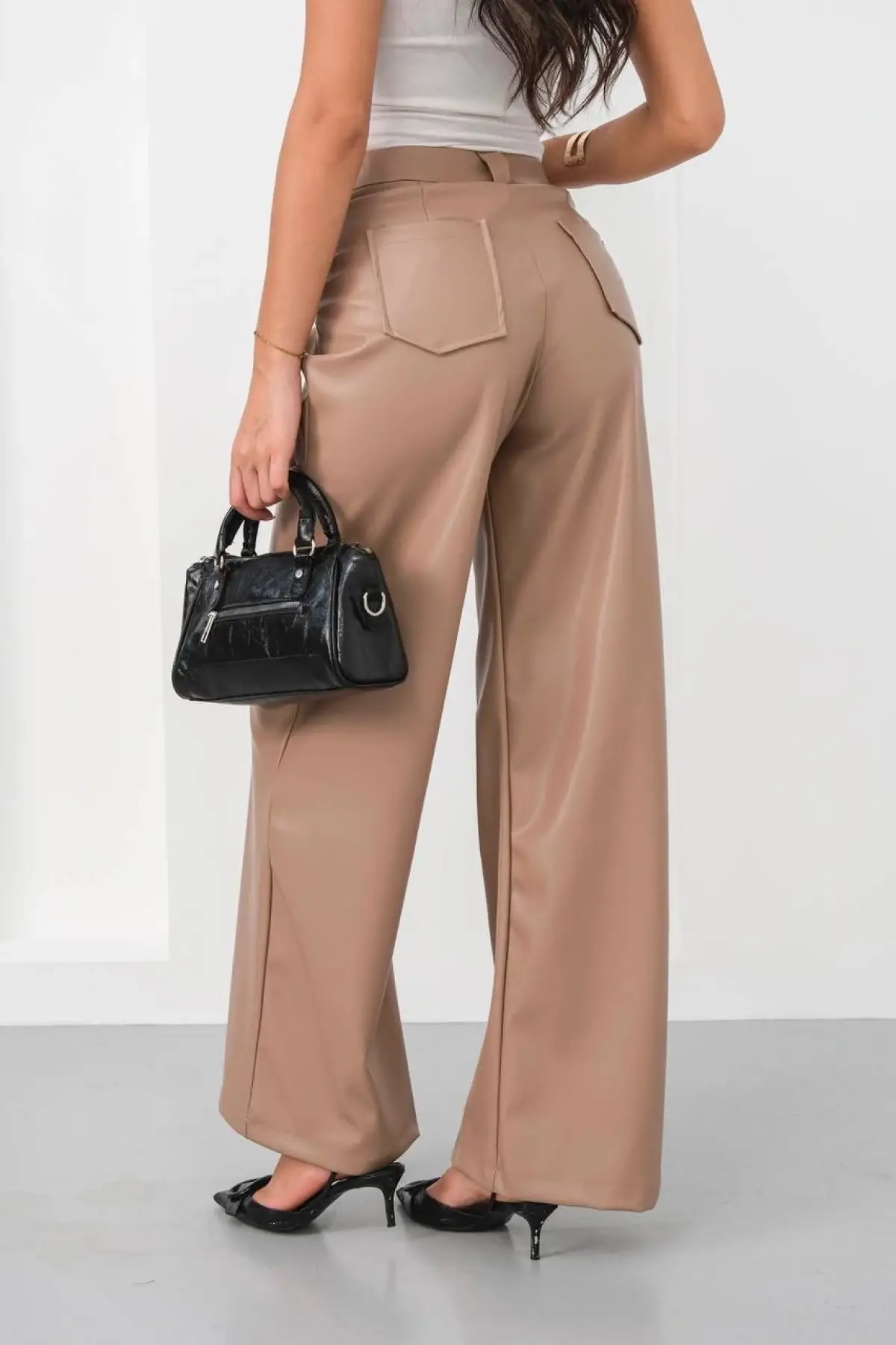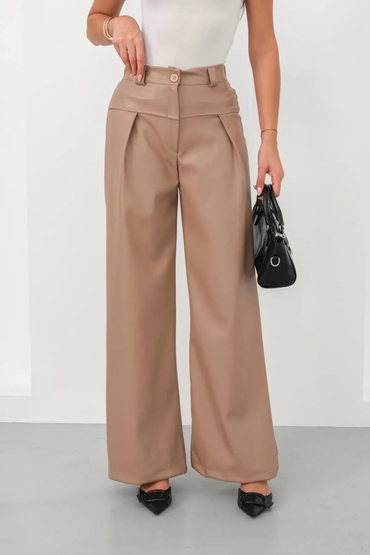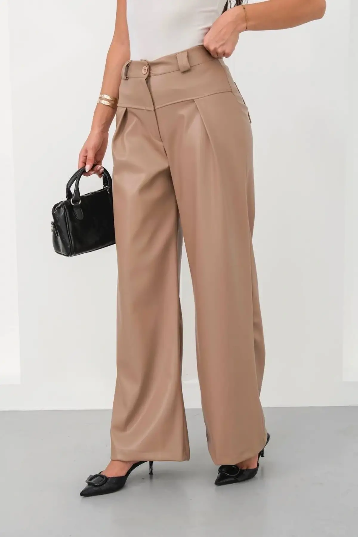 Deri Geniş Paça Beli Lastikli Pantolon Bej H263644
