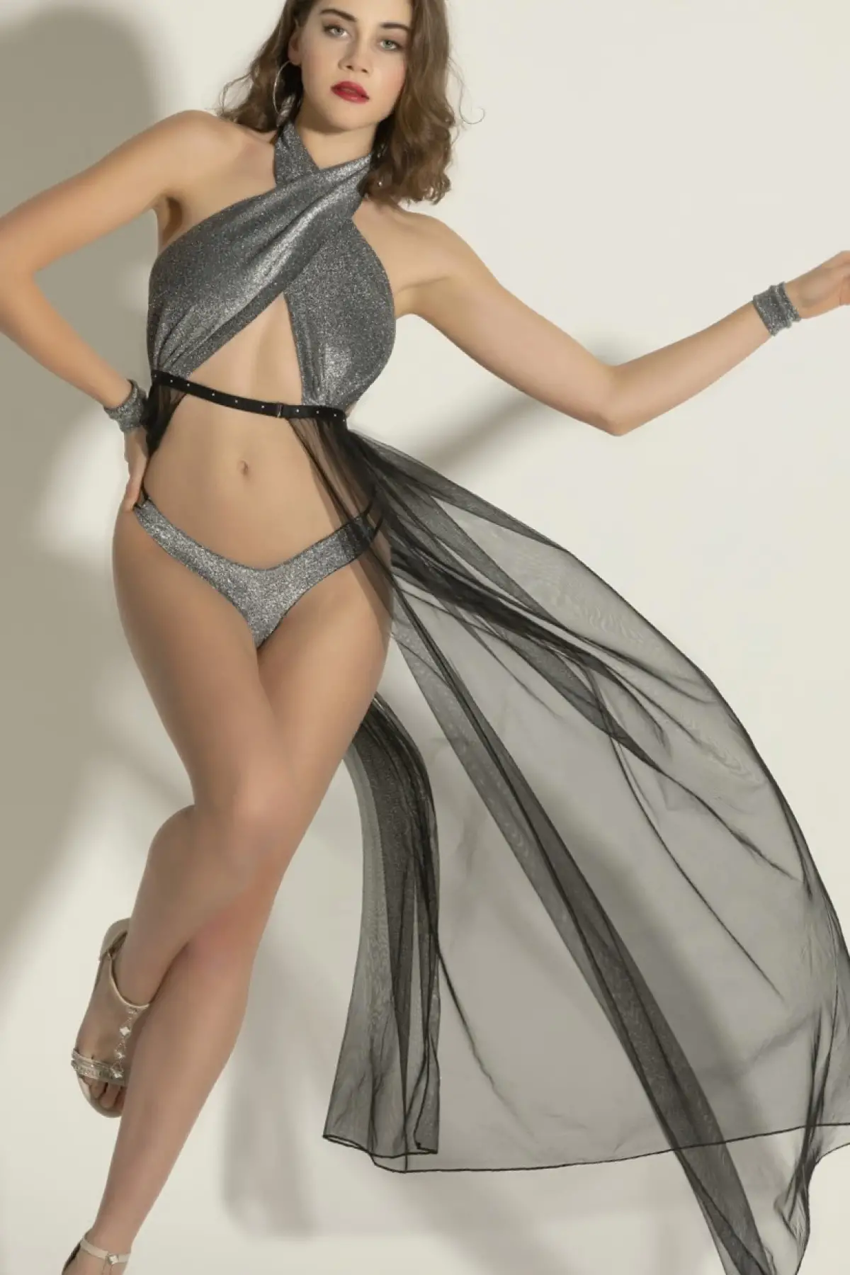 Gümüş Işıltılı Tül Detaylı Seksi Fantezi İç Giyim Seti,3 Parça Seksi Fantazi Kostüm