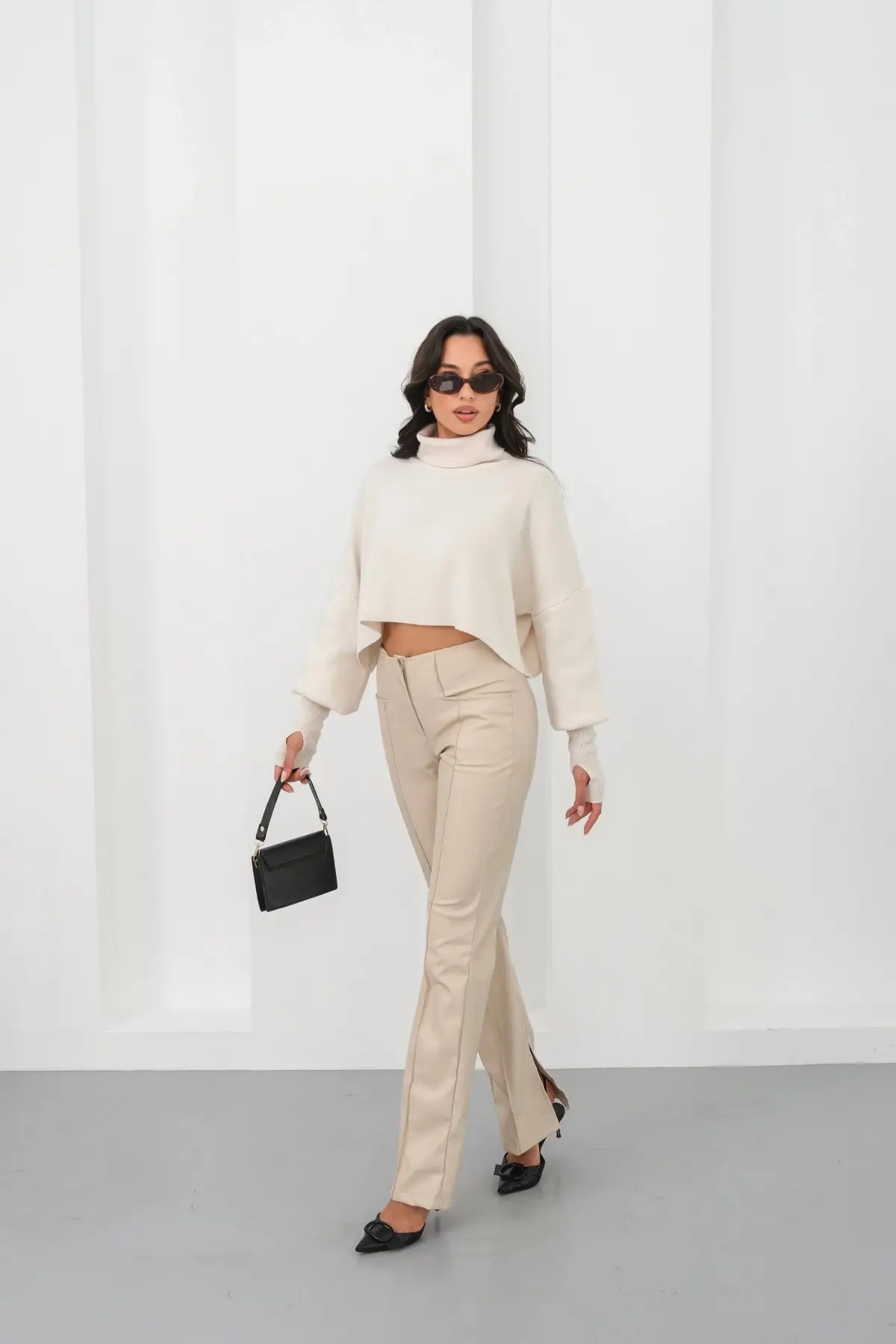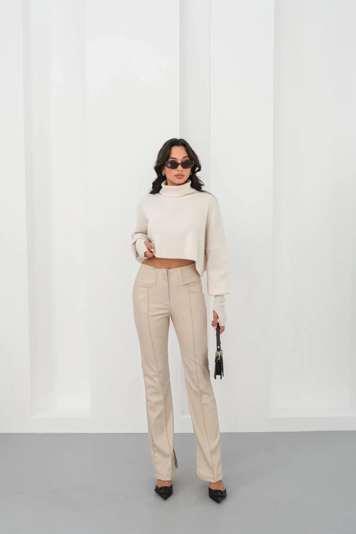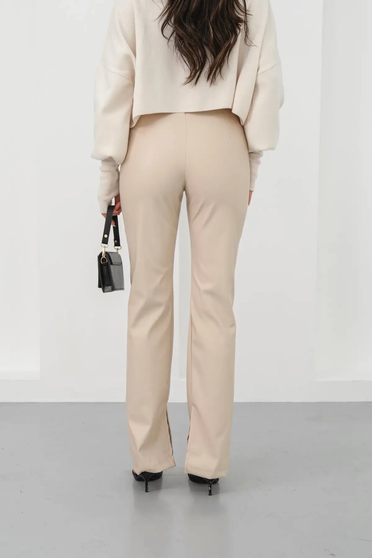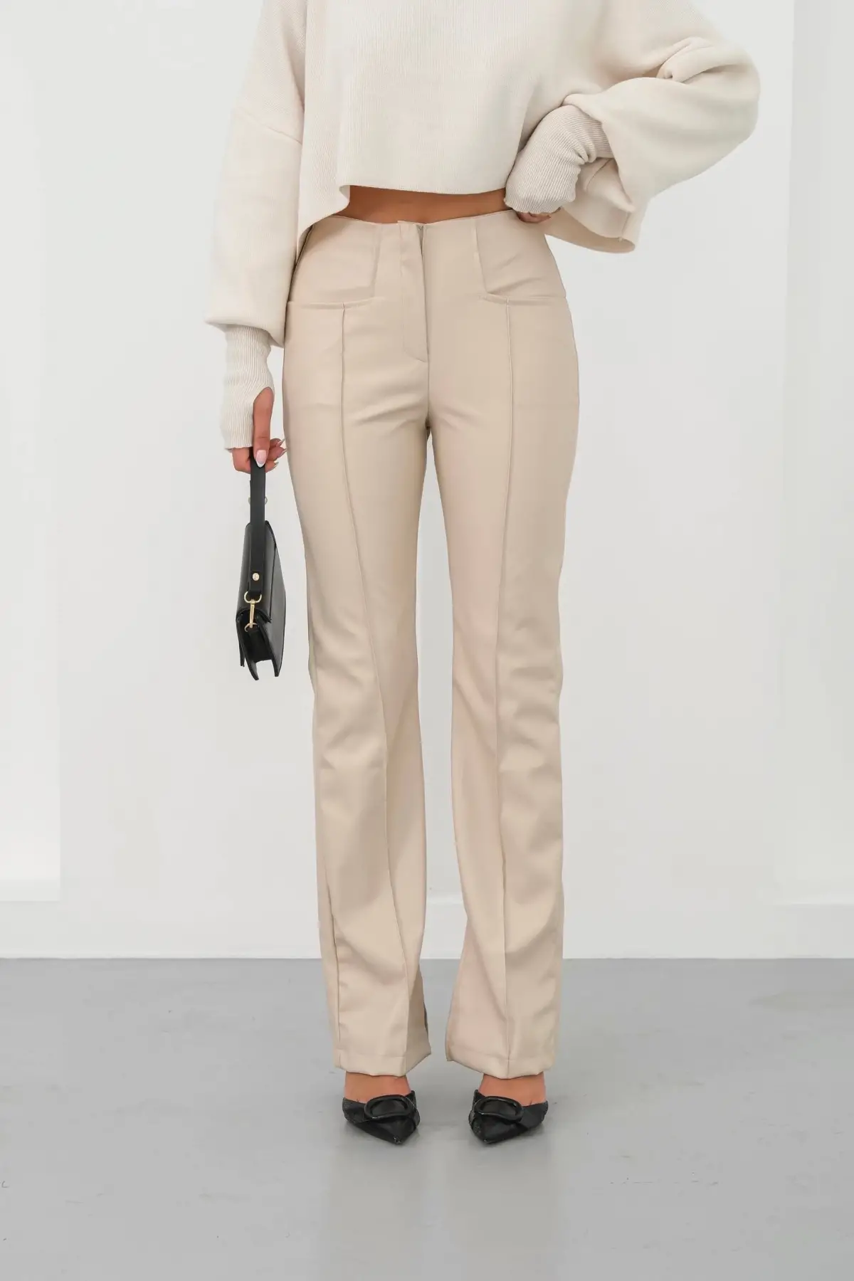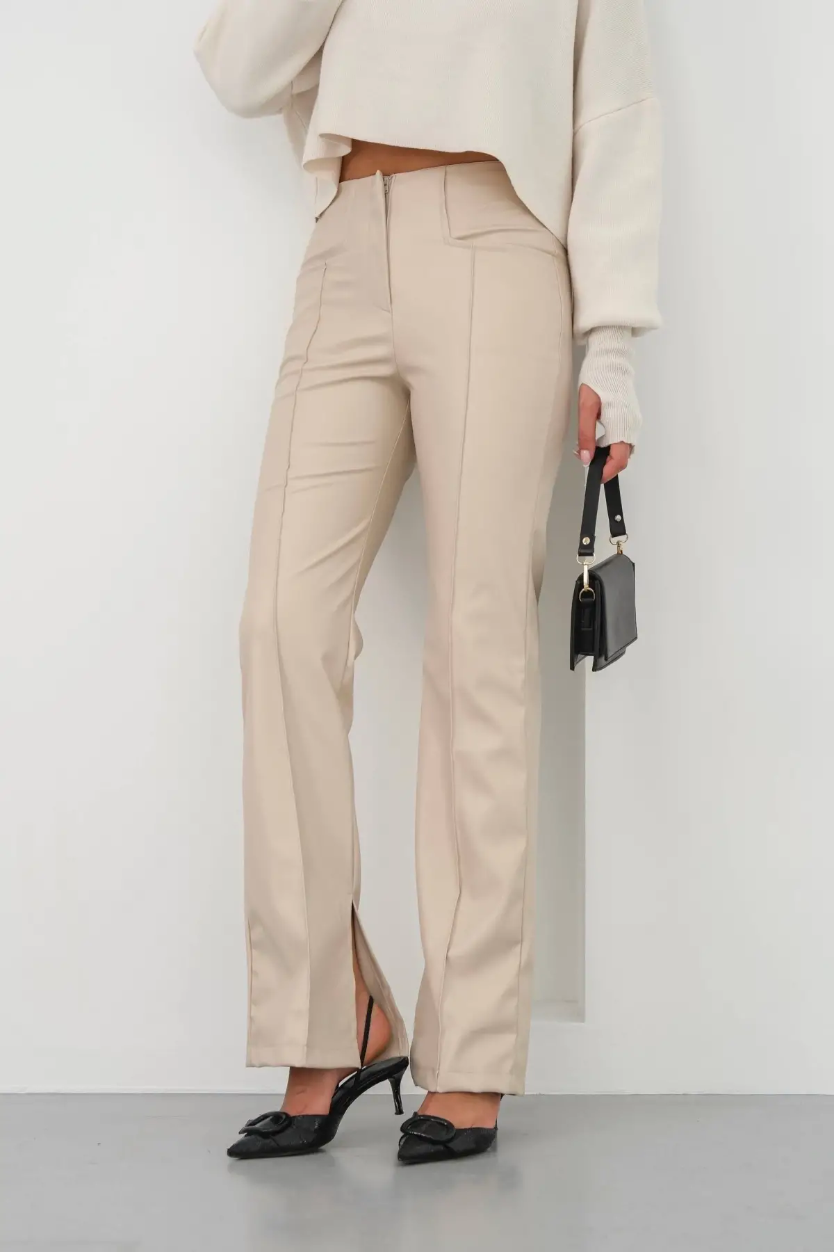 İspanyol Yırtmaçlı Paça Deri Pantolon Bej Hn