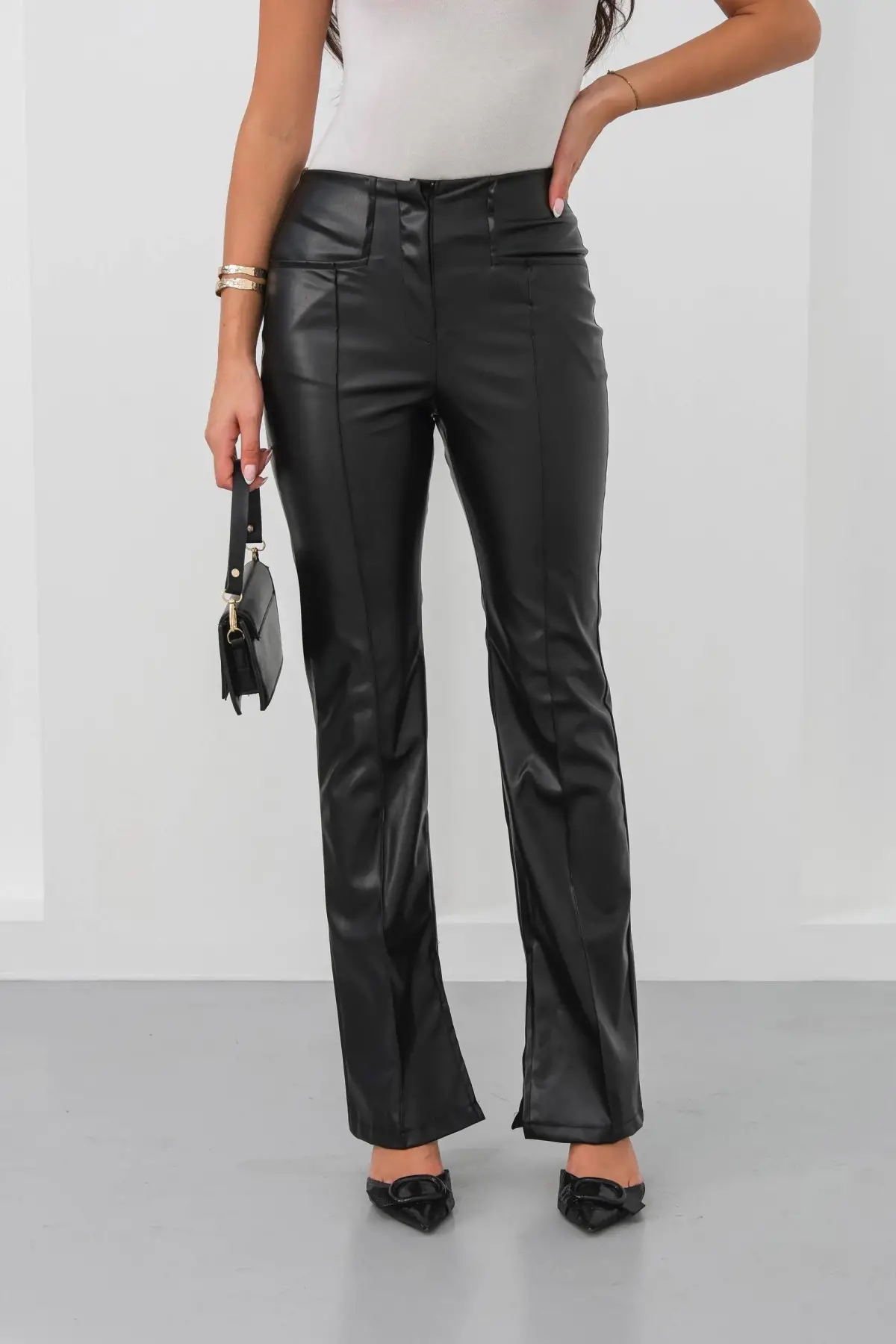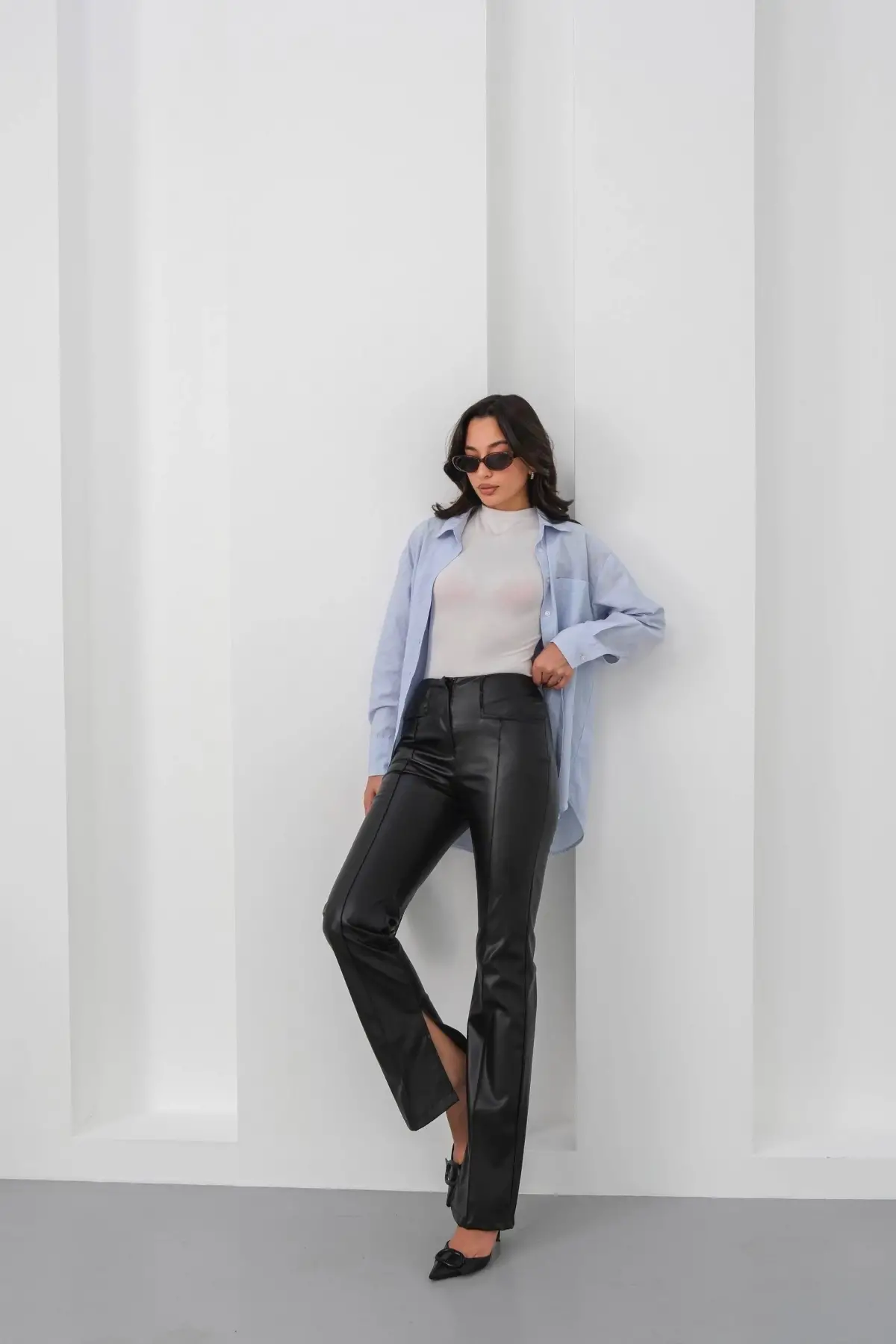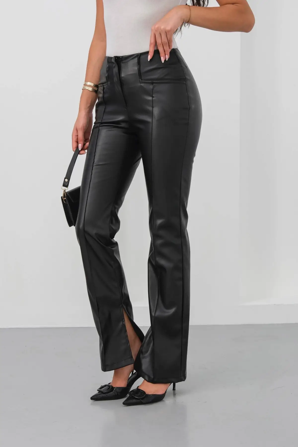 İspanyol Yırtmaçlı Paça Deri Pantolon Siyah Hn