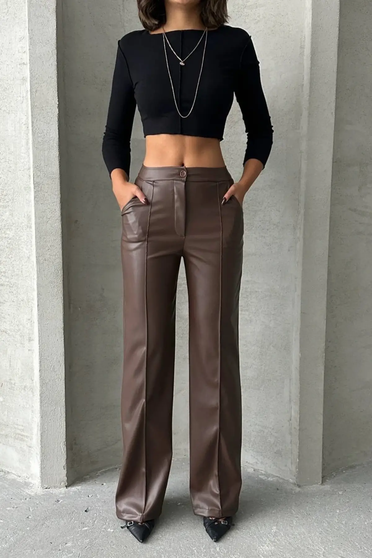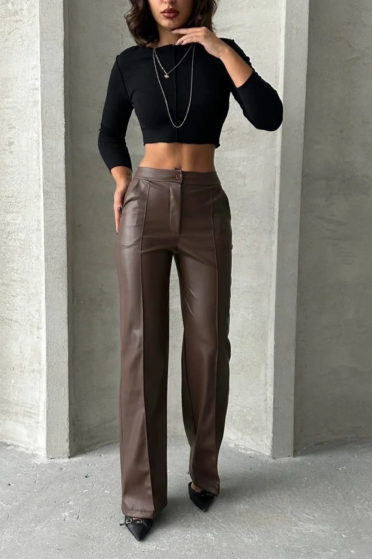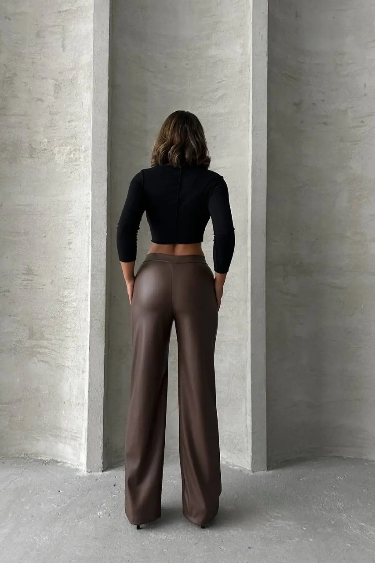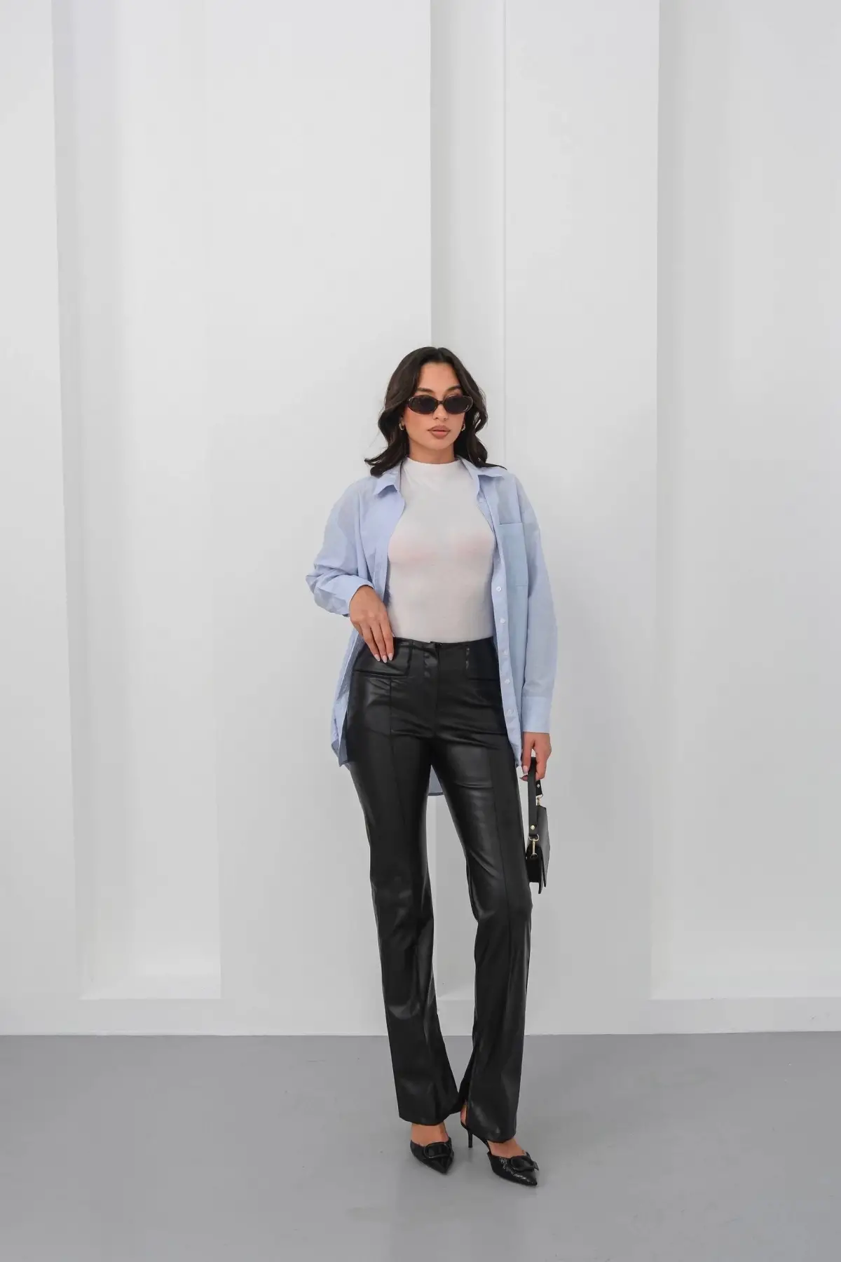İspanyol Yırtmaçlı Paça Deri Pantolon Siyah Hn