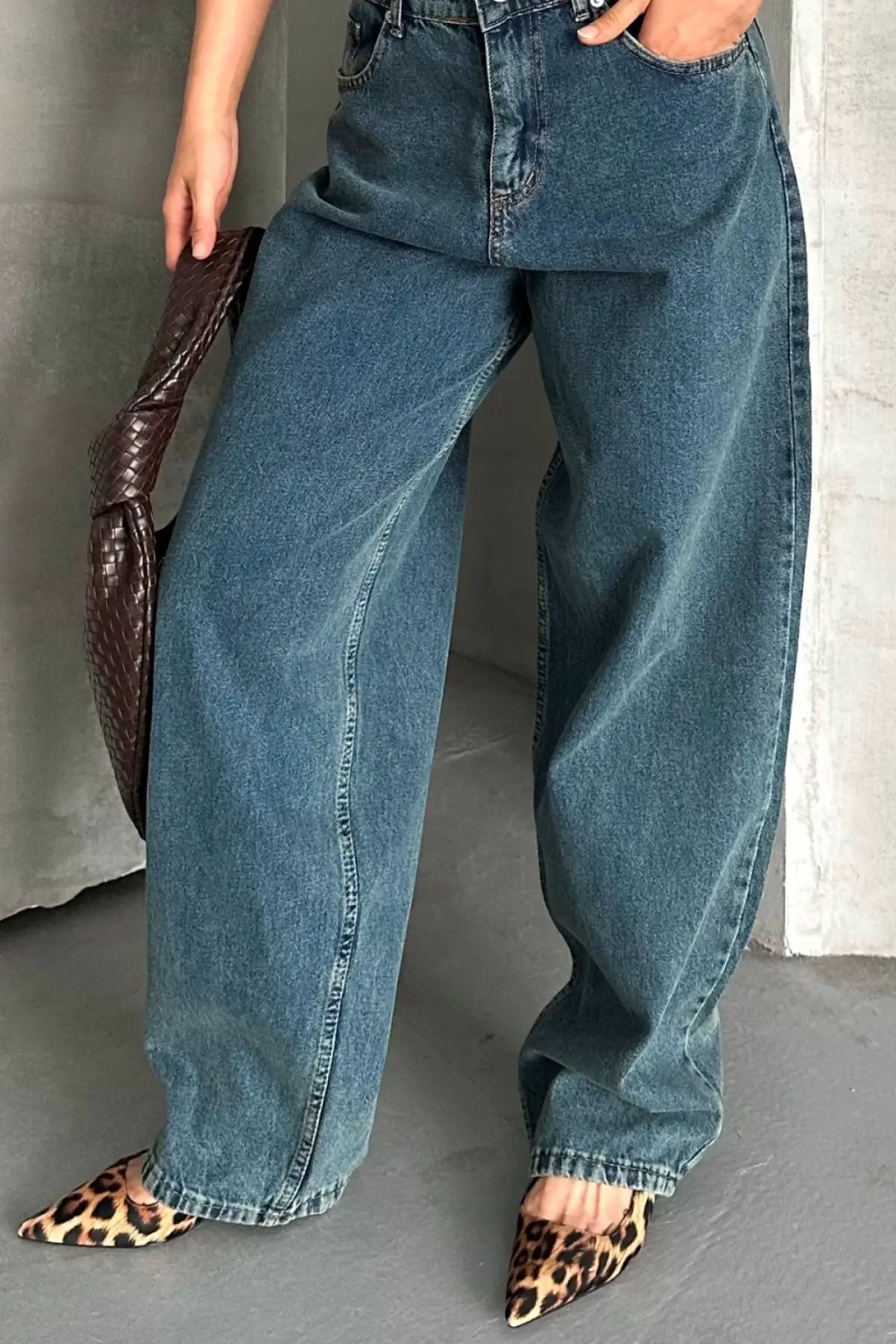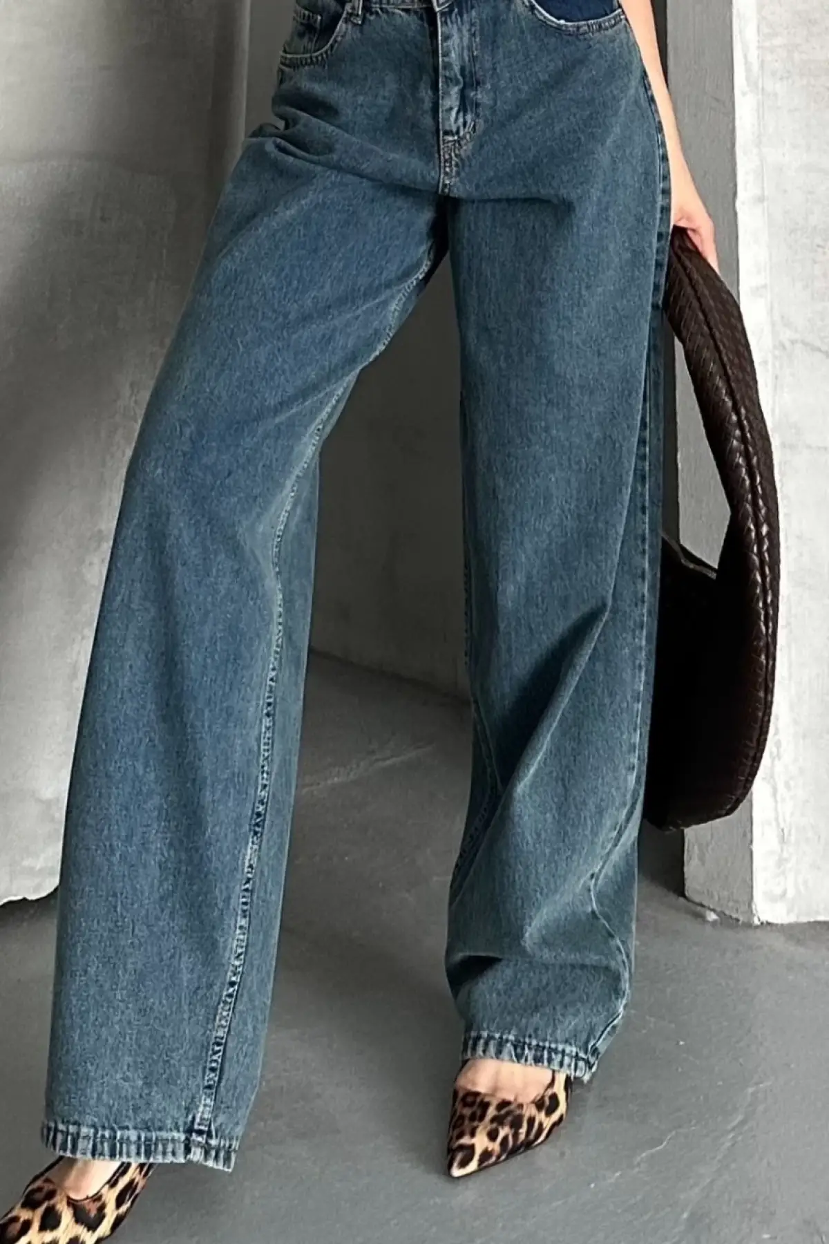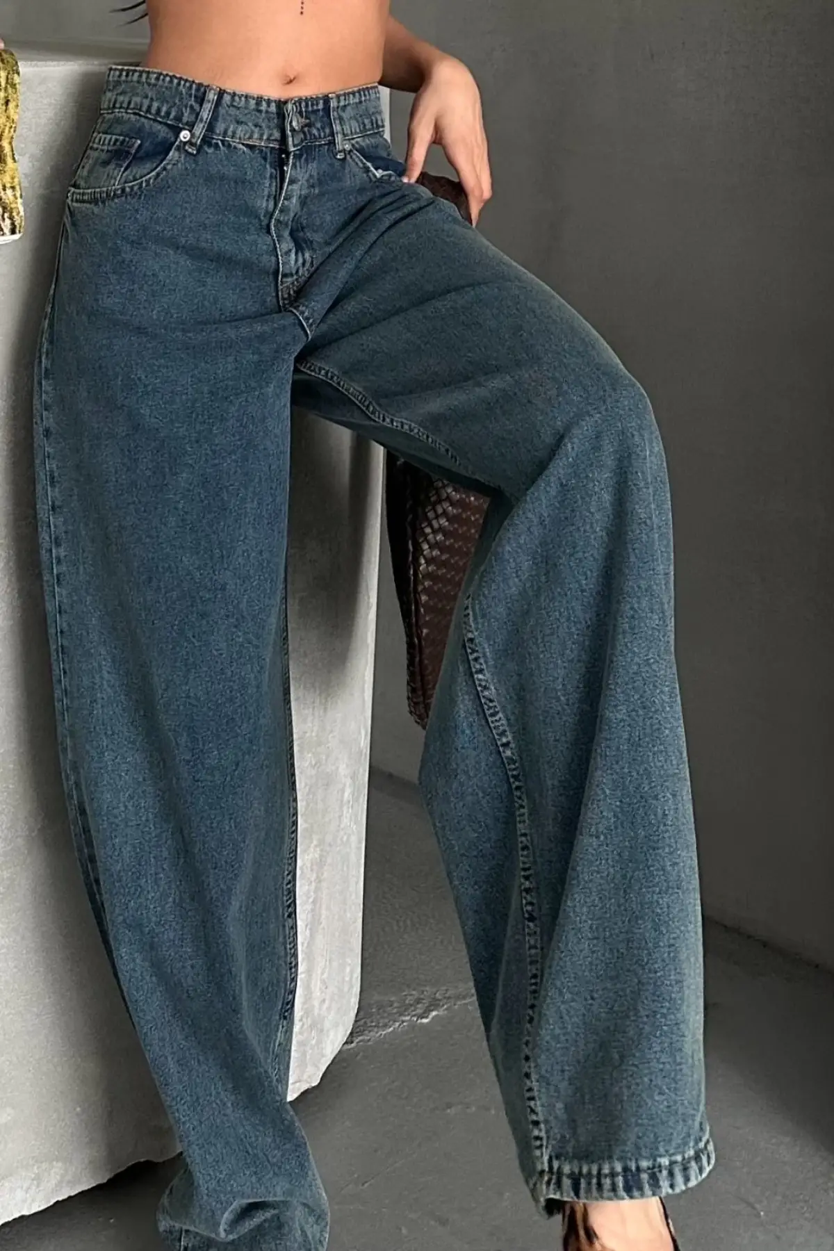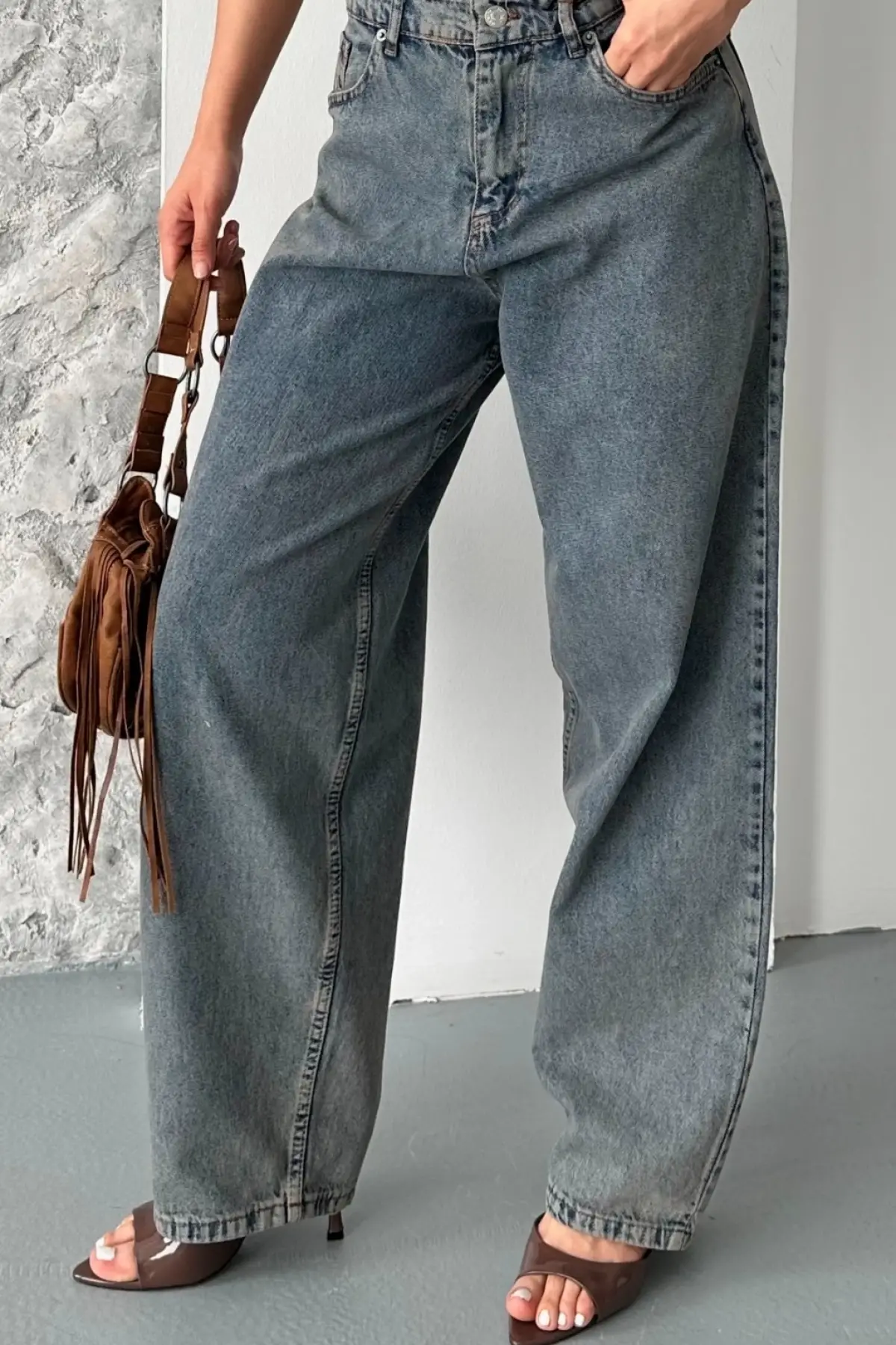 Baggy Kar Yıkama Orta Mavi Jeans Pantolon D2007