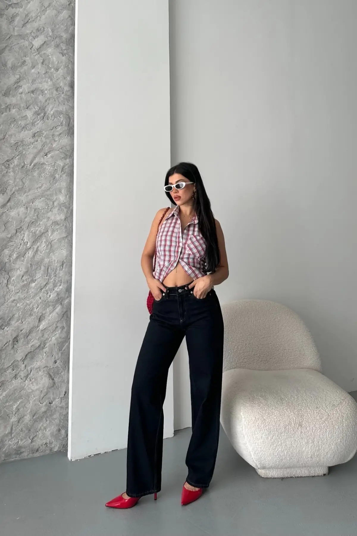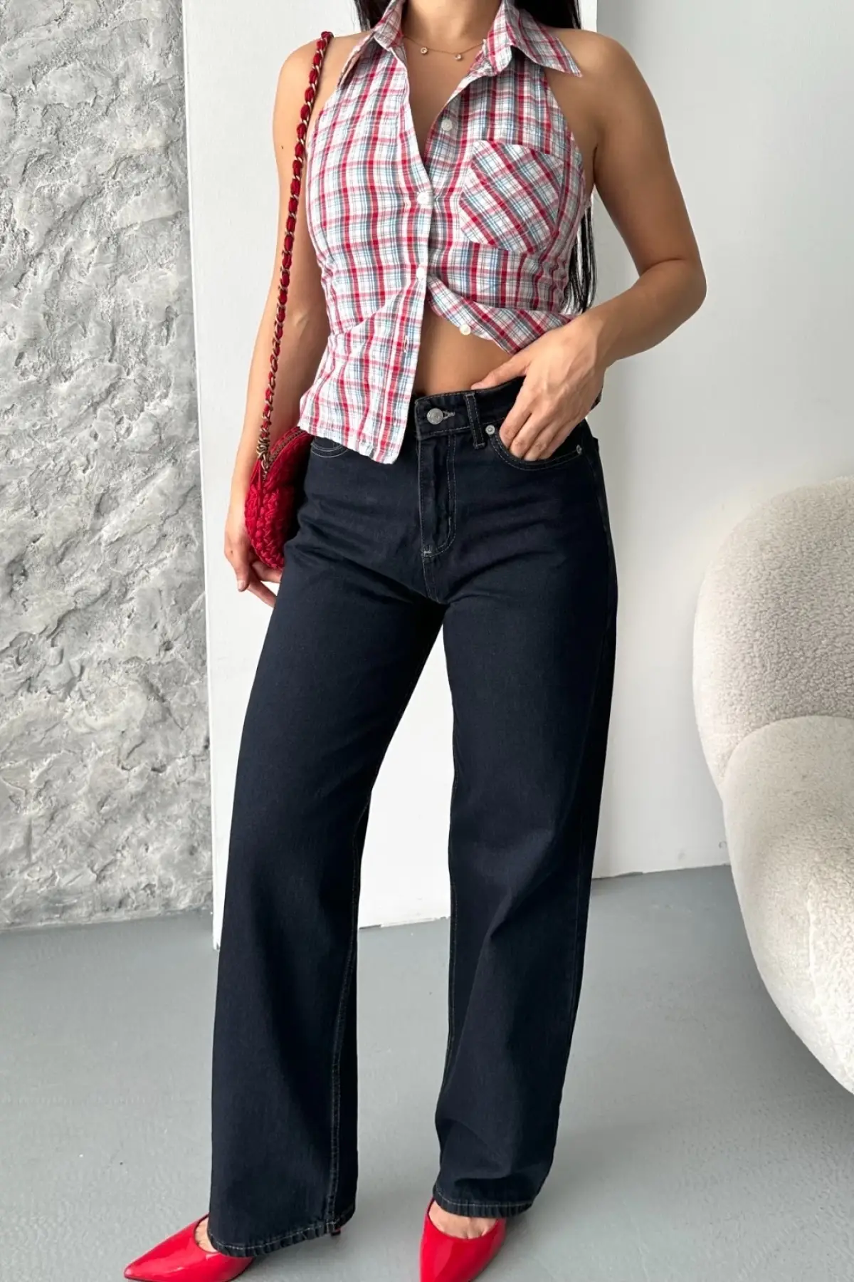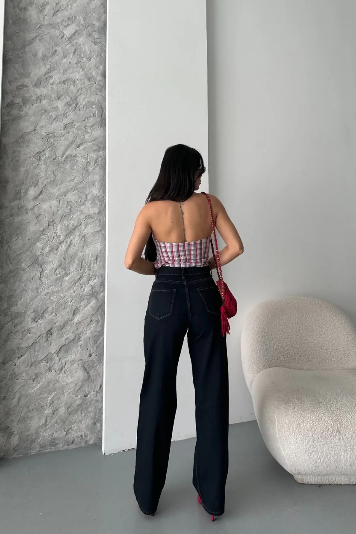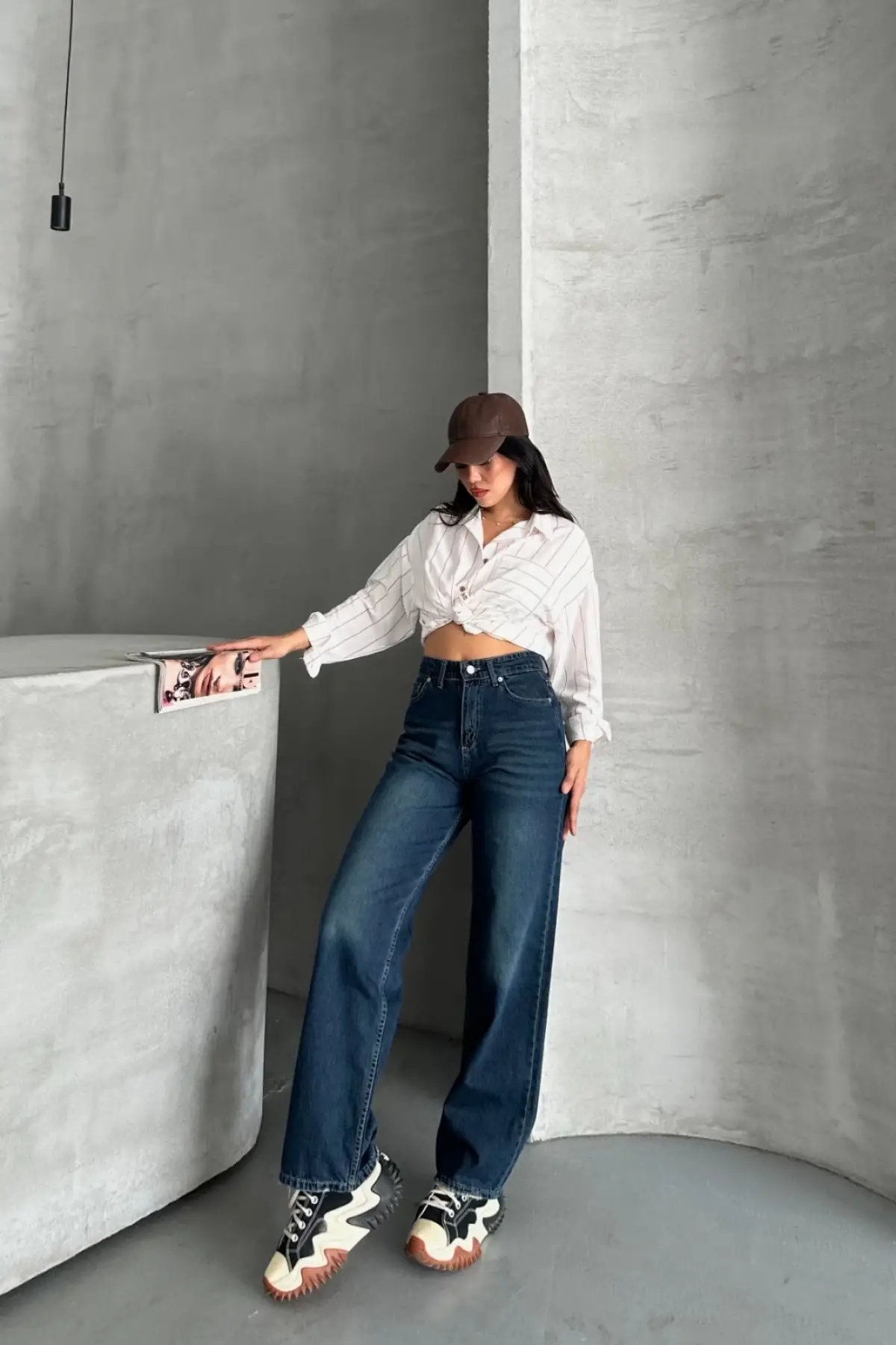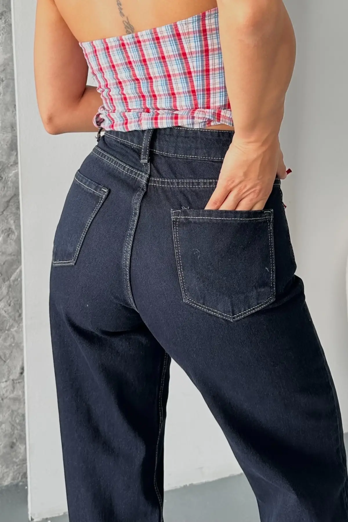 Palazzo Süper Taş Enzim Tint Yıkama Koyu Lacivert Jeans Pantolon D2008