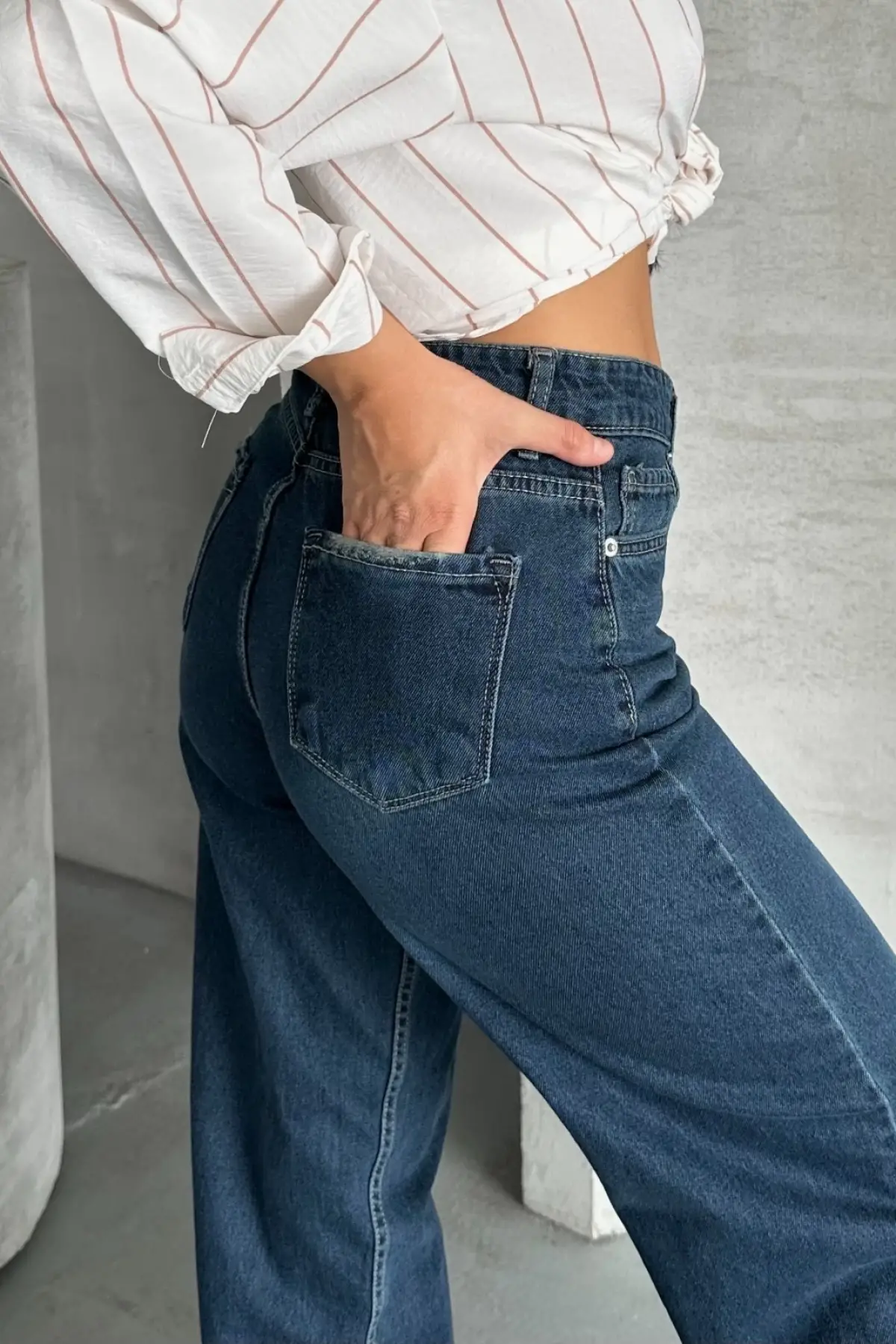 Palazzo Bıyık Enzim Yıkama Jeans Pantolon Koyu Mavi D2008