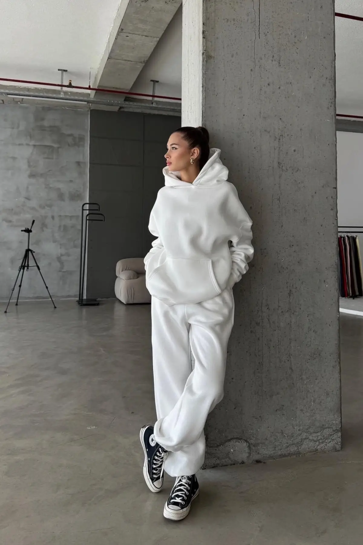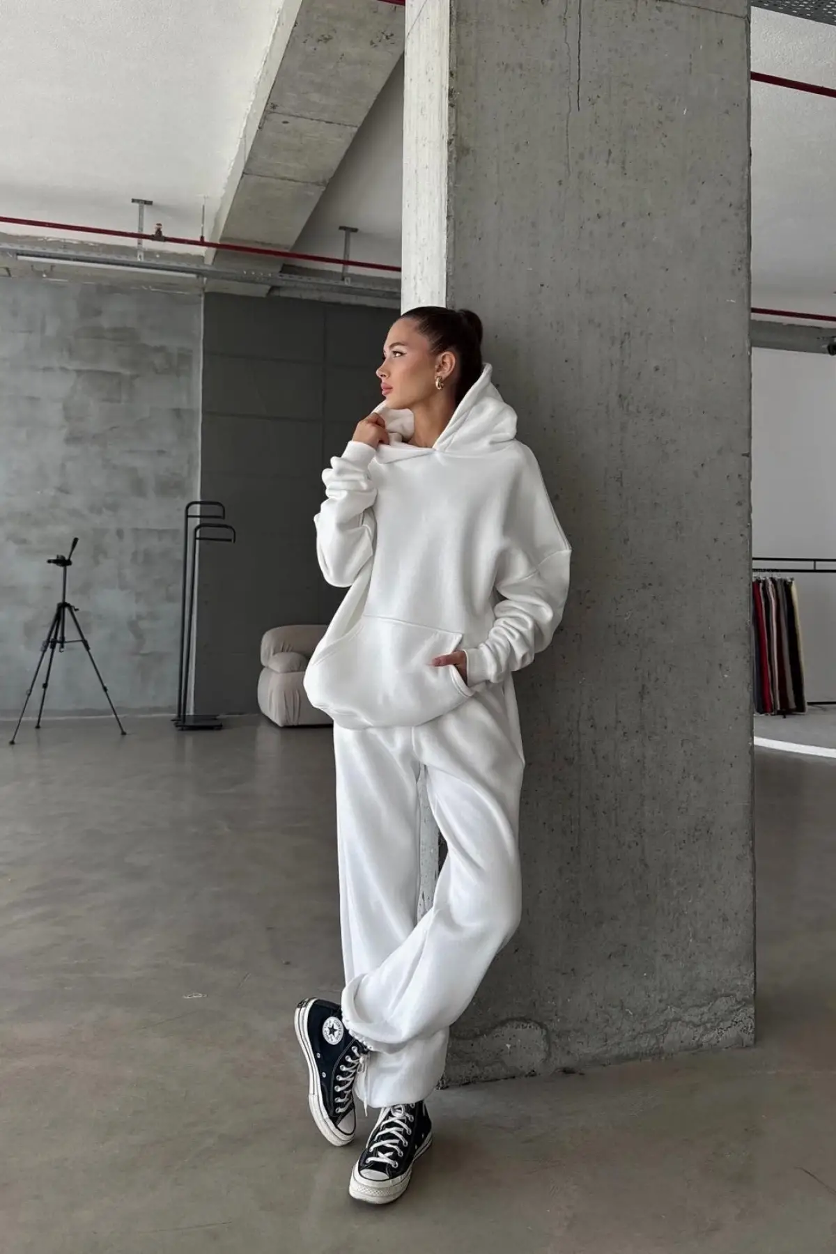 3 İplik Şardonlu Kapşonlu Hoodie Frm Beyaz P510437