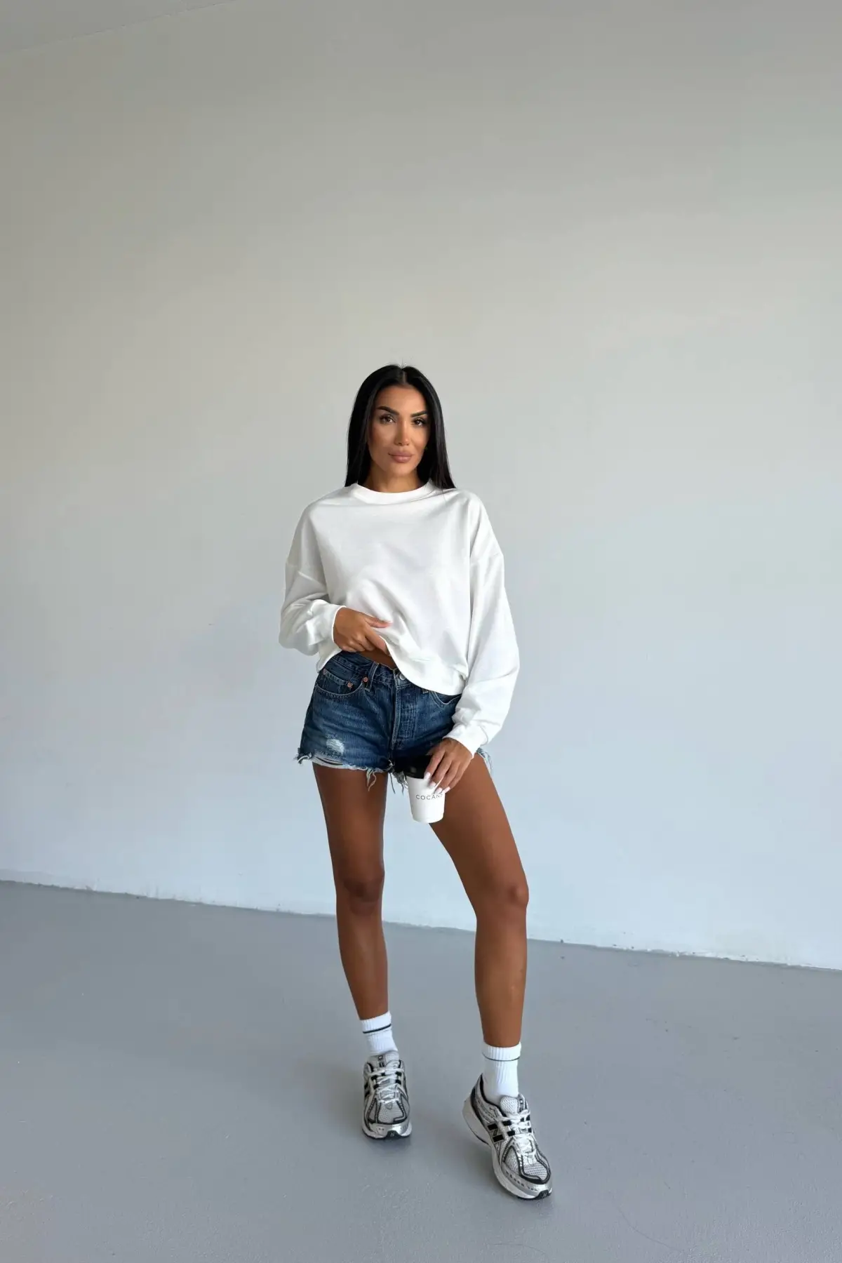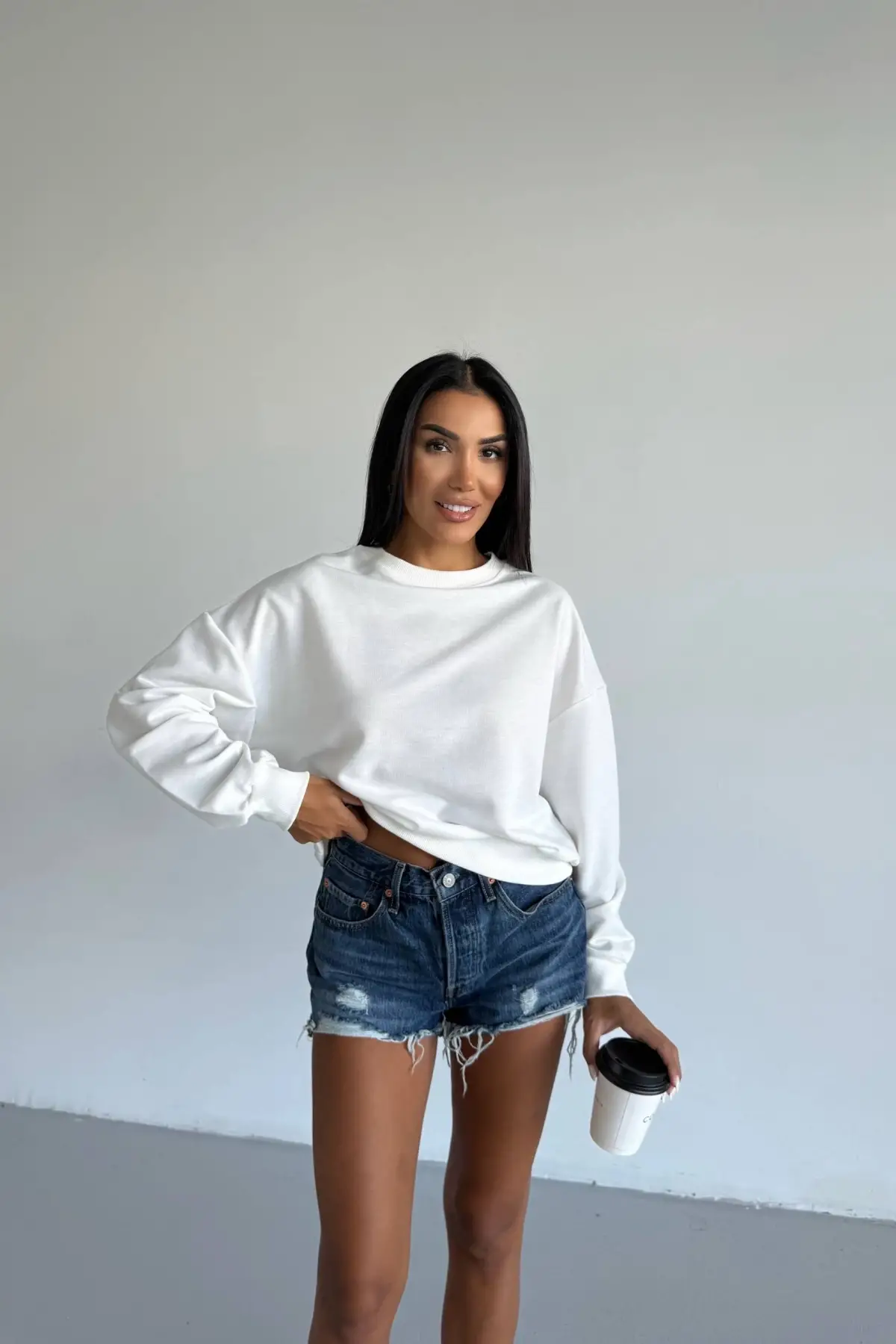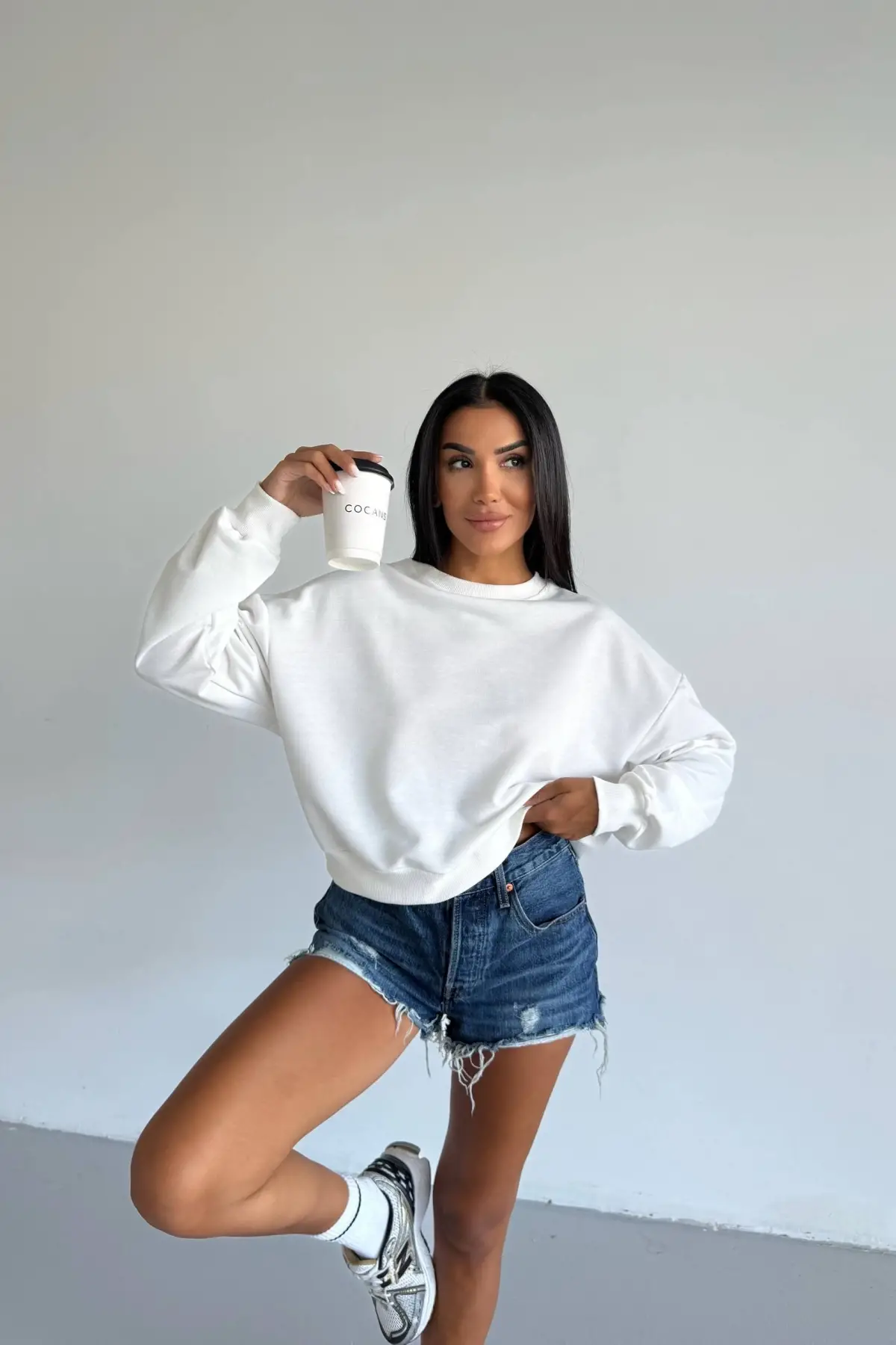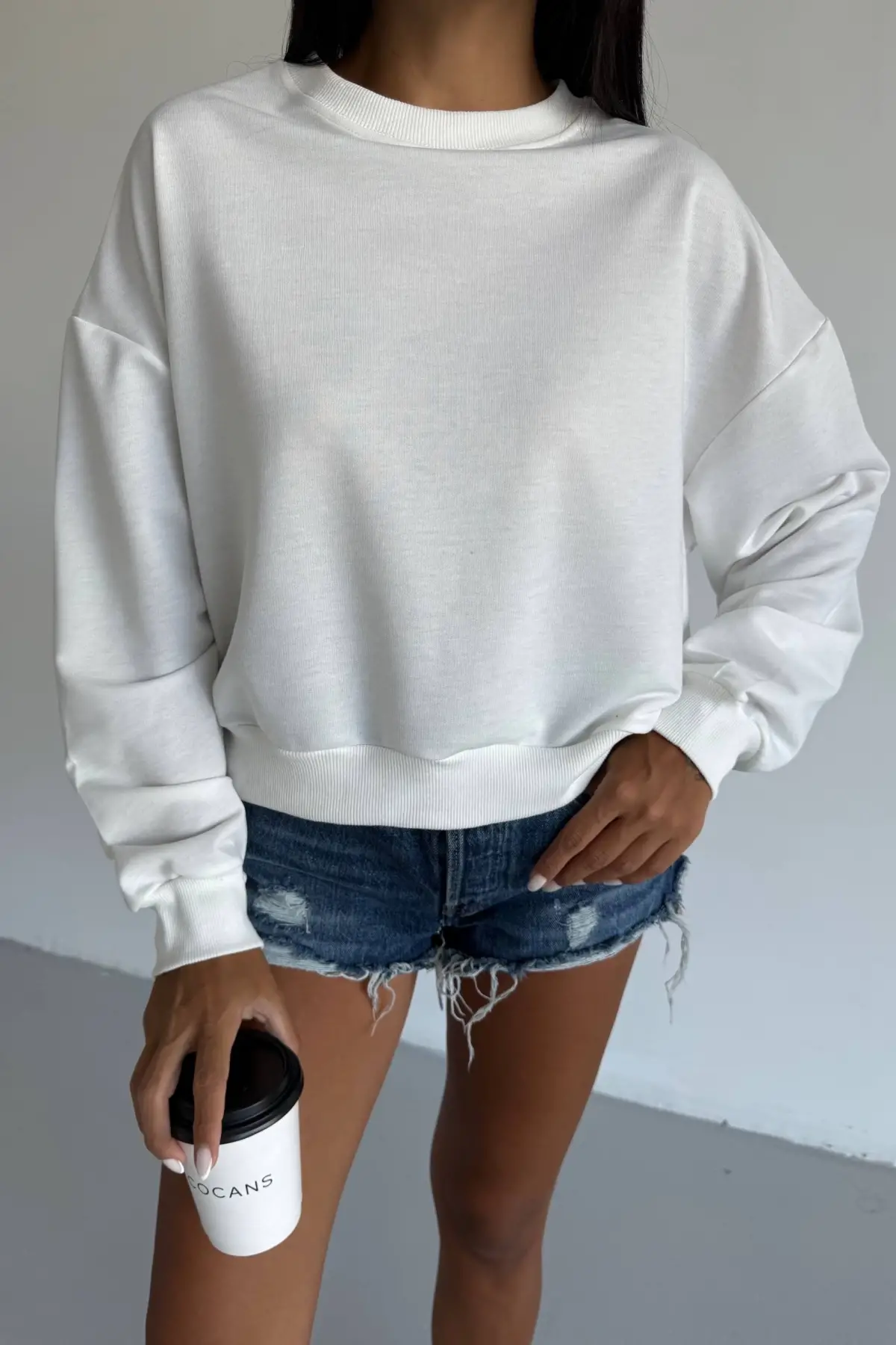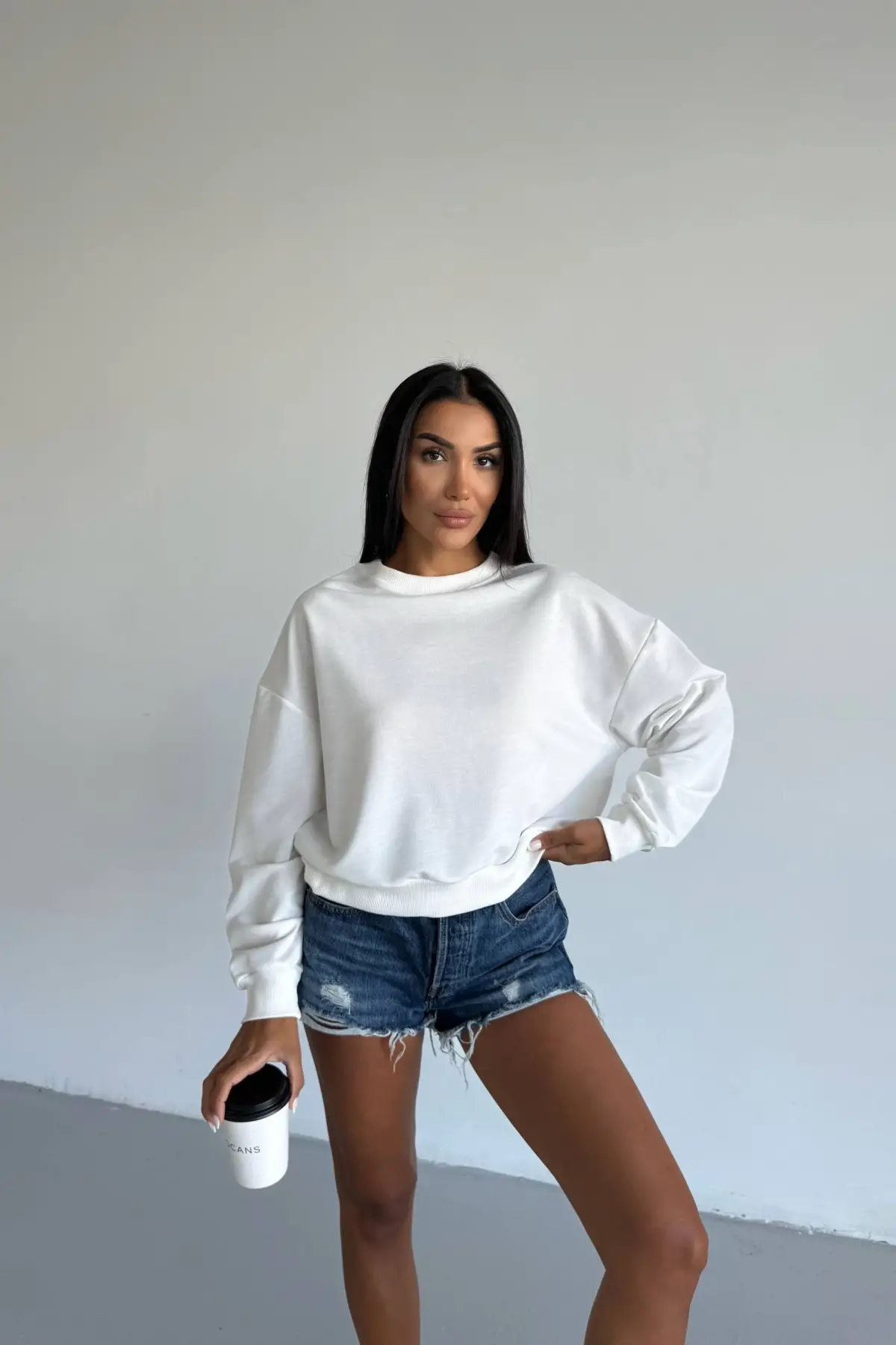 2 İplik Bisiklet Yaka Sweat Beyaz F2339