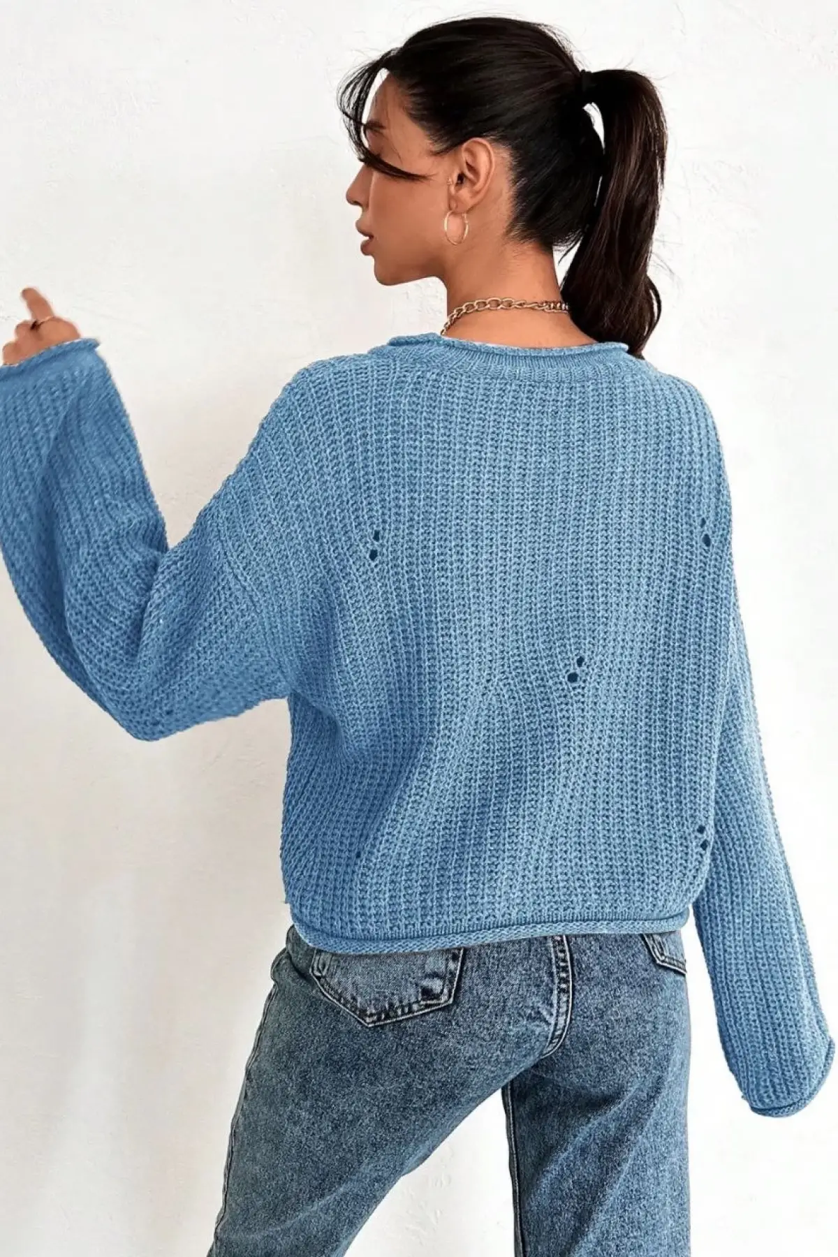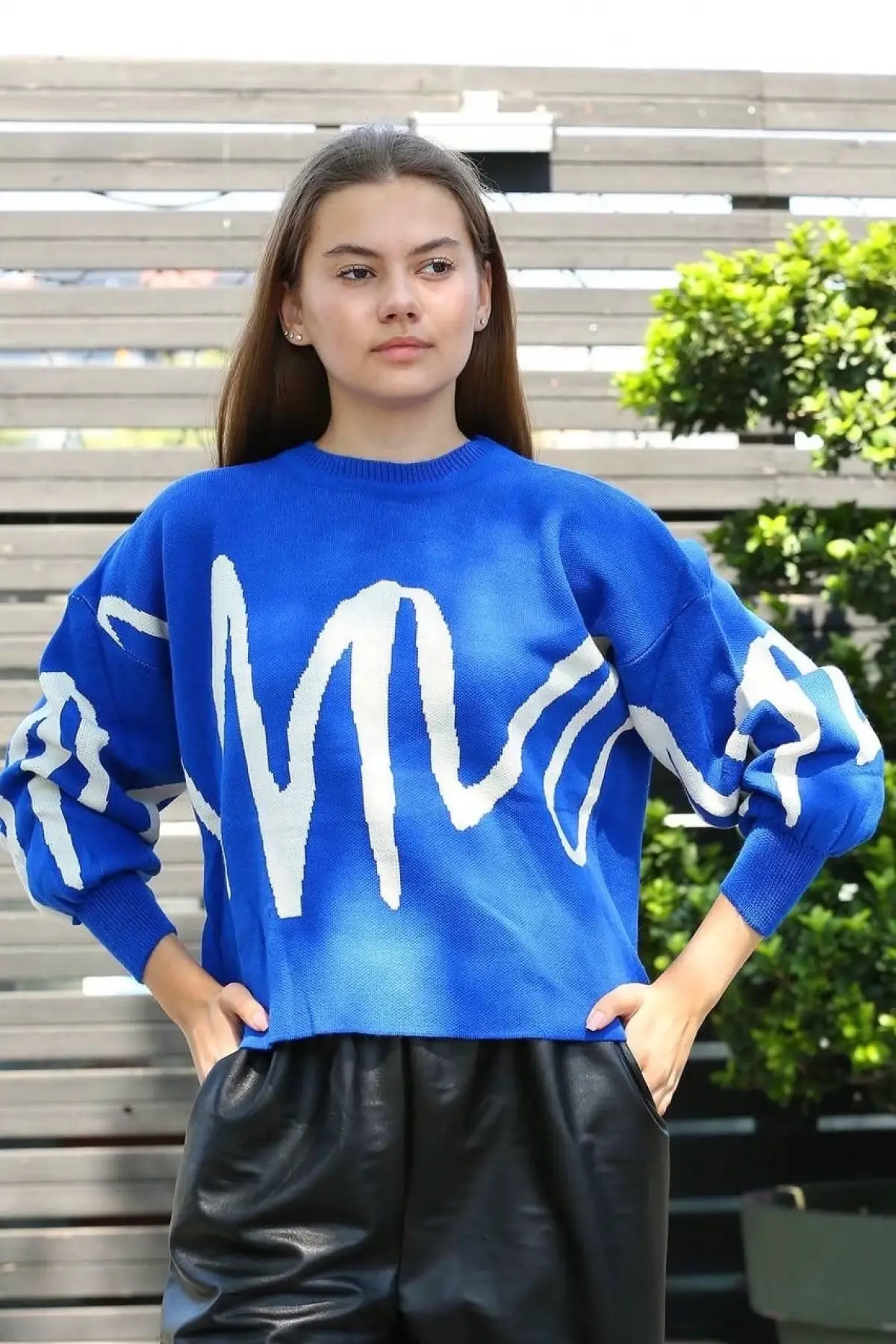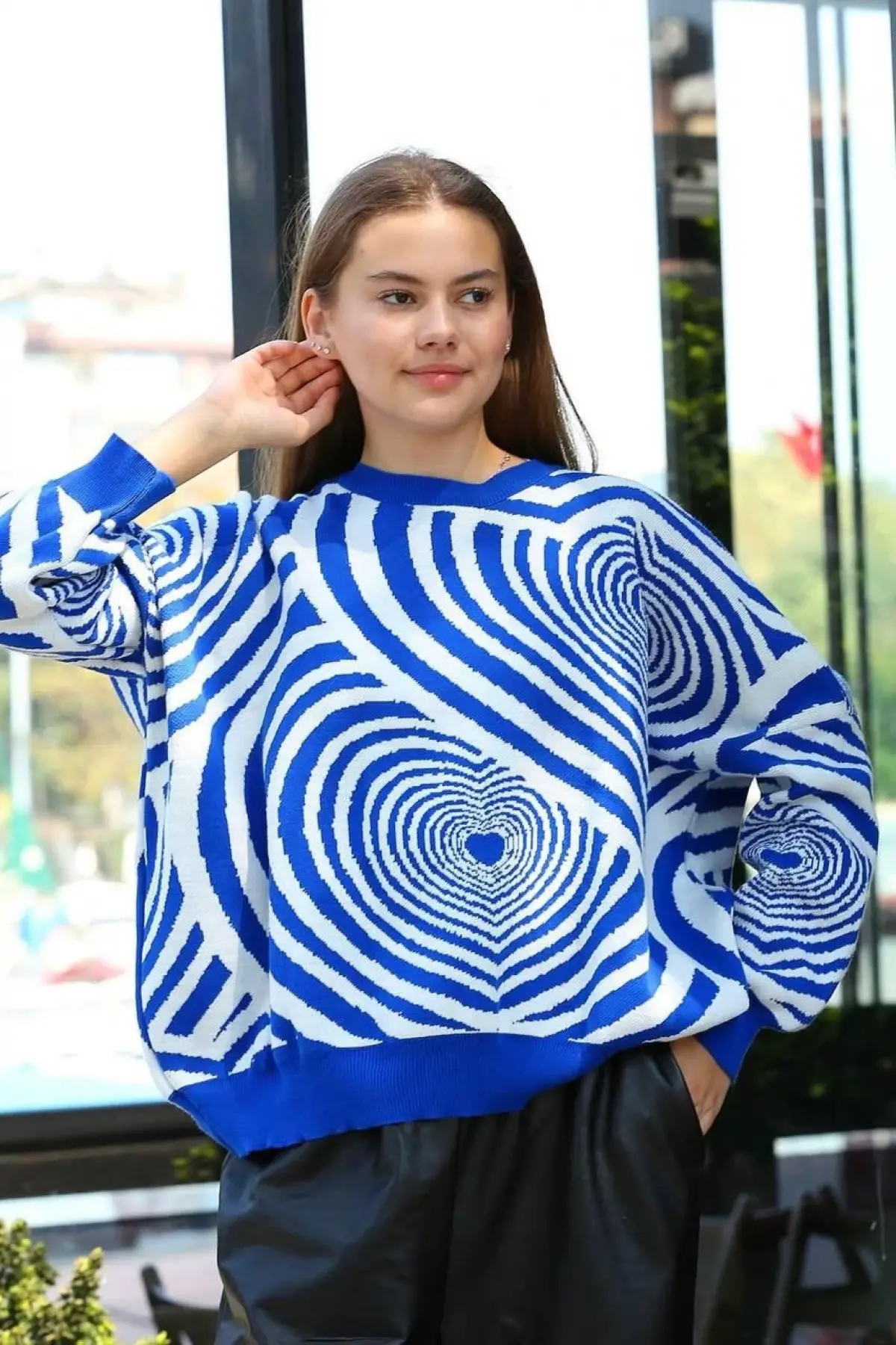 Beyaz Kalp Çizgili Kazak Saks Mavisi