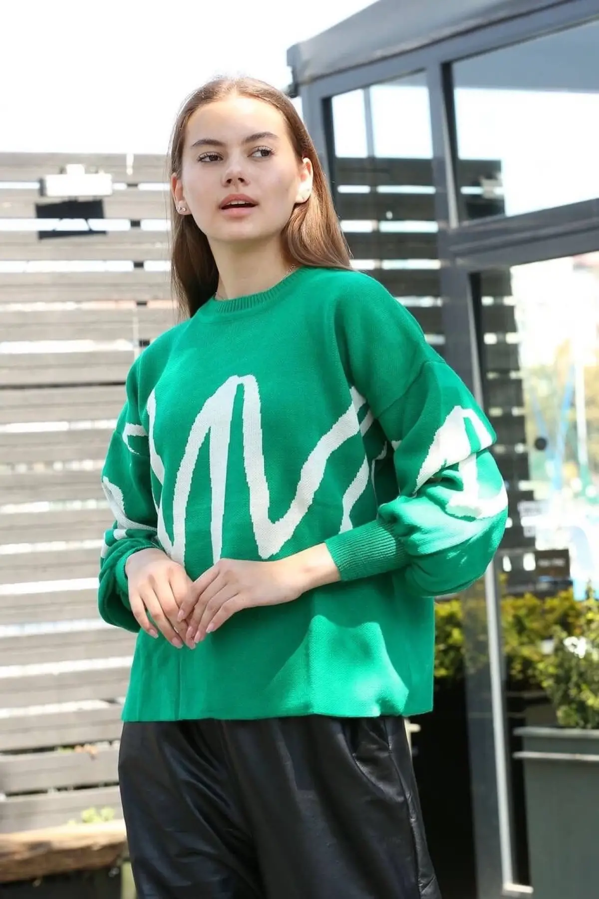 Beyaz Çizgili Bisiklet Yaka Kazak Yeşil