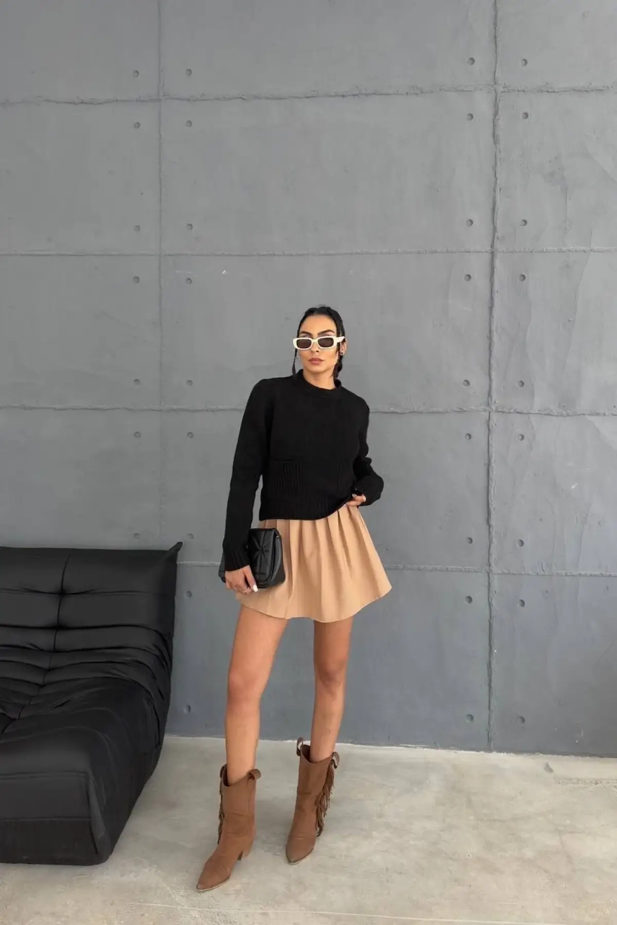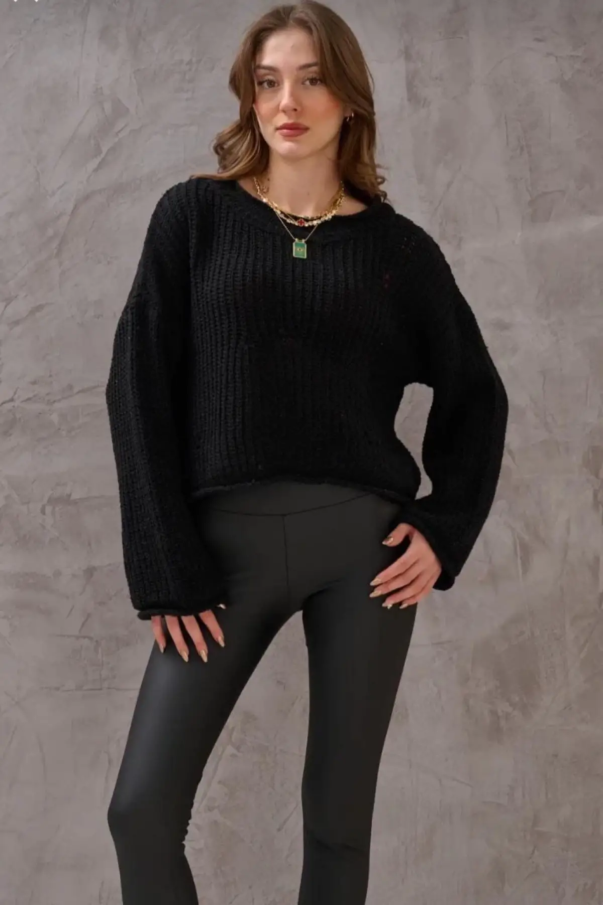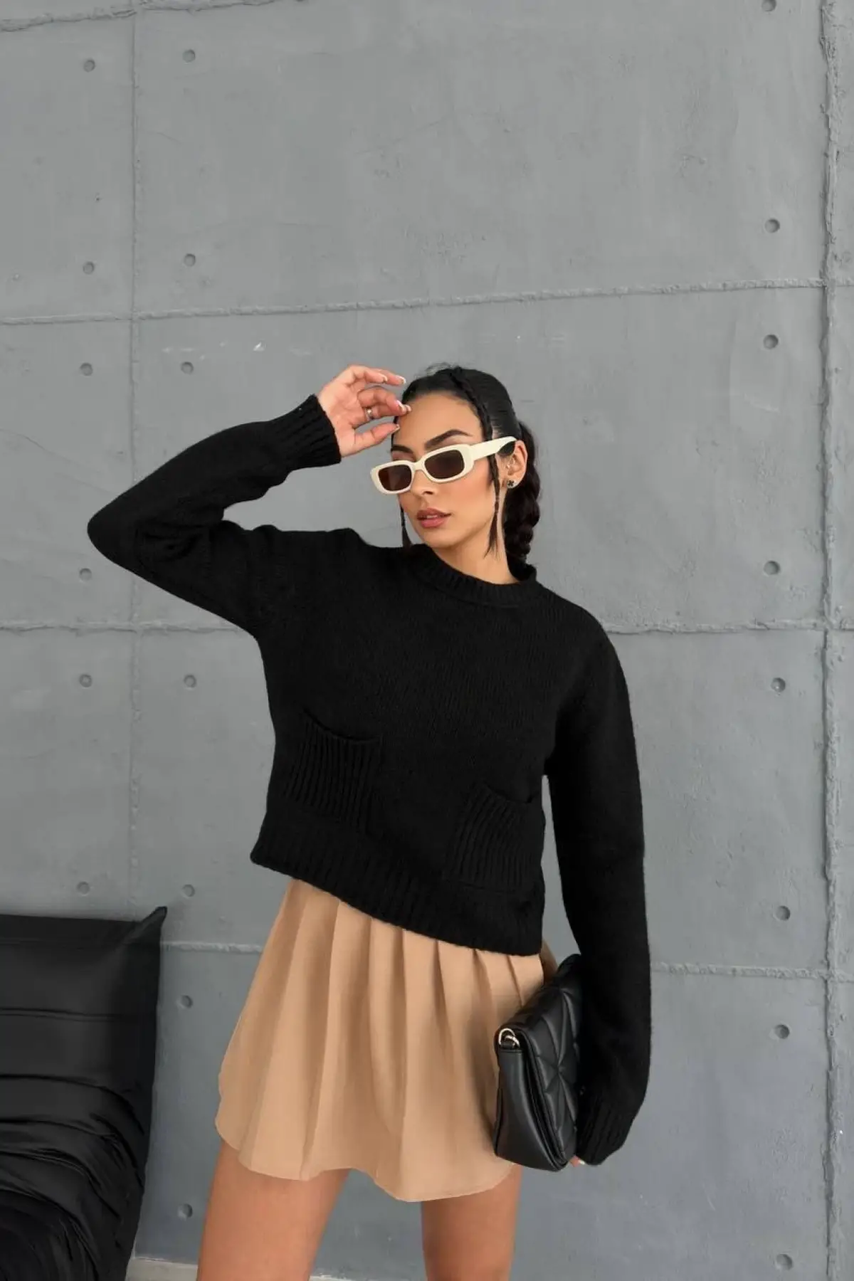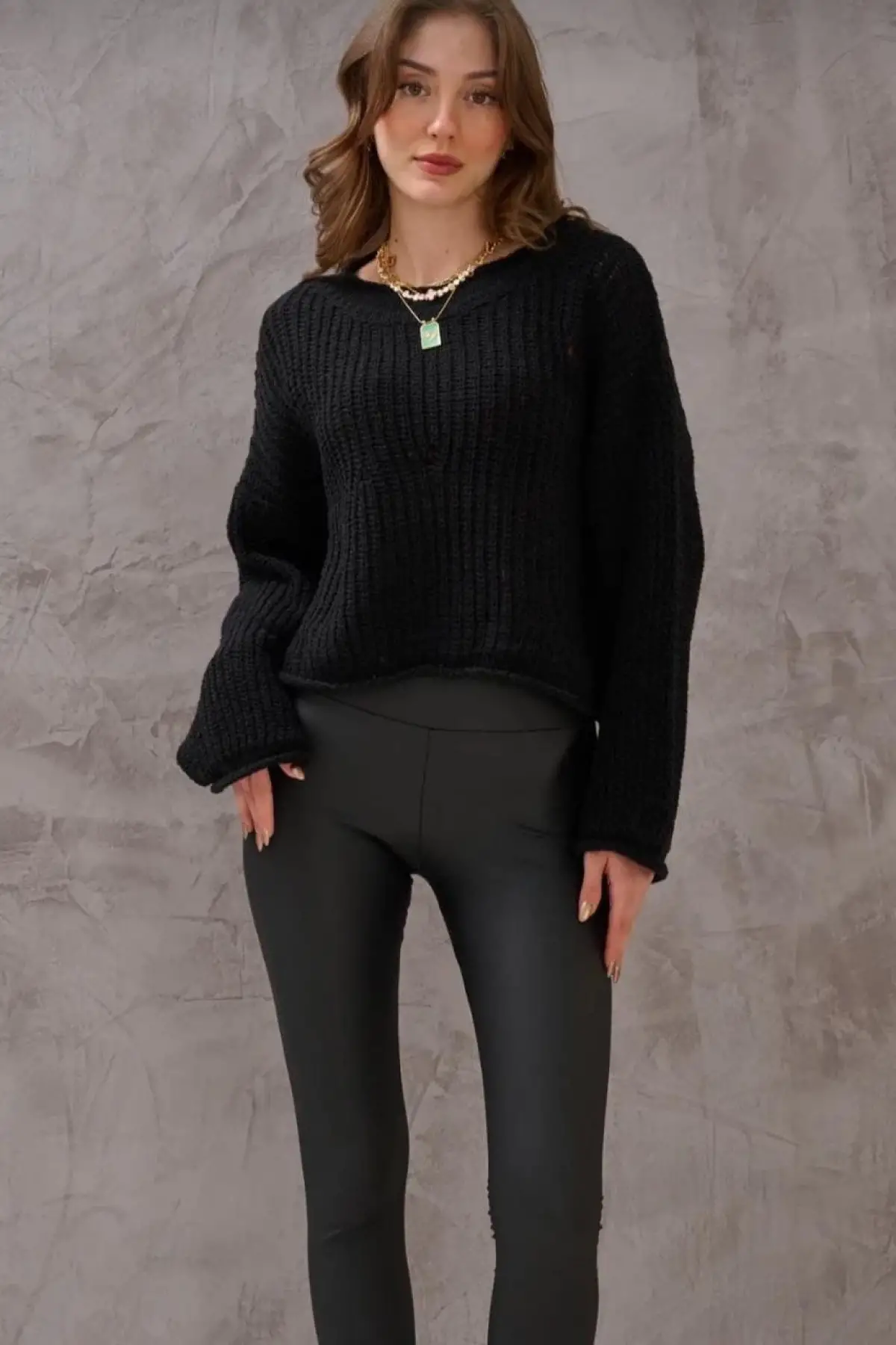 Siyah Çizgili Bisiklet Yaka Kazak Saks
