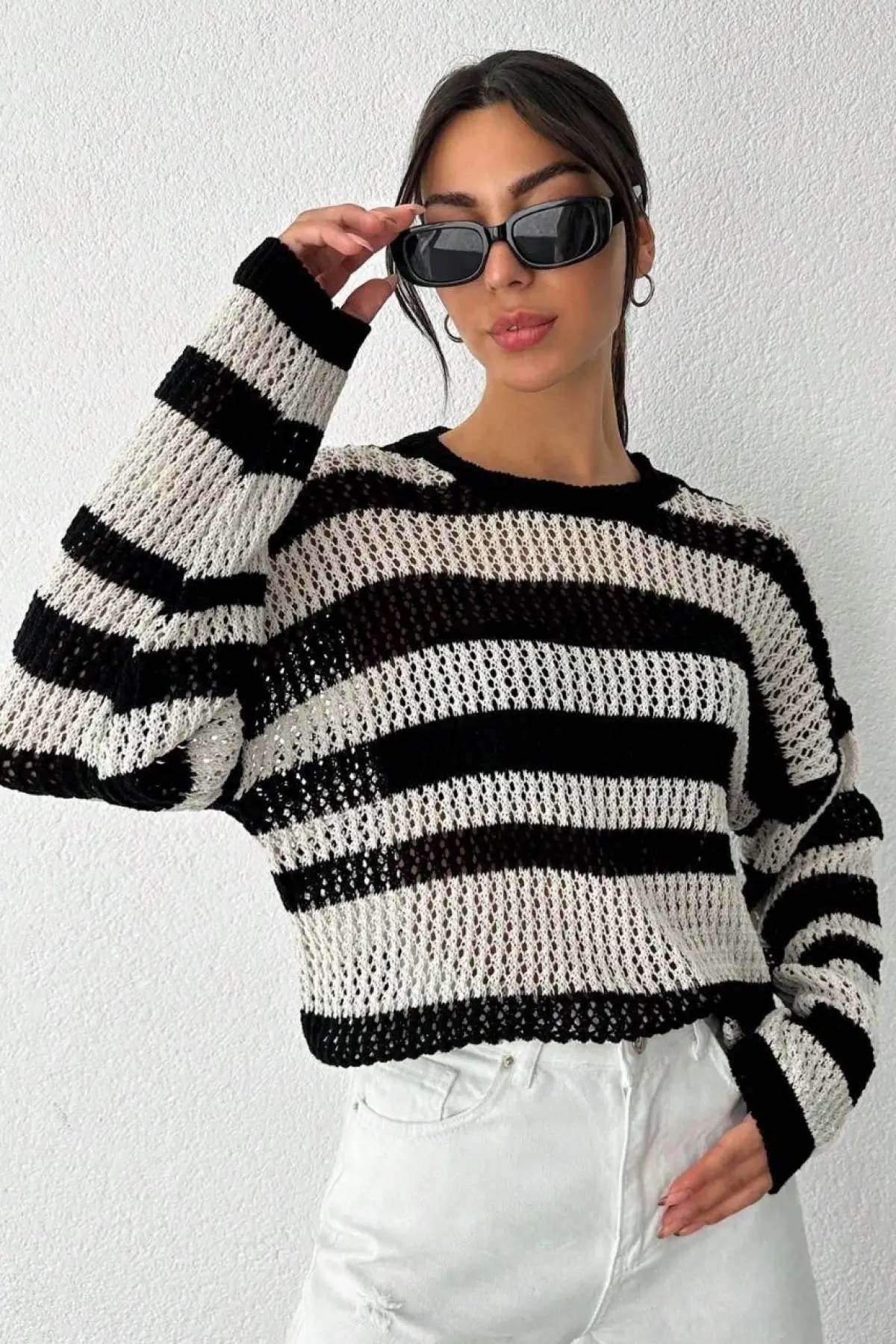 Çizgili Bisiklet Yaka Triko Kazak Beyazsiyah