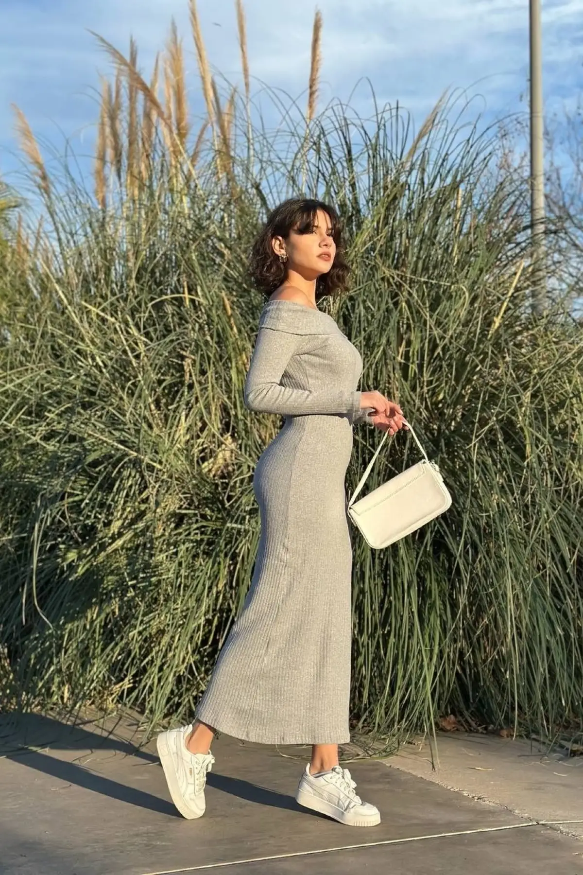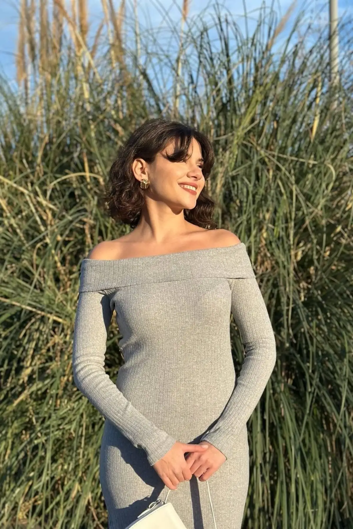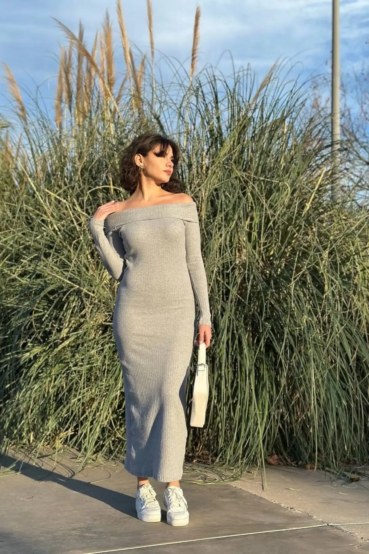 Madonna Yaka Uzun Elbise Şardonlu Kumaş Gri W3753