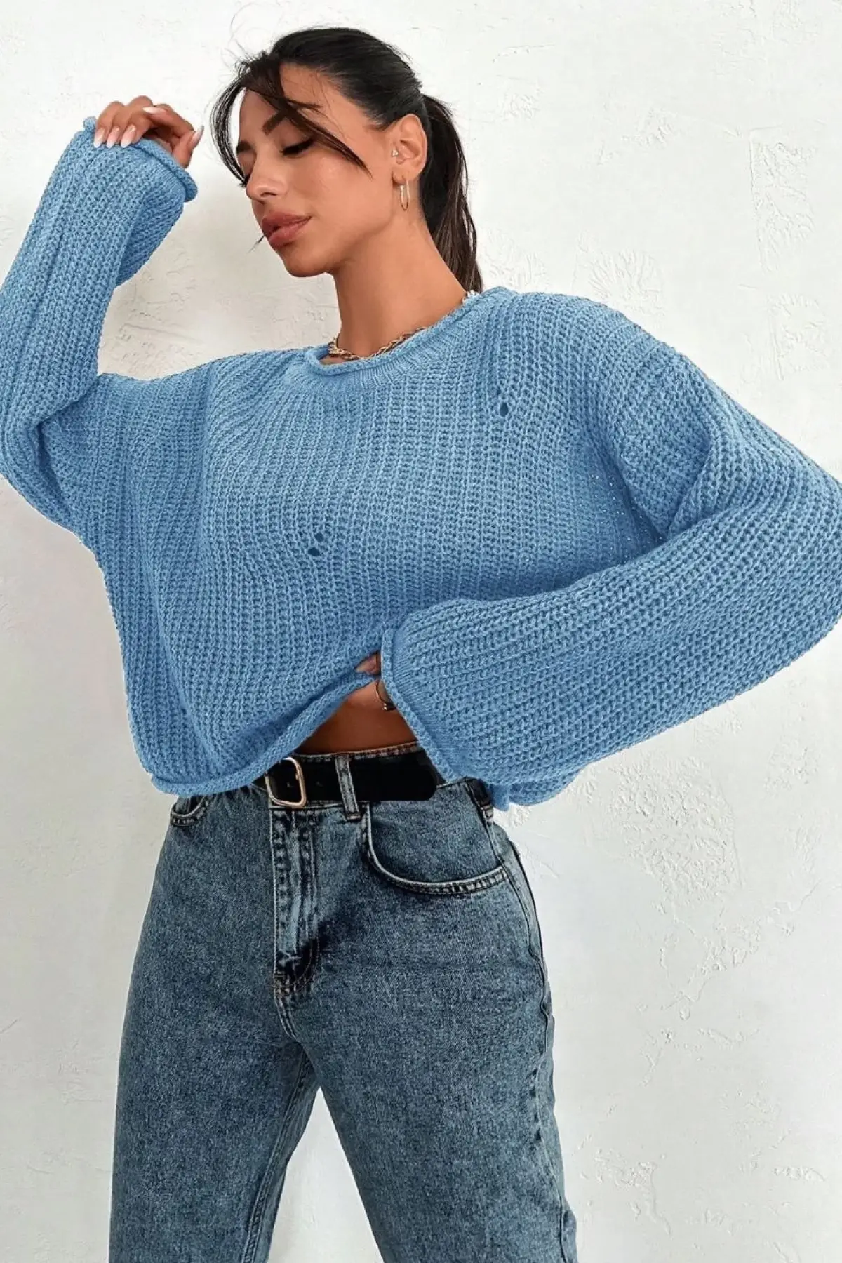 Beyaz Çizgili Bisiklet Yaka Kazak Saksmavisi