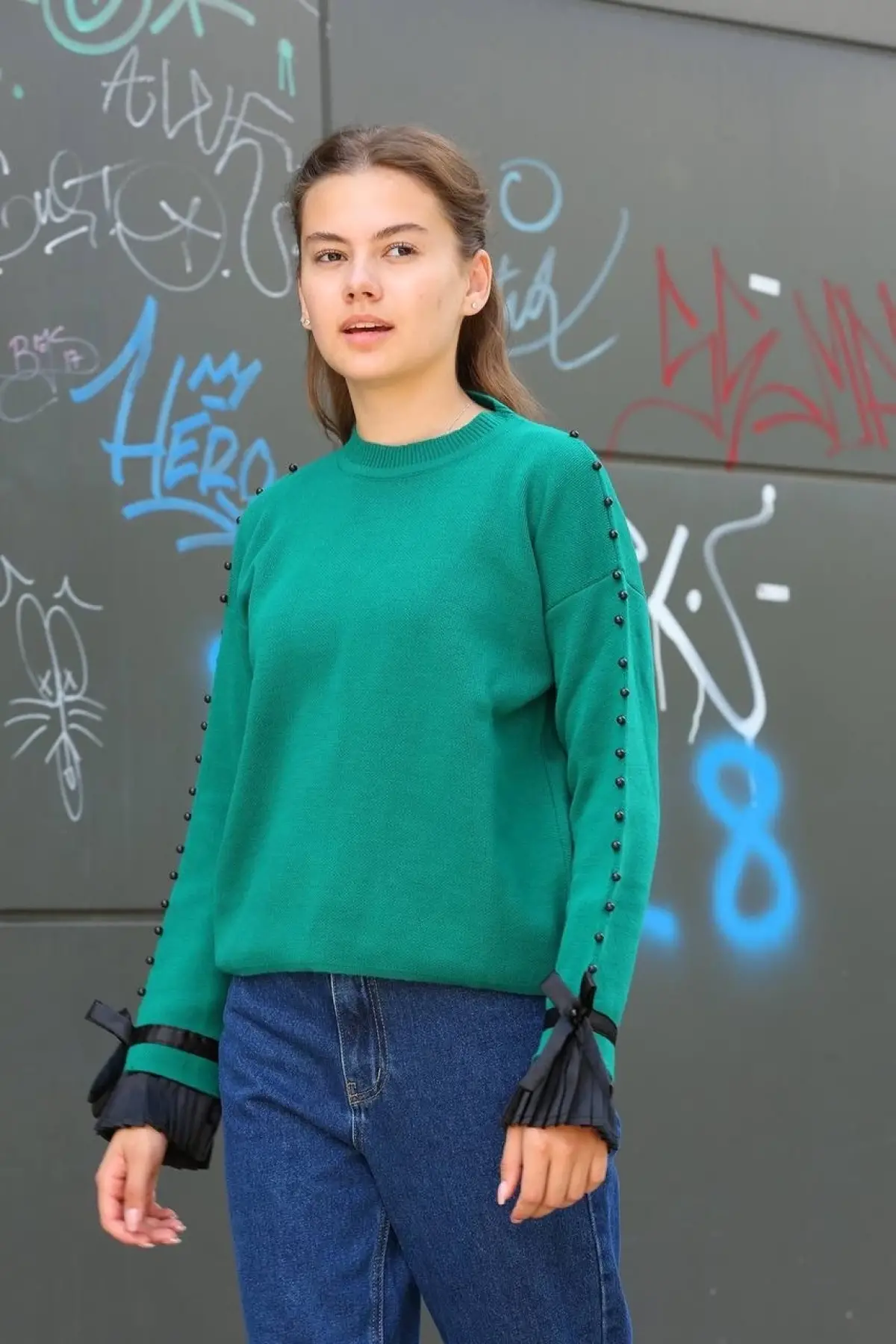 Boncuklu Bile Detaylı Kazak Petrol Yeşili
