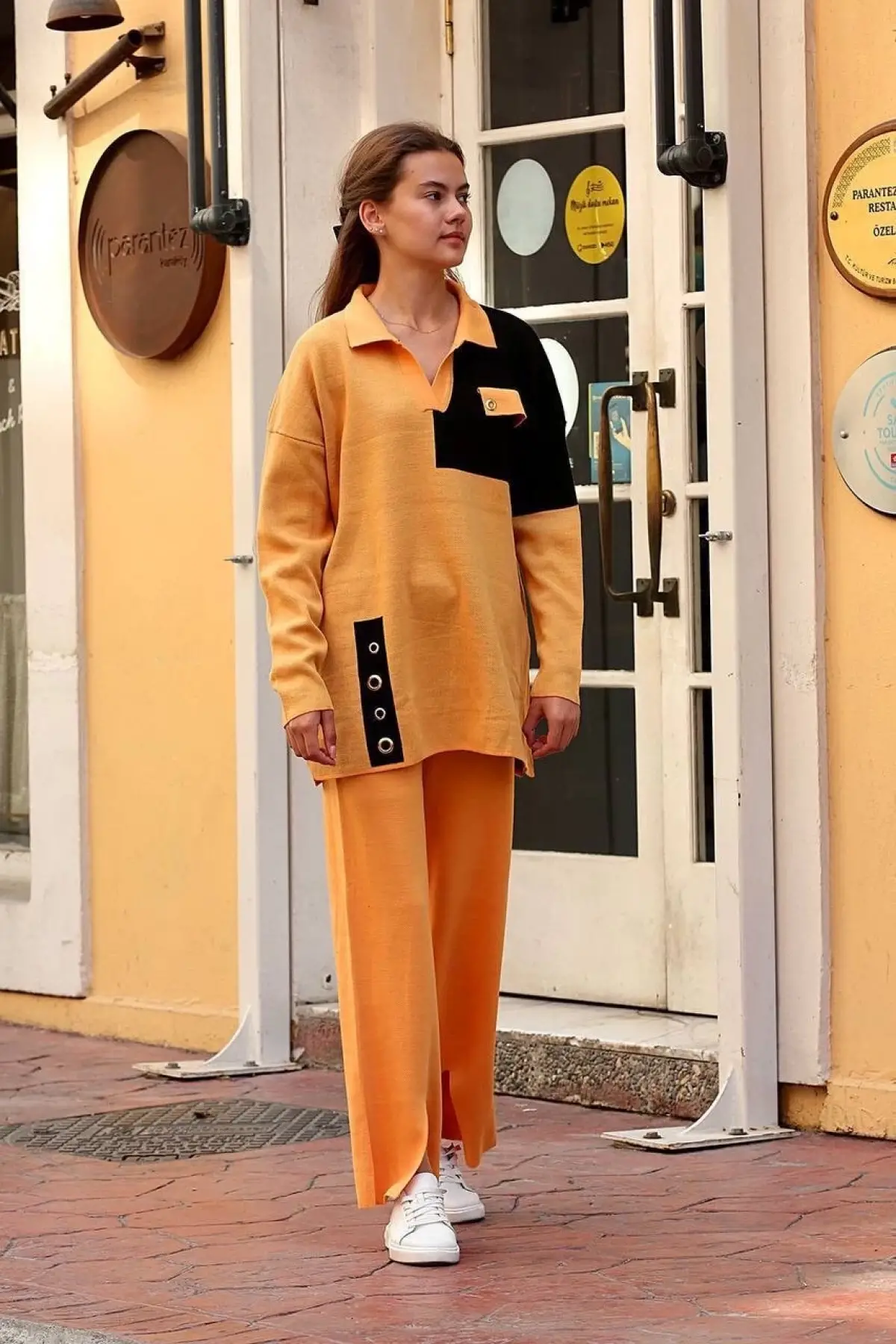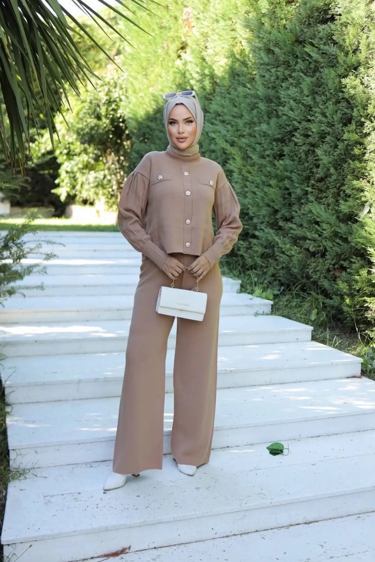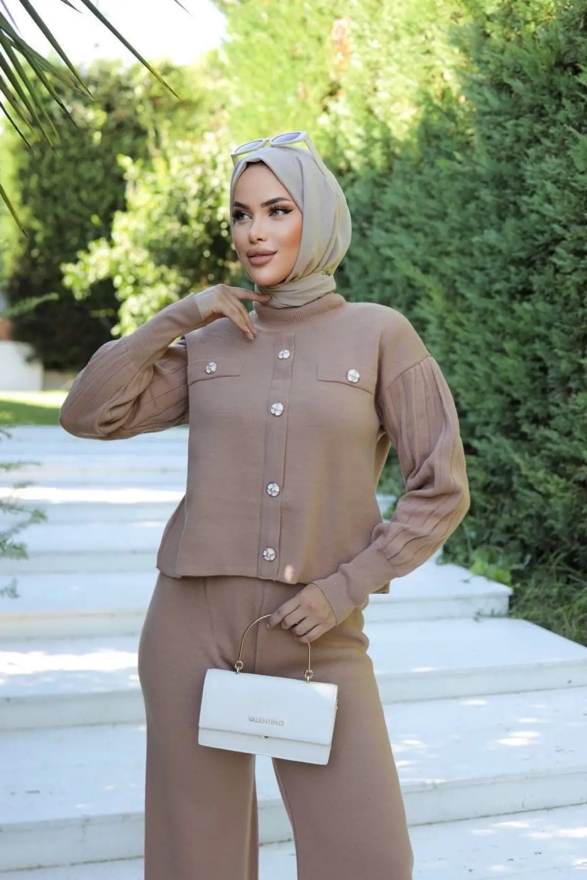 Omuz Detaylı Kol Nakışlı İkili Alt Üst Triko Takım Vizon