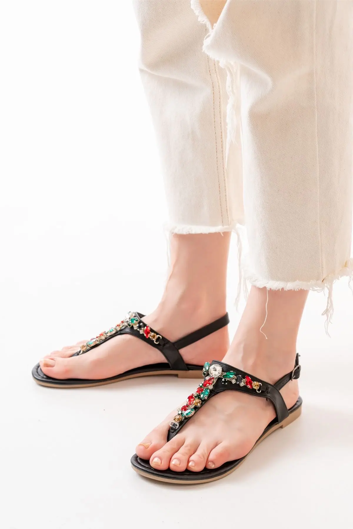 152-1110 Siyah Multi Taşlı Parmak Arası Kadın Sandalet