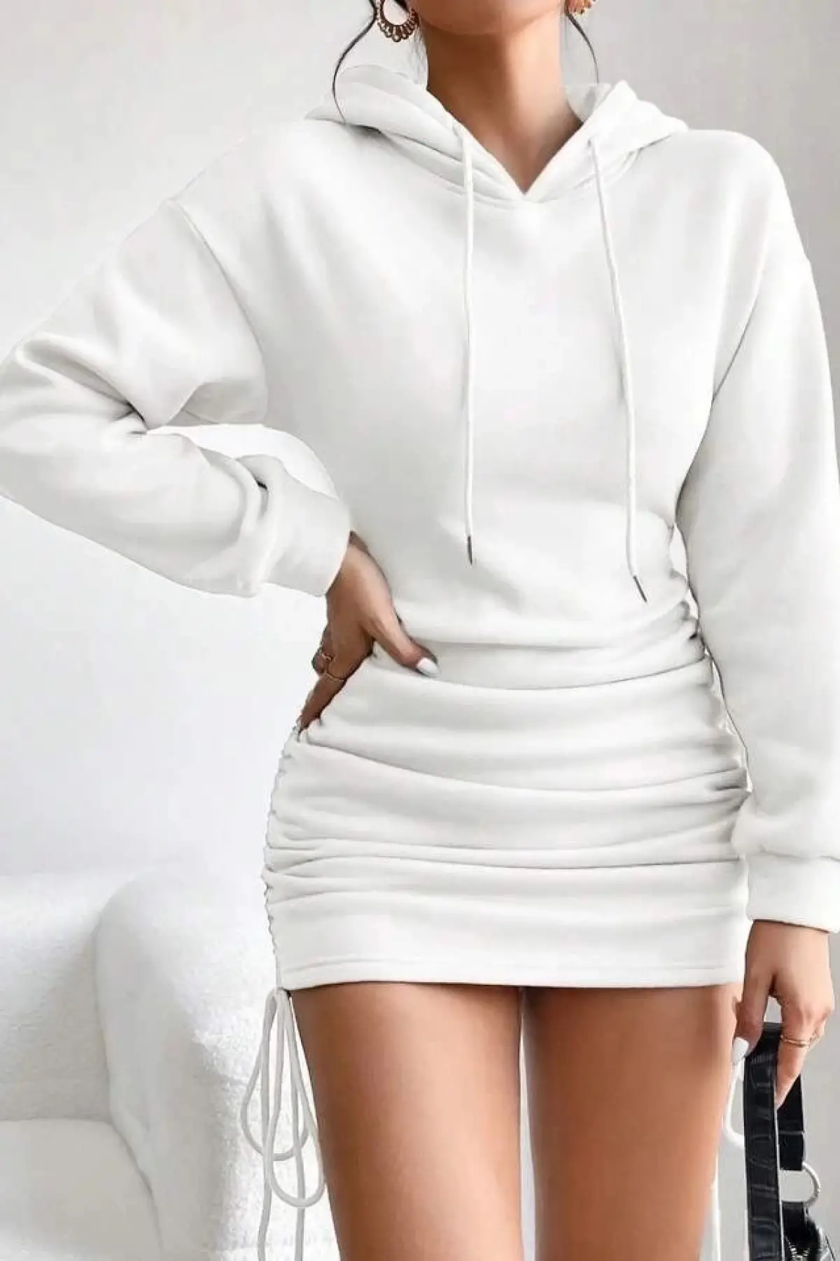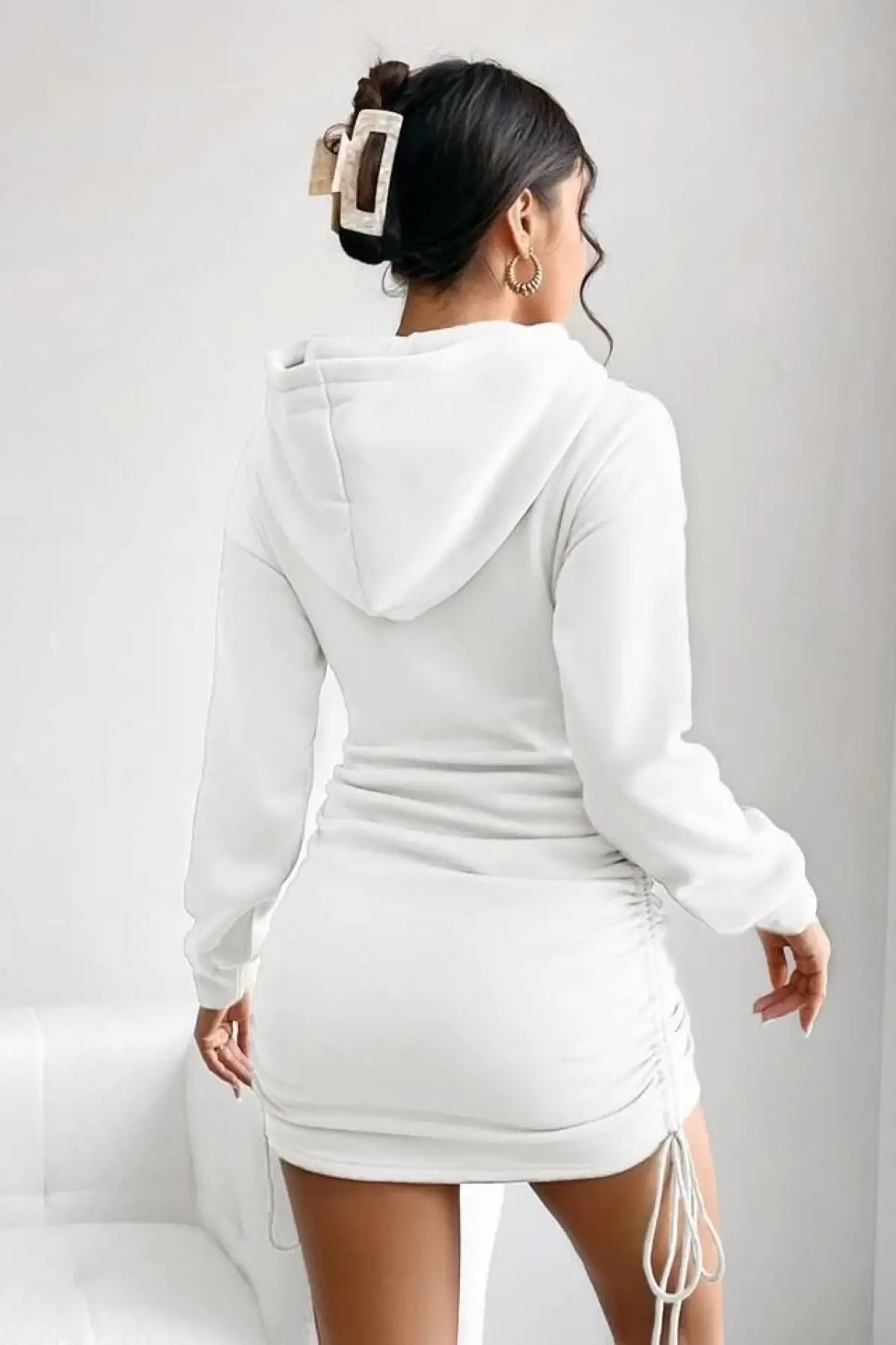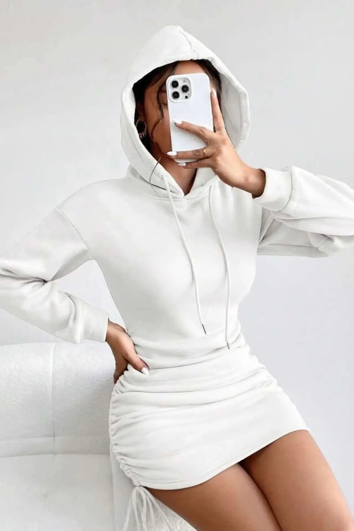 3 İplik Şardonlu Kompact Kapşonlu Elbise Beyaz