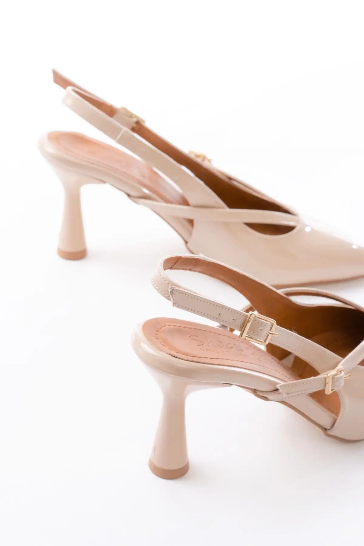 4962 Bej Sivri Burun Tokalı Yuvarlak Topuk Kadın Sandalet