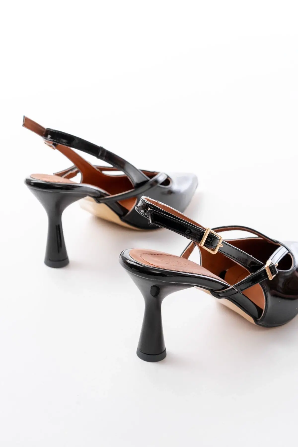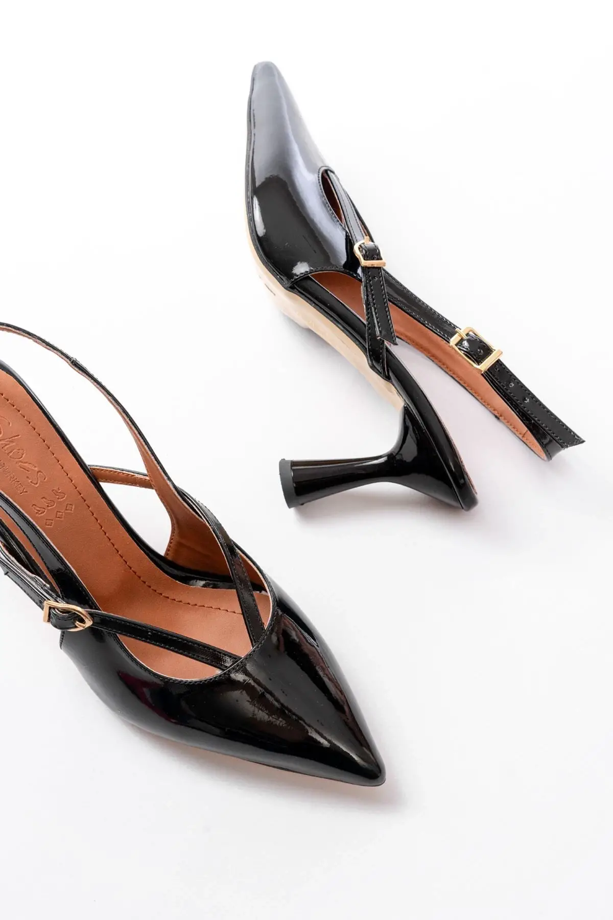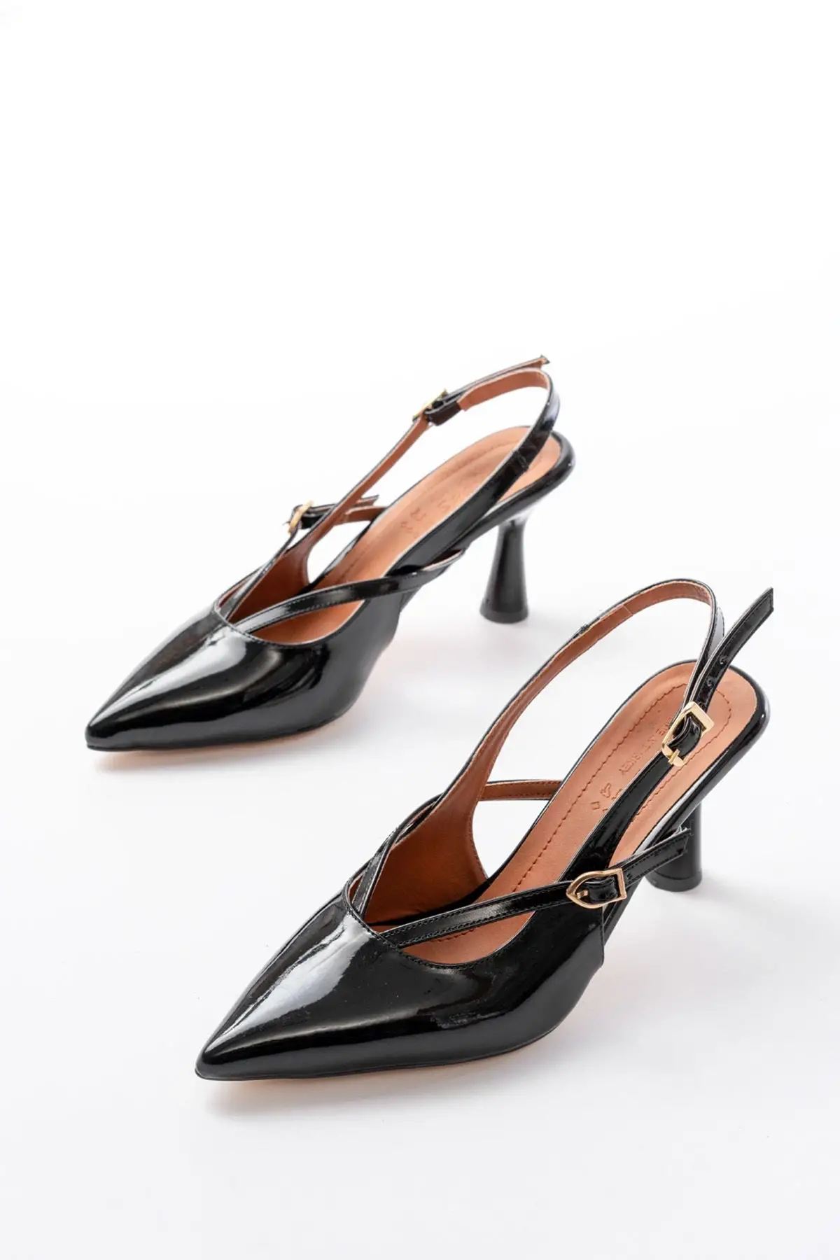 4962 Siyah Rugan Sivri Burun Tokalı Yuvarlak Topuk Kadın Sandalet